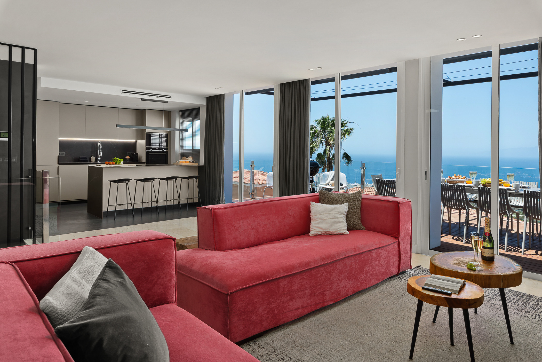 The upper floor houses a spacious lounge with an integrated kitchen, designed to share great moments. From here, you can access a spectacular terrace with open views, perfect for enjoying outdoor dinners and memorable sunsets.