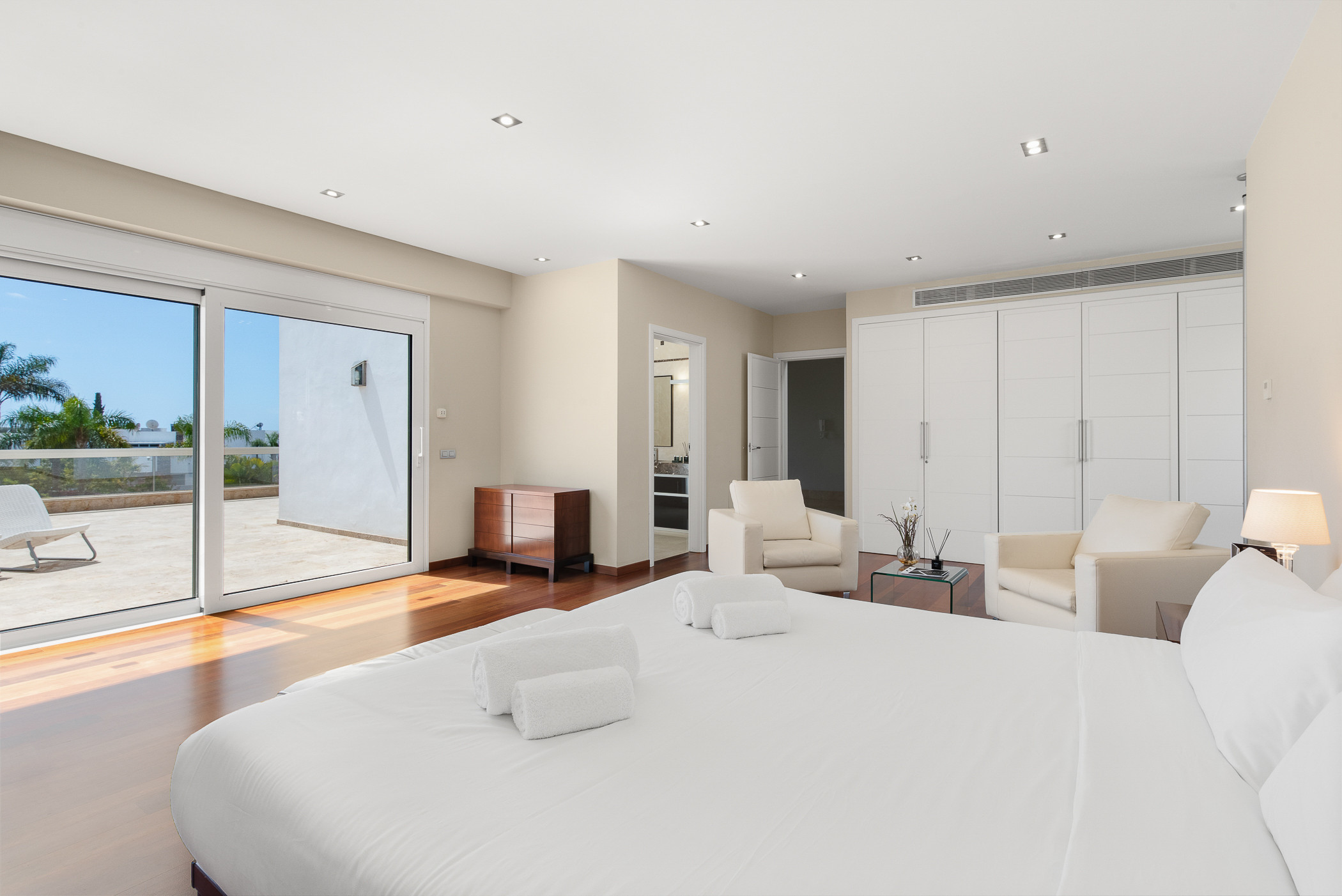 The interior spaces combine contemporary design with cutting-edge technology: Smart TV, fibre optic WiFi, air conditioning, heating and a security system with cameras and safe for your peace of mind.