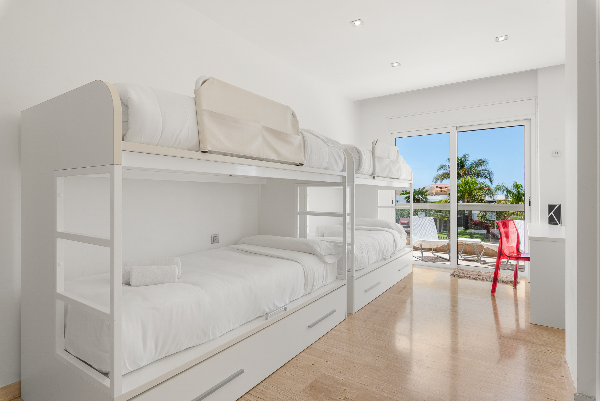 With capacity for 8 people, the villa has 4 carefully designed rooms, including double beds, single beds and bunk beds, all with their own en-suite bathroom, guaranteeing maximum comfort and functionality for groups and families.