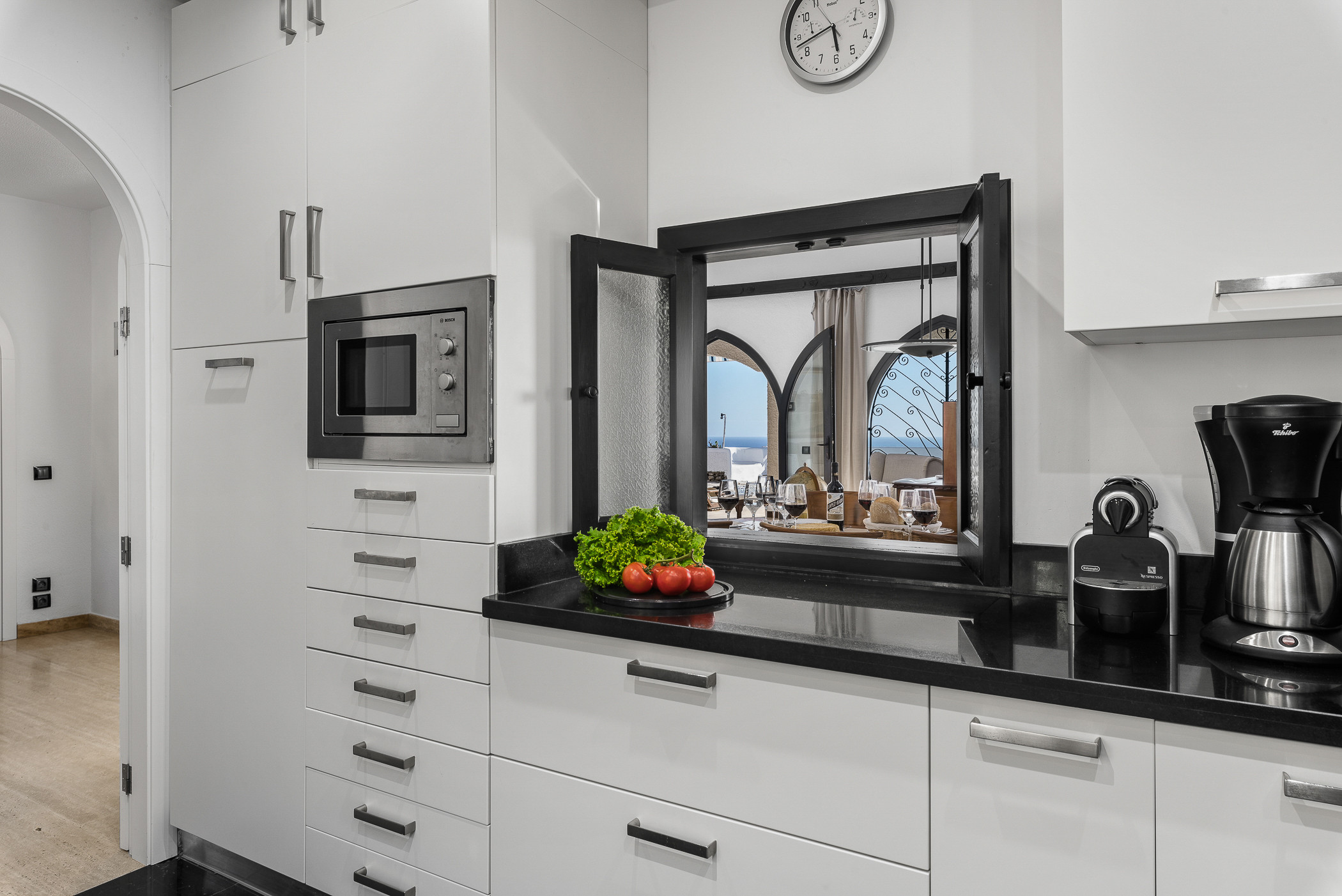 The heart of the villa is its spacious dining room with double-height ceilings, a space flooded with natural light that invites relaxation and enjoyment. The fully equipped kitchen provides you with everything you need to experience local cuisine with freedom and style.