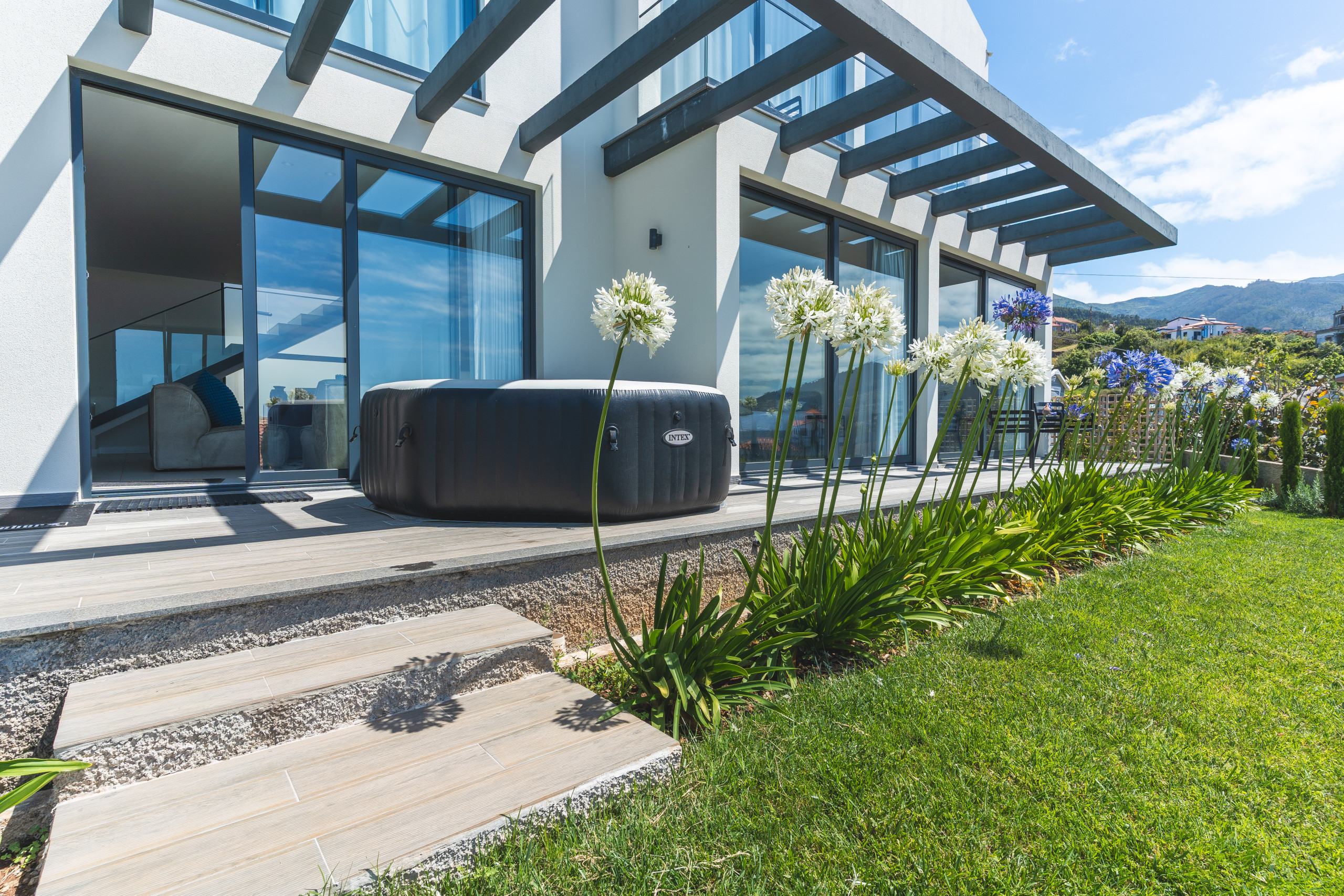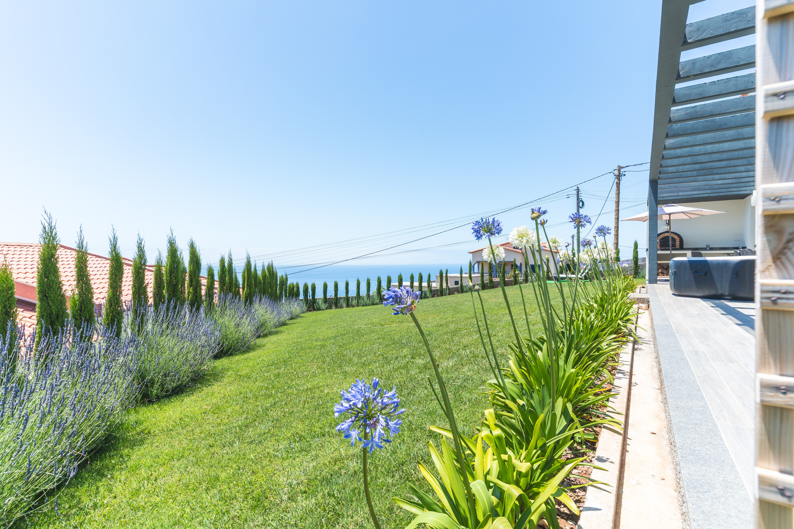The large outdoor area is complete with a jacuzzi, pizza oven, Weber gas barbecue, and outdoor furniture, perfect for outdoor dining and enjoying the stunning sea and mountain views. Please note that guests must purchase their own firewood. A robotic lawnmower maintains the garden and may operate automatically during your stay, it is safe and quiet, and we kindly ask guests not to interfere with it.