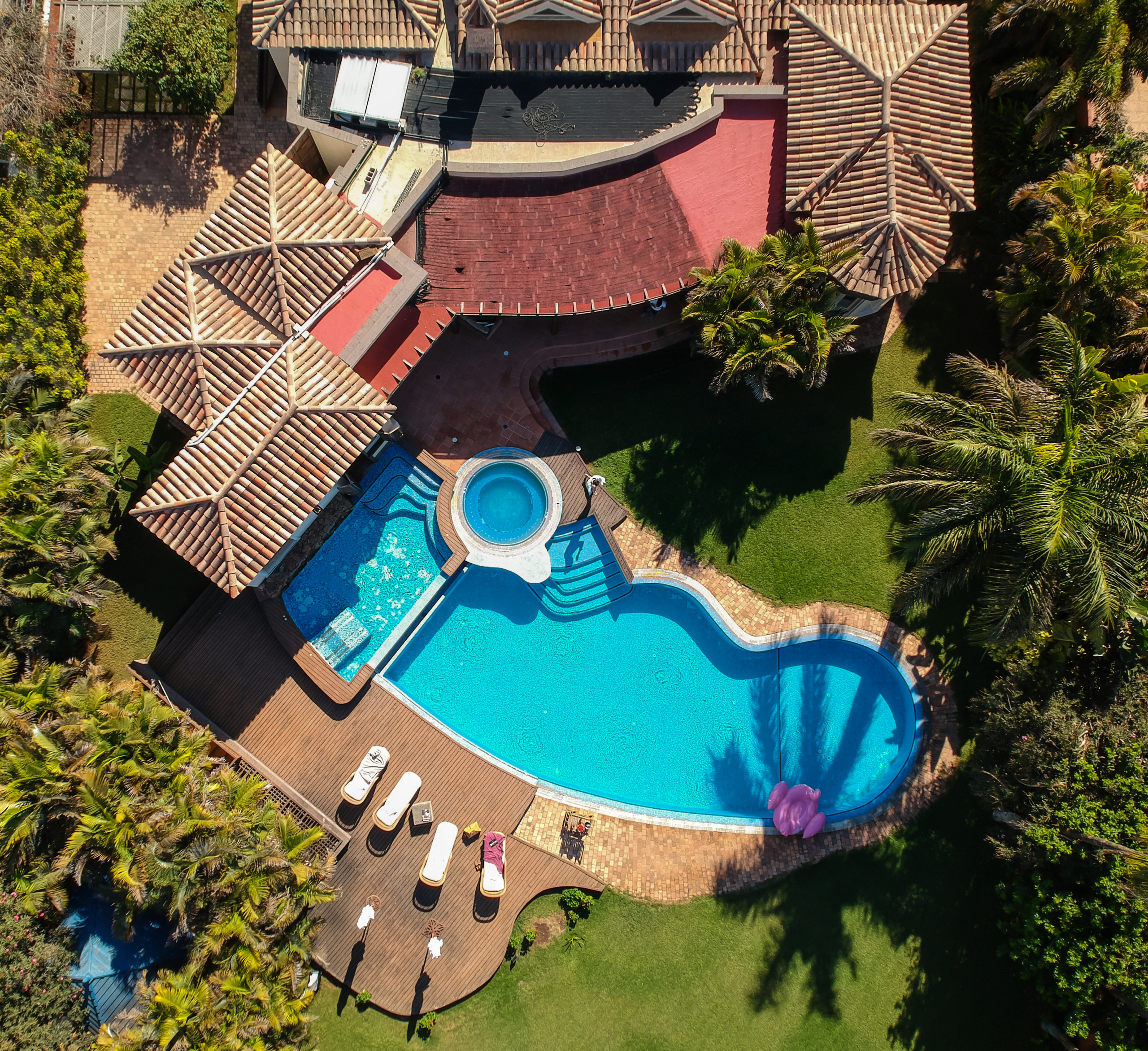 Spectacular private swimming pool with a design divided into three areas: children's, adults', and thalassotherapy, adorned with two waterfalls that spring from the facade.