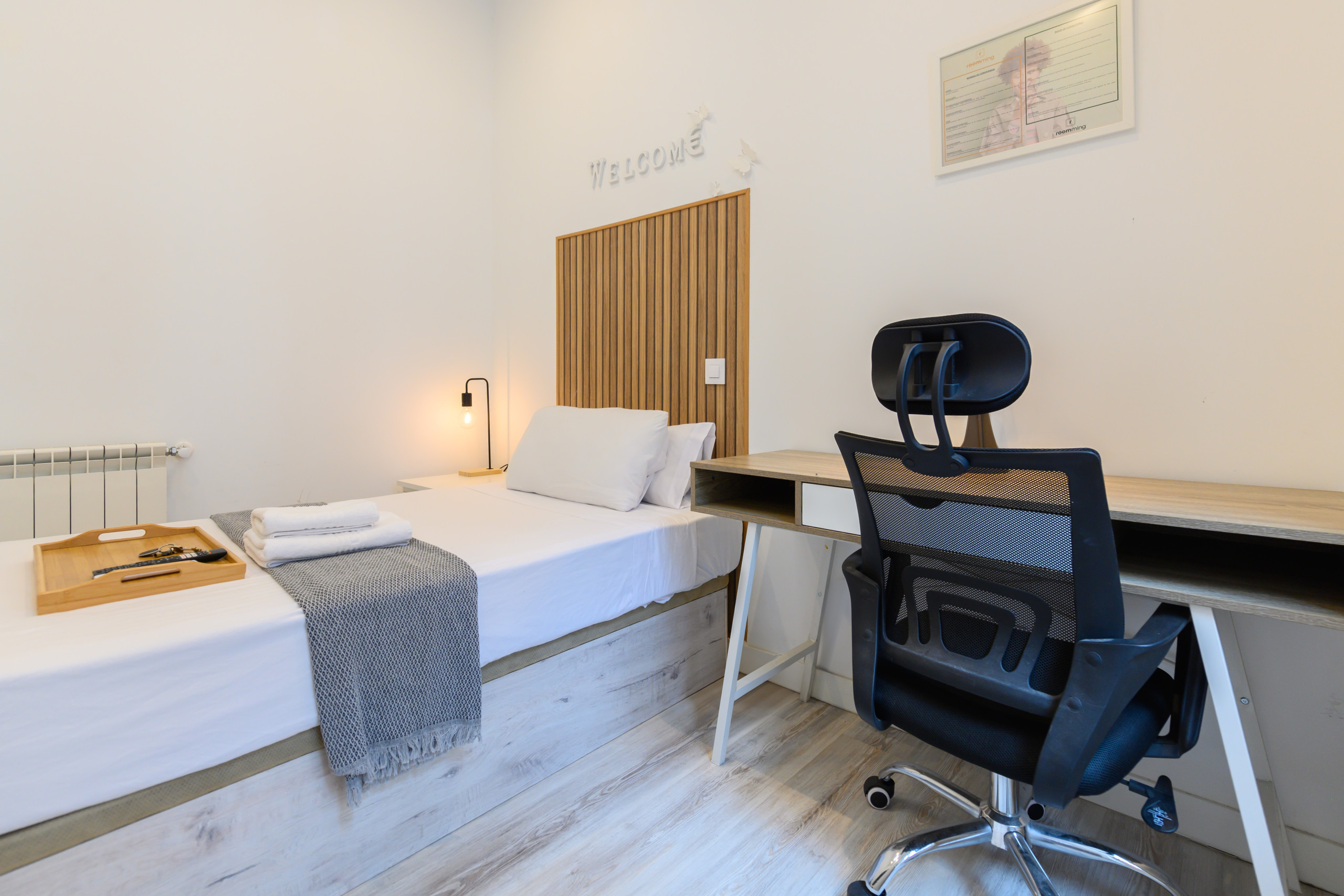 Habitación 2 – Ámsterdam: Habitación premium con balcón, Situada el segundo exterior dentro de la vivienda, cuenta con todas las comodidades, desde la cama con un colchón premium, canapé con gran almacenaje, escritorio + silla, hasta smart TV, climatización, caja fuerte plancha+tabla, cargador inalámbrico, cerradura inteligente, 2 juegos de toallas y sábanas.