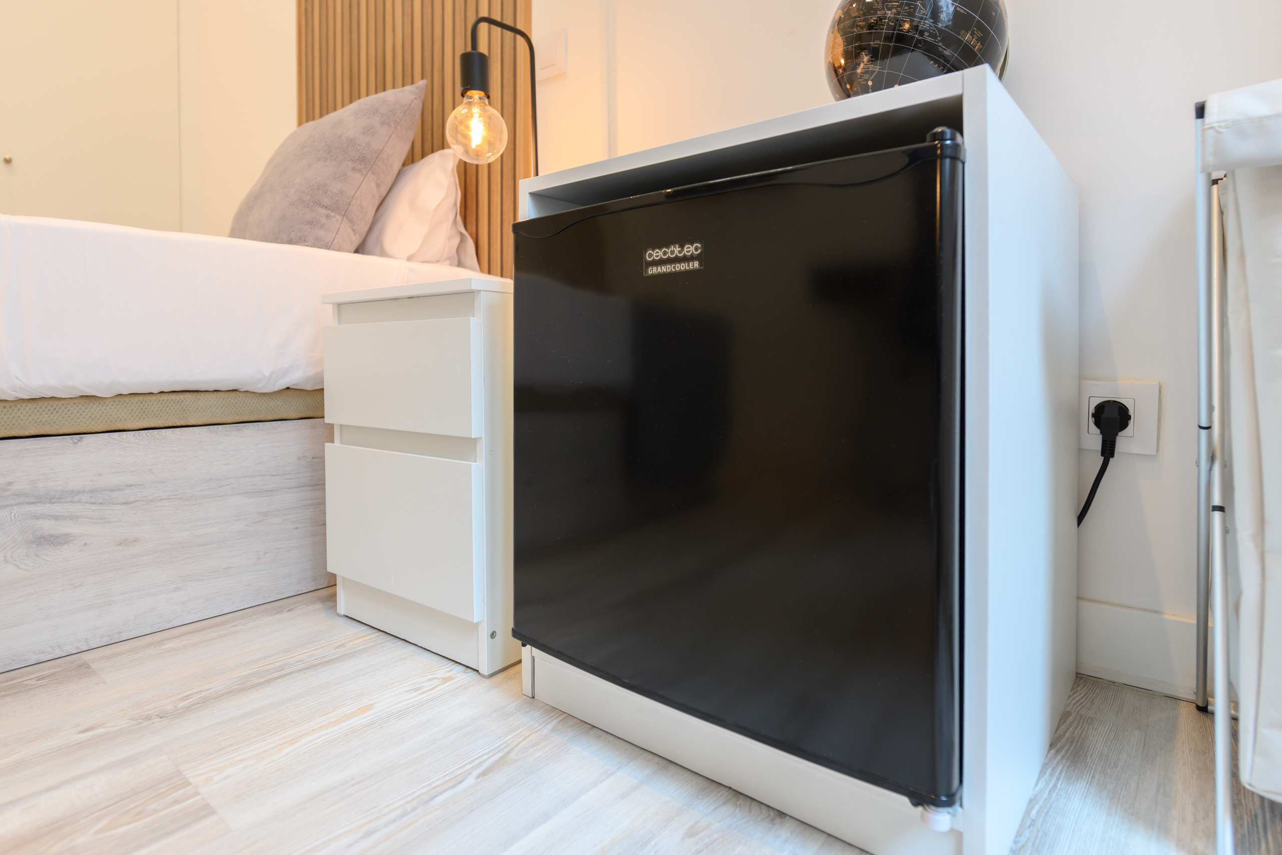 Habitación 3 –Barcelona: Habitación premium, con balcón. Situada la tercera exterior dentro de la vivienda, cuenta con todas las comodidades, desde la cama con un colchón premium, canapé con gran almacenaje, escritorio + silla, hasta smart TV, climatización, caja fuerte, fuerte plancha+tabla, cargador inalámbrico, cerradura inteligente, 2 juegos de toallas y sábanas.