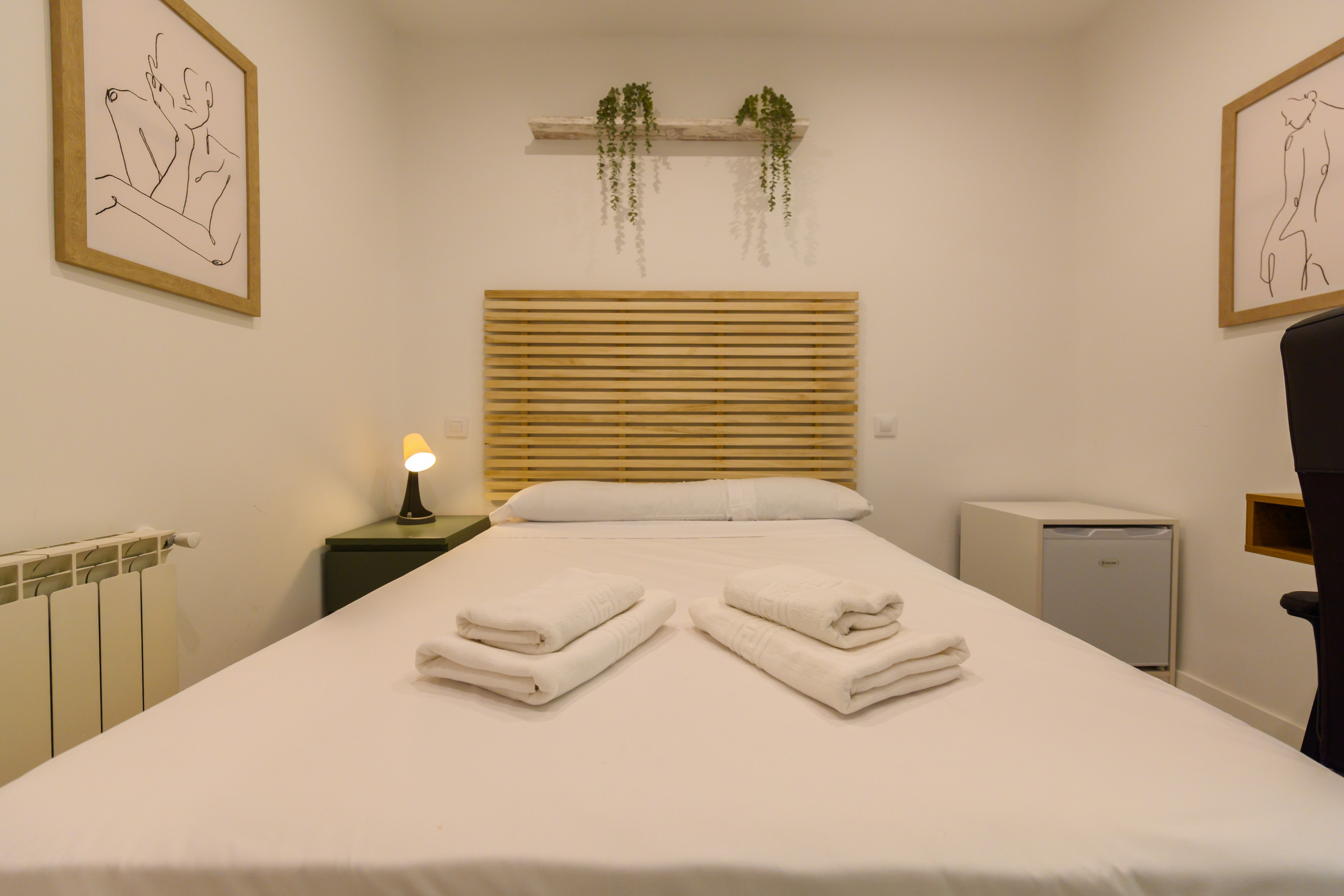 Habitación 4–La Paz: Habitación con vistas, dentro de la vivienda Hogar de Belén, alquiler Temporal Situada en la primera planta, cuenta con todas las comodidades que todo estudiante puede demandar. Desde la cama con un colchón premium, canapé con gran almacenaje, escritorio + silla, hasta smart TV, climatización, caja fuerte, plancha+tabla, cargador inalámbrico, cerradura inteligente, 2 juegos de toallas y sábanas.