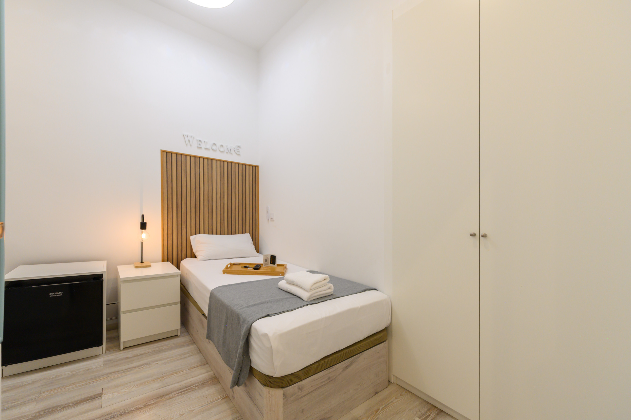 Piso de alquiler Temporal. Habitación 9 – Singapur: Habitación boutique. Cuenta con todas las comodidades, desde la cama con un colchón premium, canapé con gran almacenaje, escritorio + silla, hasta smart TV, climatización, caja fuerte, plancha+tabla, cargador inalámbrico, cerradura inteligente, 2 juegos de toallas y sábanas.
