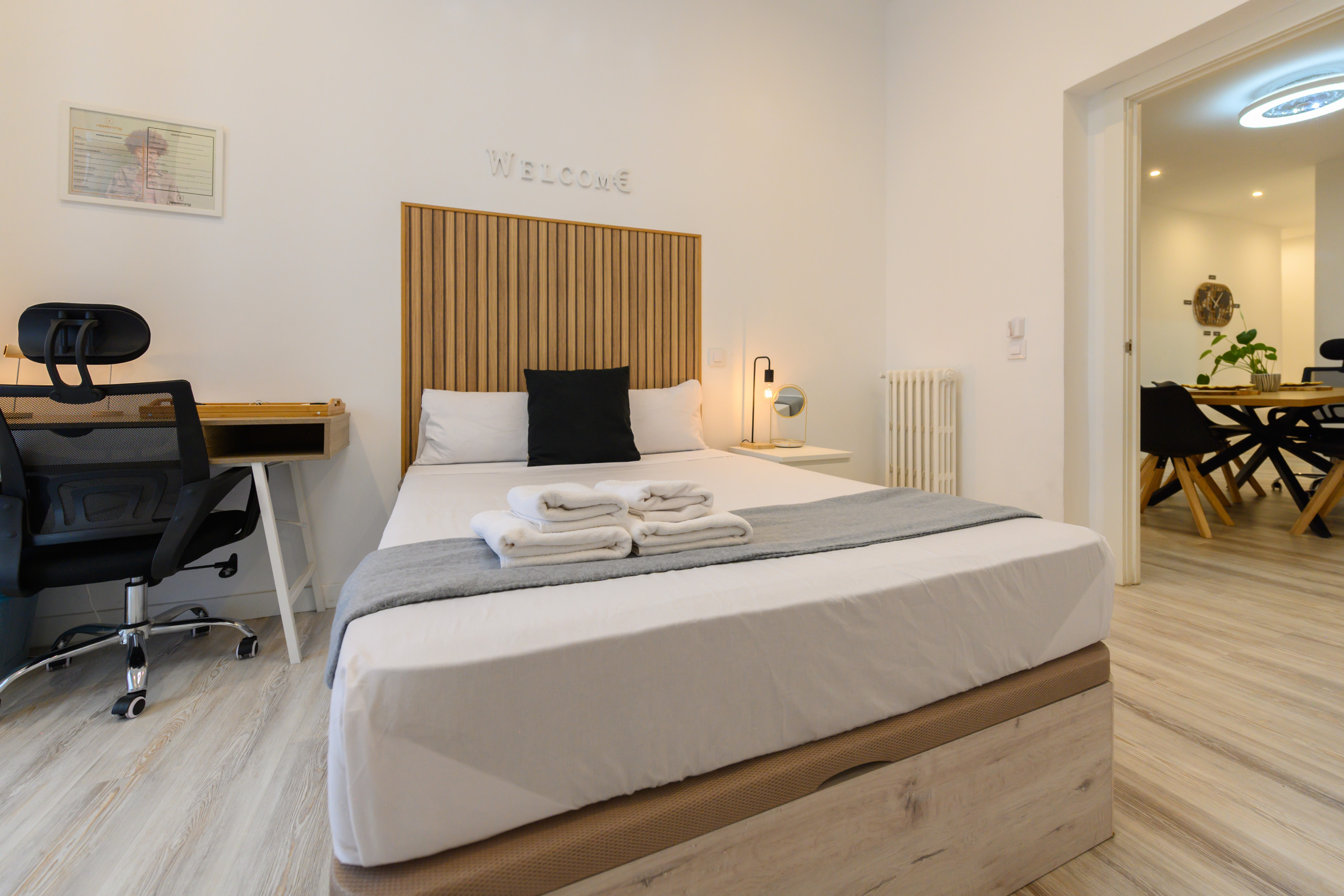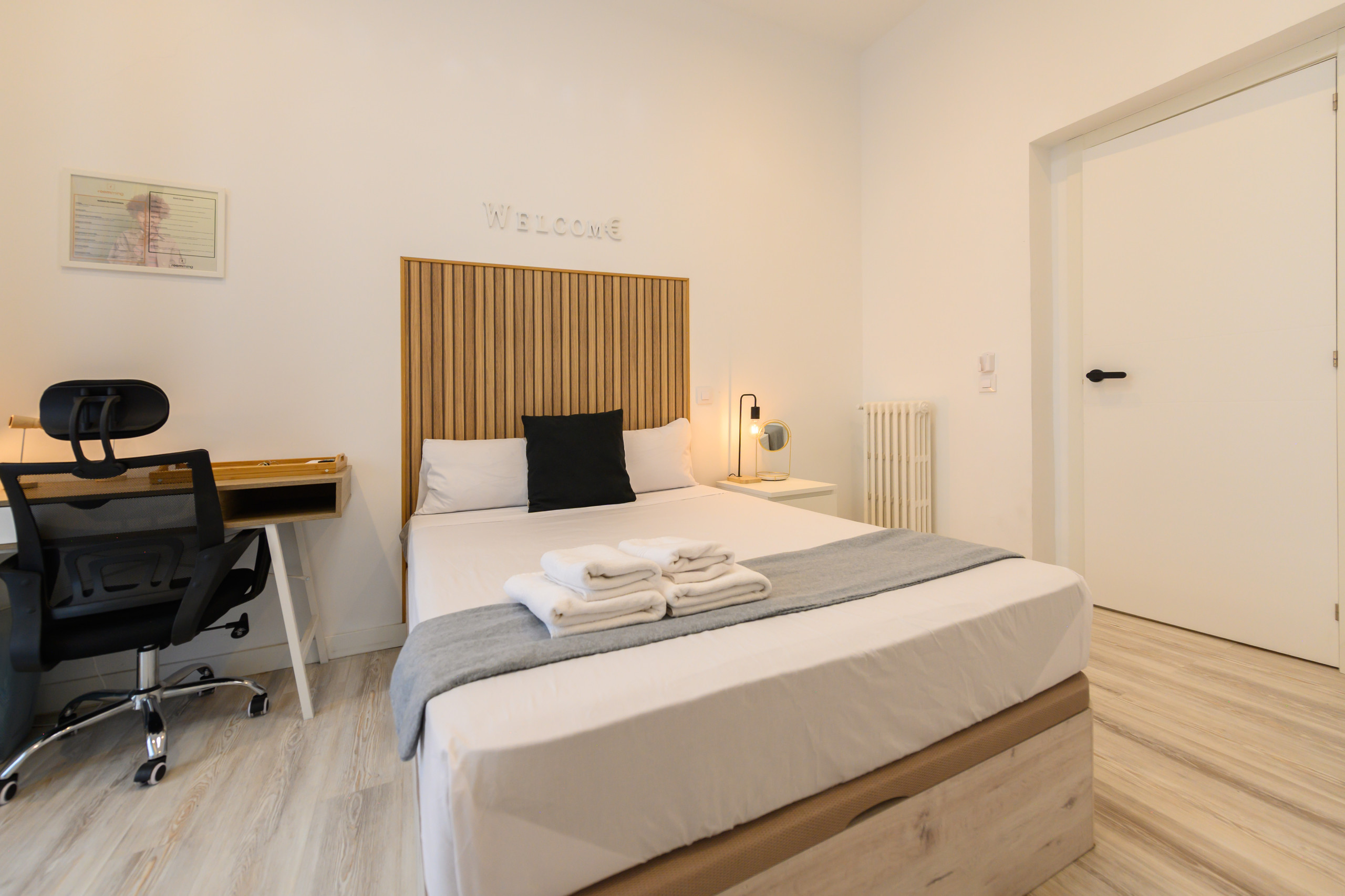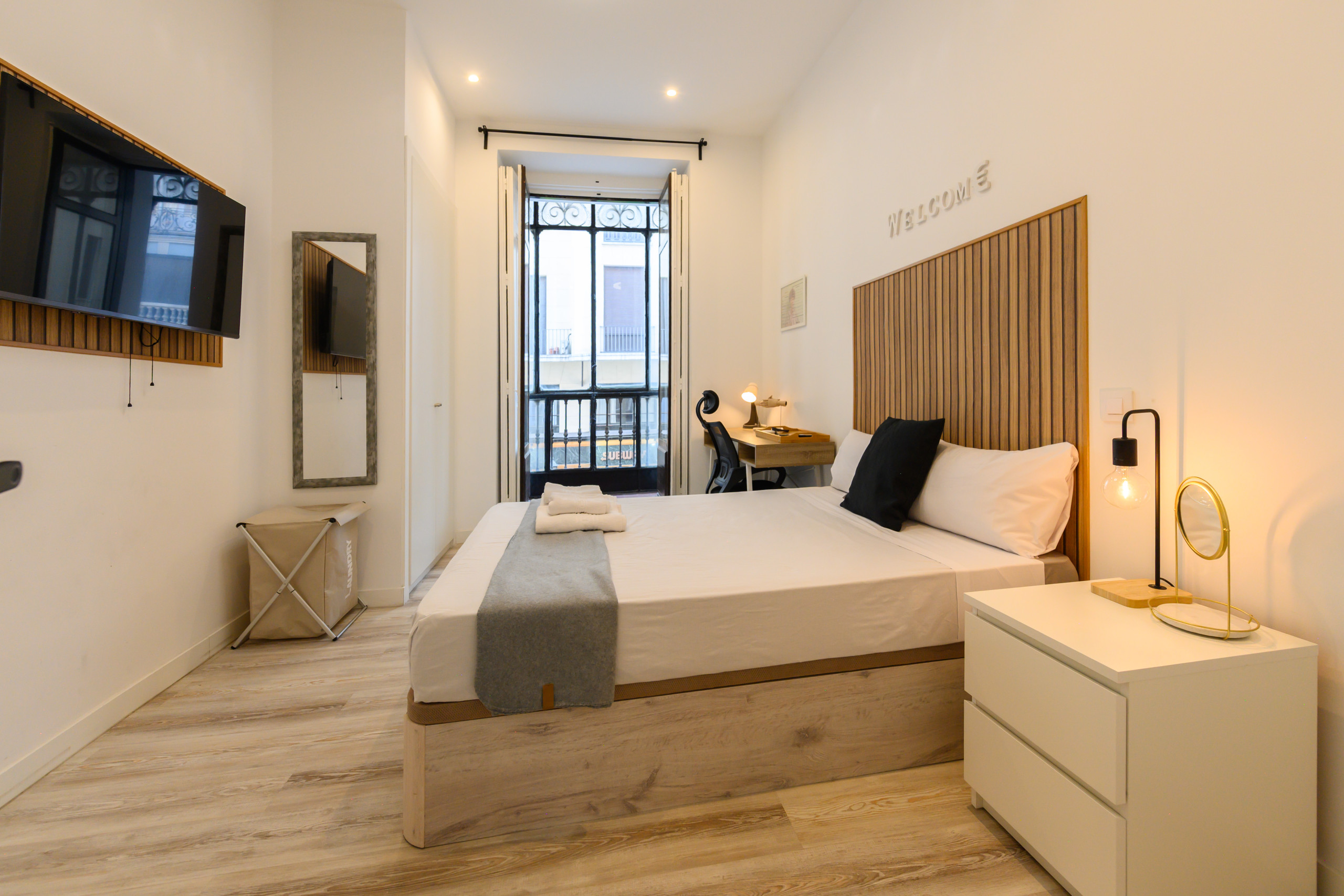 Piso de alquiler Temporal. Habitación 5 – Zurich: Habitación VIP PREMIUM con balcón acristalado, con vistas, . Situada la quinta exterior dentro de la vivienda, cuenta con todas las comodidades,desde la cama con un colchón premium, canapé con gran almacenaje, escritorio + silla, hasta smart TV, climatización, caja fuerte, plancha+tabla, cargador inalámbrico, cerradura inteligente, 2 juegos de toallas y sábanas.