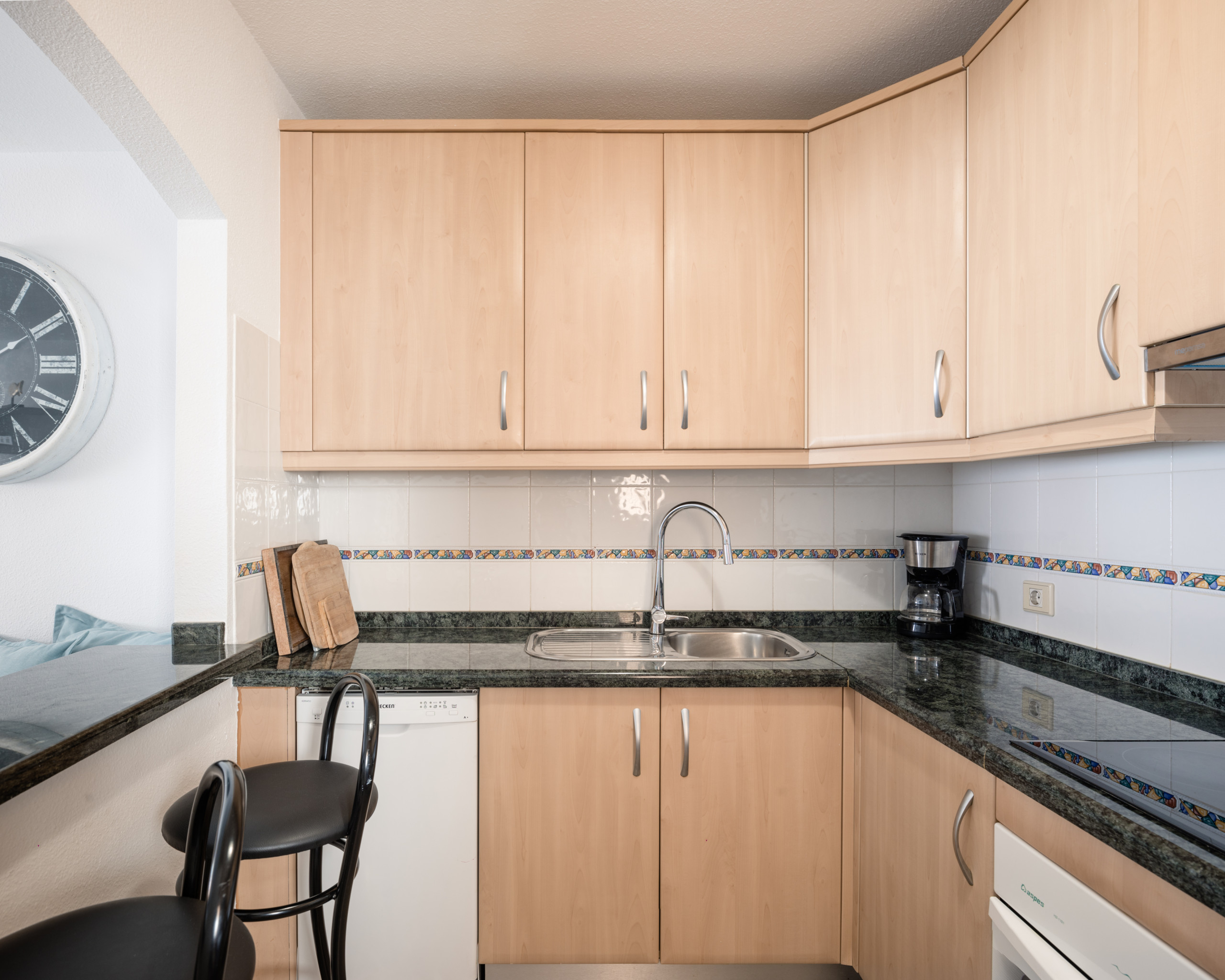 Cocina nueva, completamente equipada, con hervidor, cafetera, microondas, horno. El salón cuenta con un sofá cama. Además cuenta con una bonita terraza.