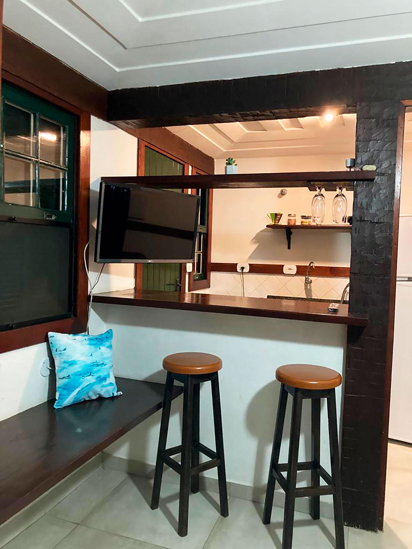 - Balcão para refeição com 2 bancos e banco fixo na parede para 3 pessoas