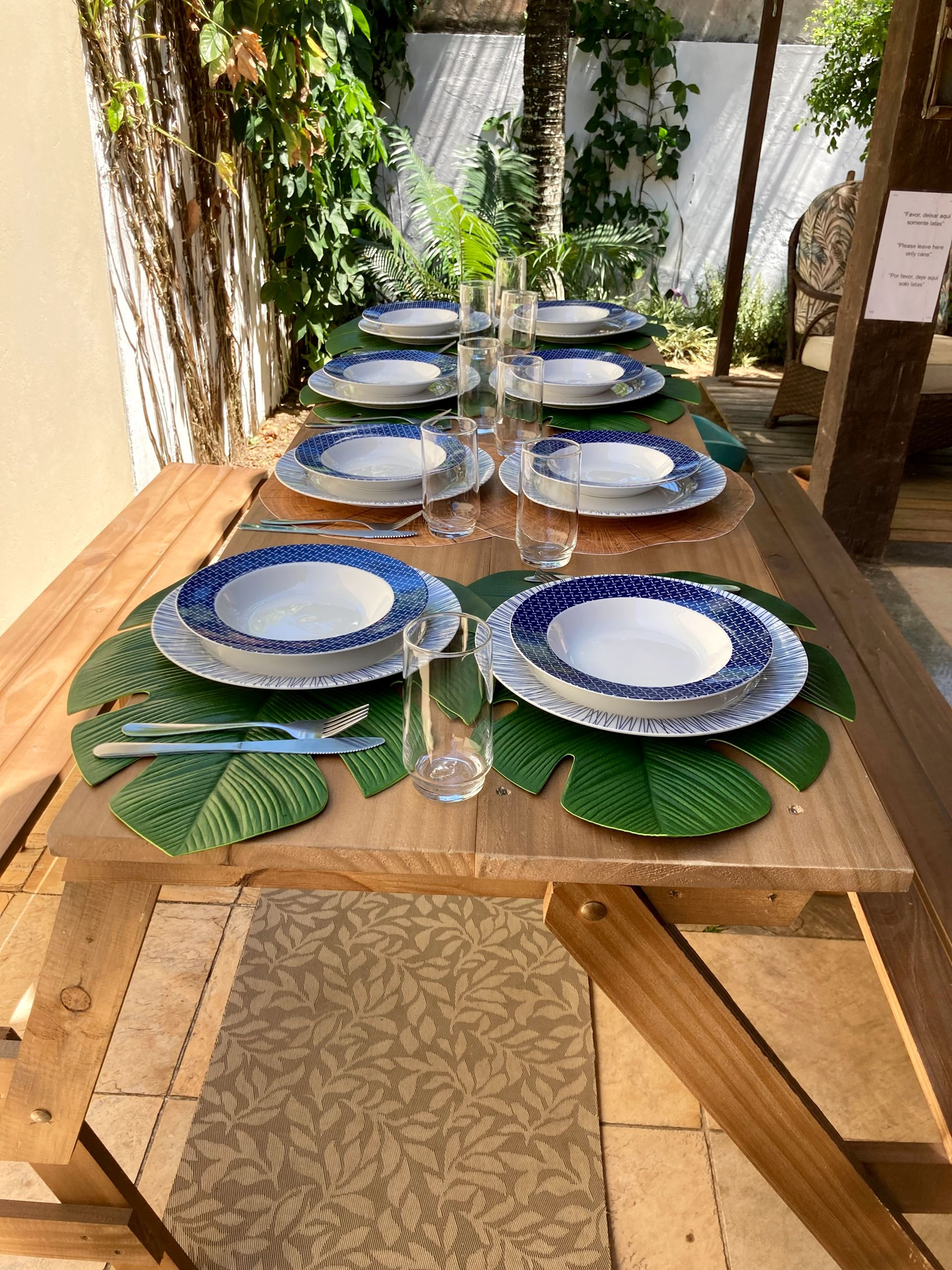 - Mesa de jantar com 8 lugares e bancada com cooktop na área gourmet