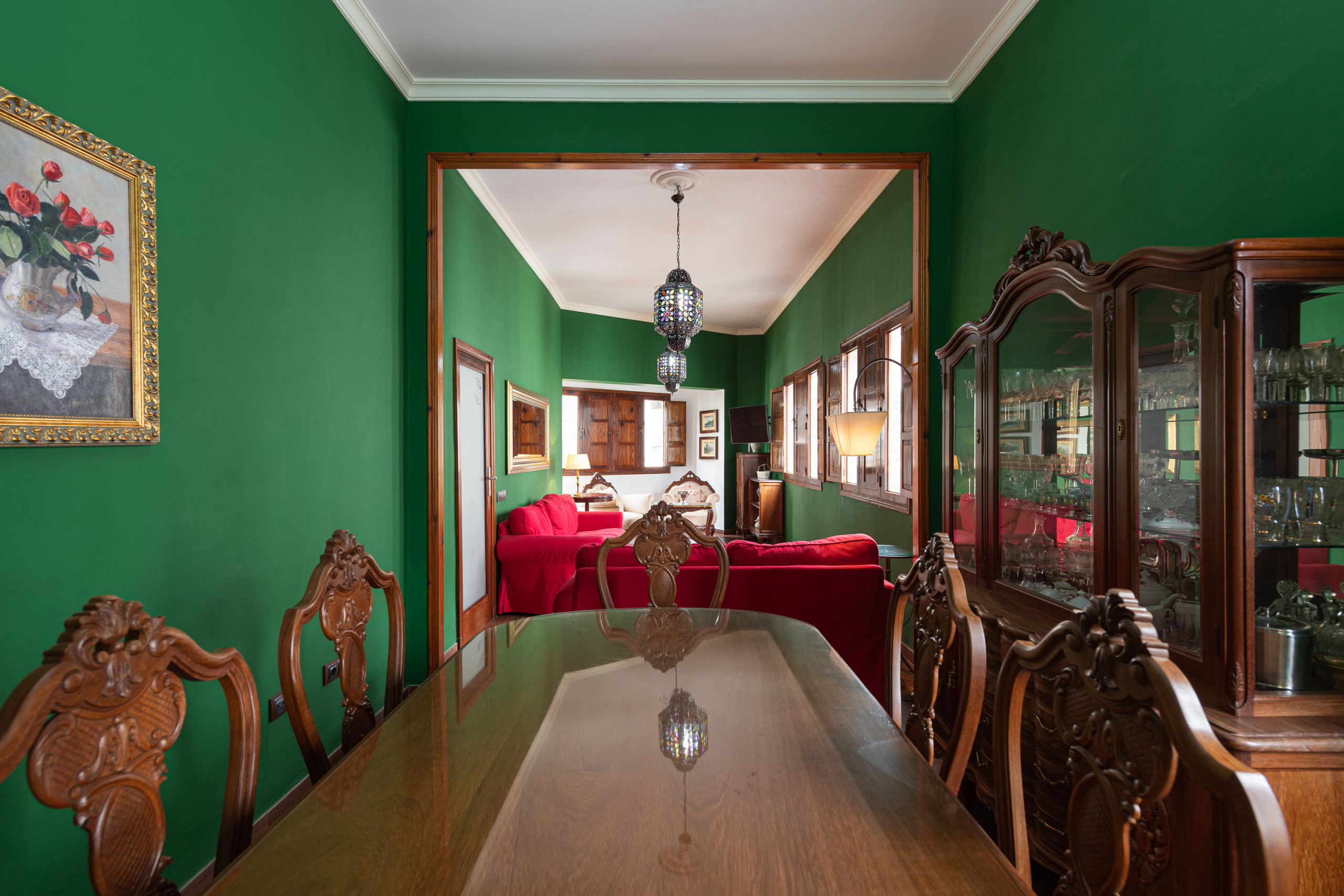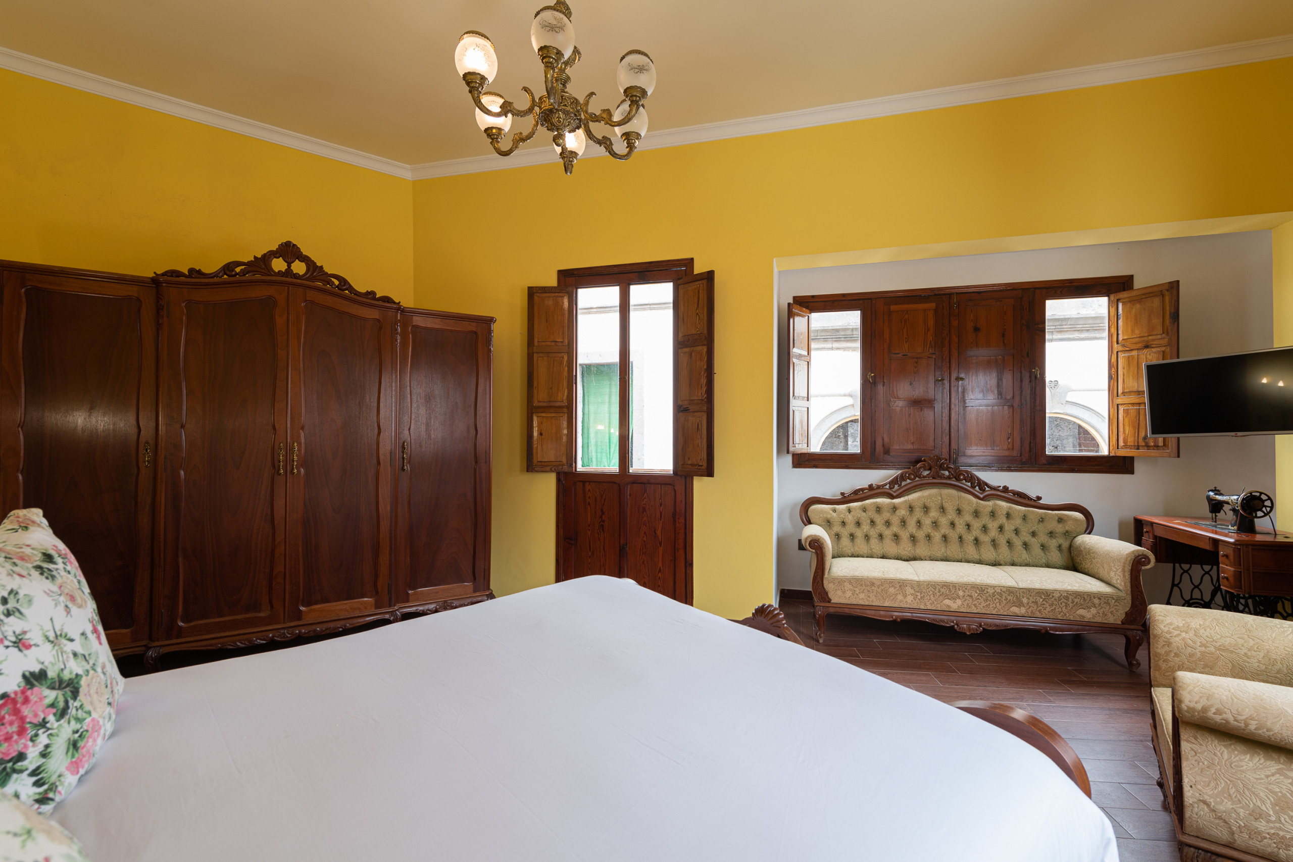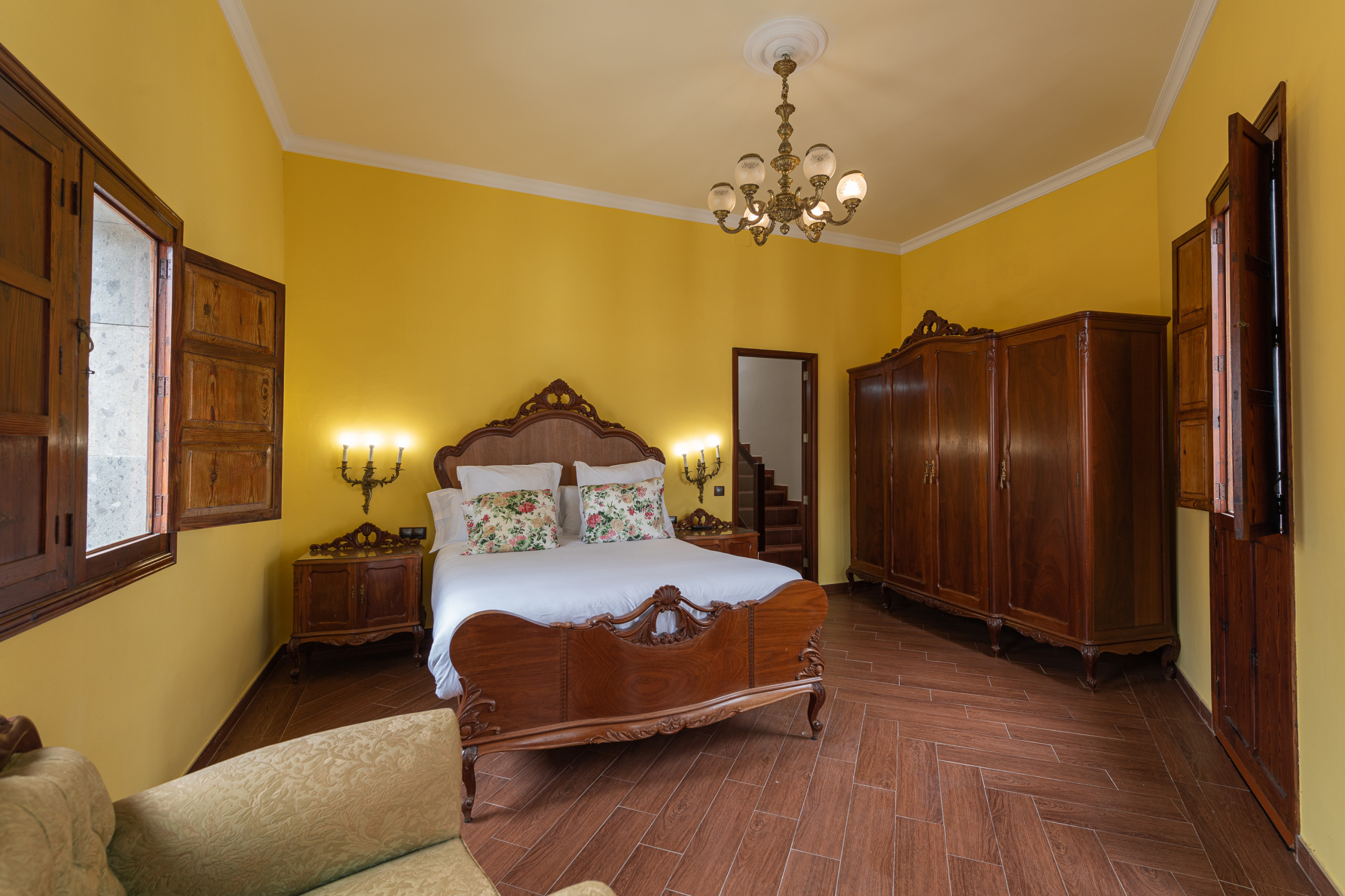 La habitación principal, con una cama de matrimonio, decorada con un elegante estilo colonial, mucha luz natural y un pequeño balcón con vistas encantadoras.