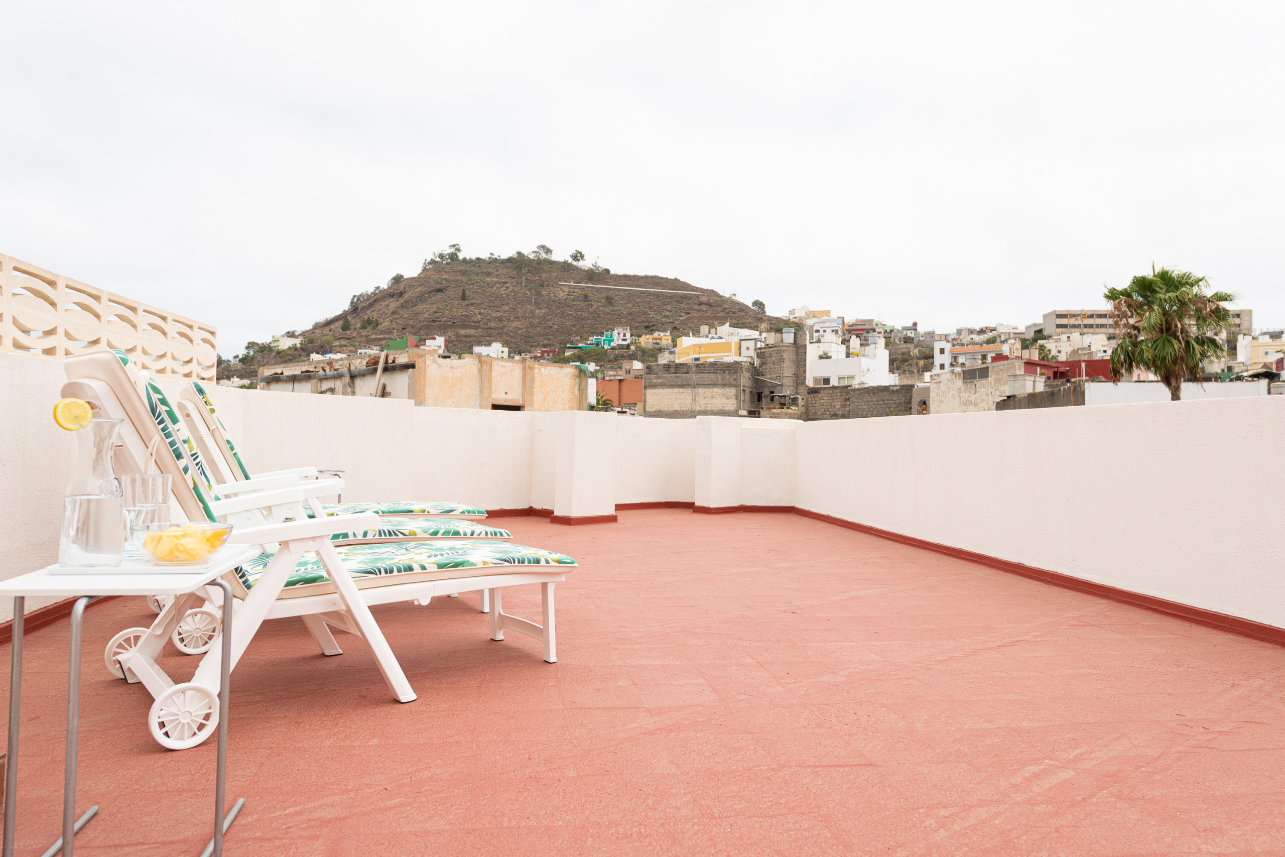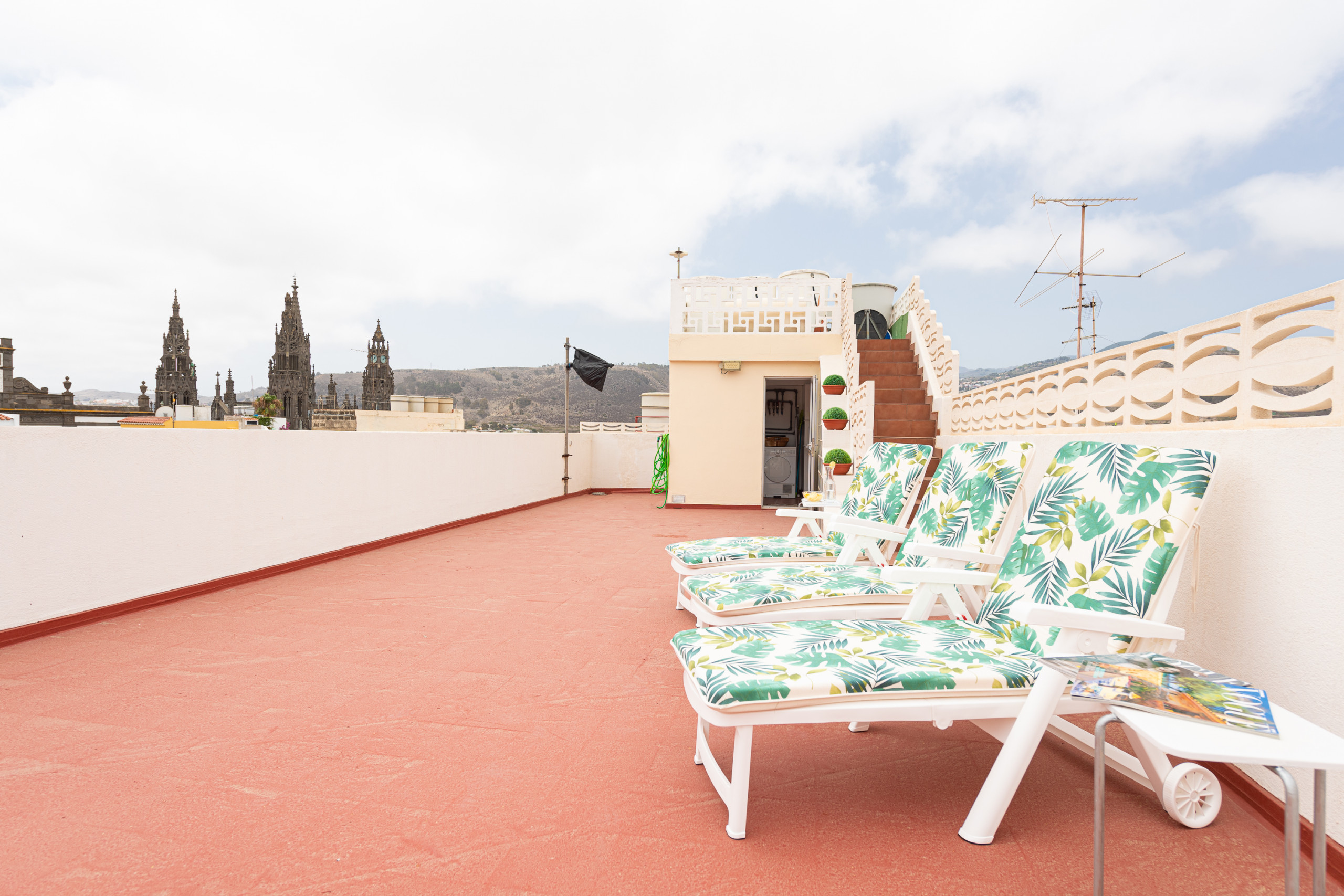 Una espectacular terraza privada equipada con hamacas, donde podrá relajarse mientras disfruta de unas impresionantes vistas panorámicas a la Catedral, las montañas y la ciudad de Arucas.