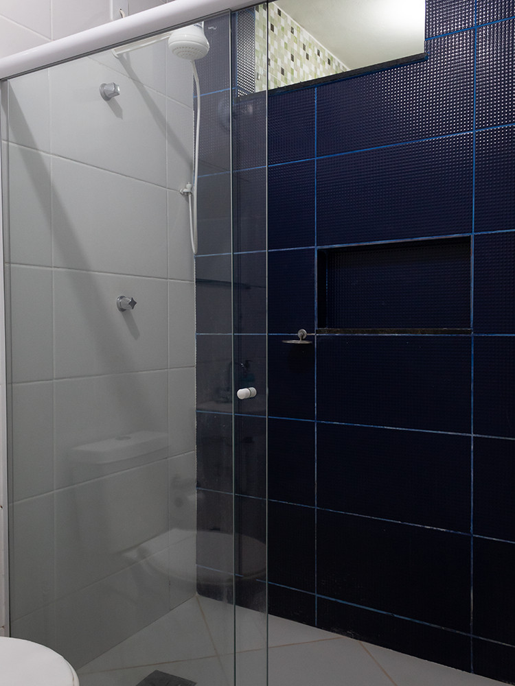 - Banheiro com chuveiro, box de vidro / acrílico e espelho