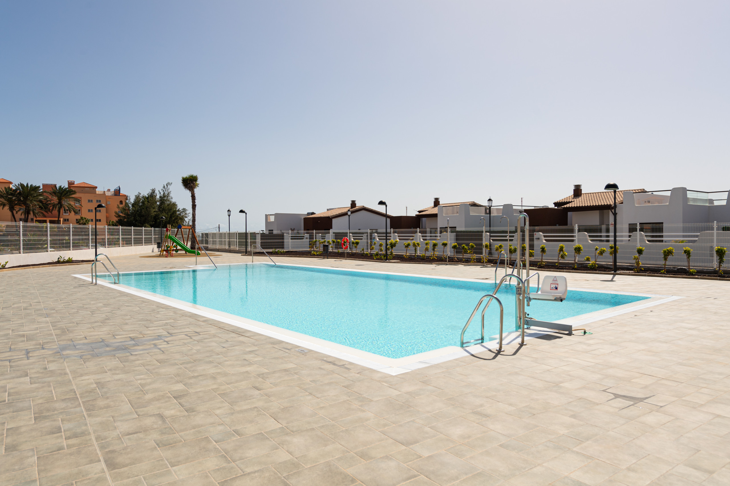 El residencial cuenta con amplias zonas comunes, piscina comunitaria y ascensor, facilitando una estancia cómoda y sin preocupaciones.