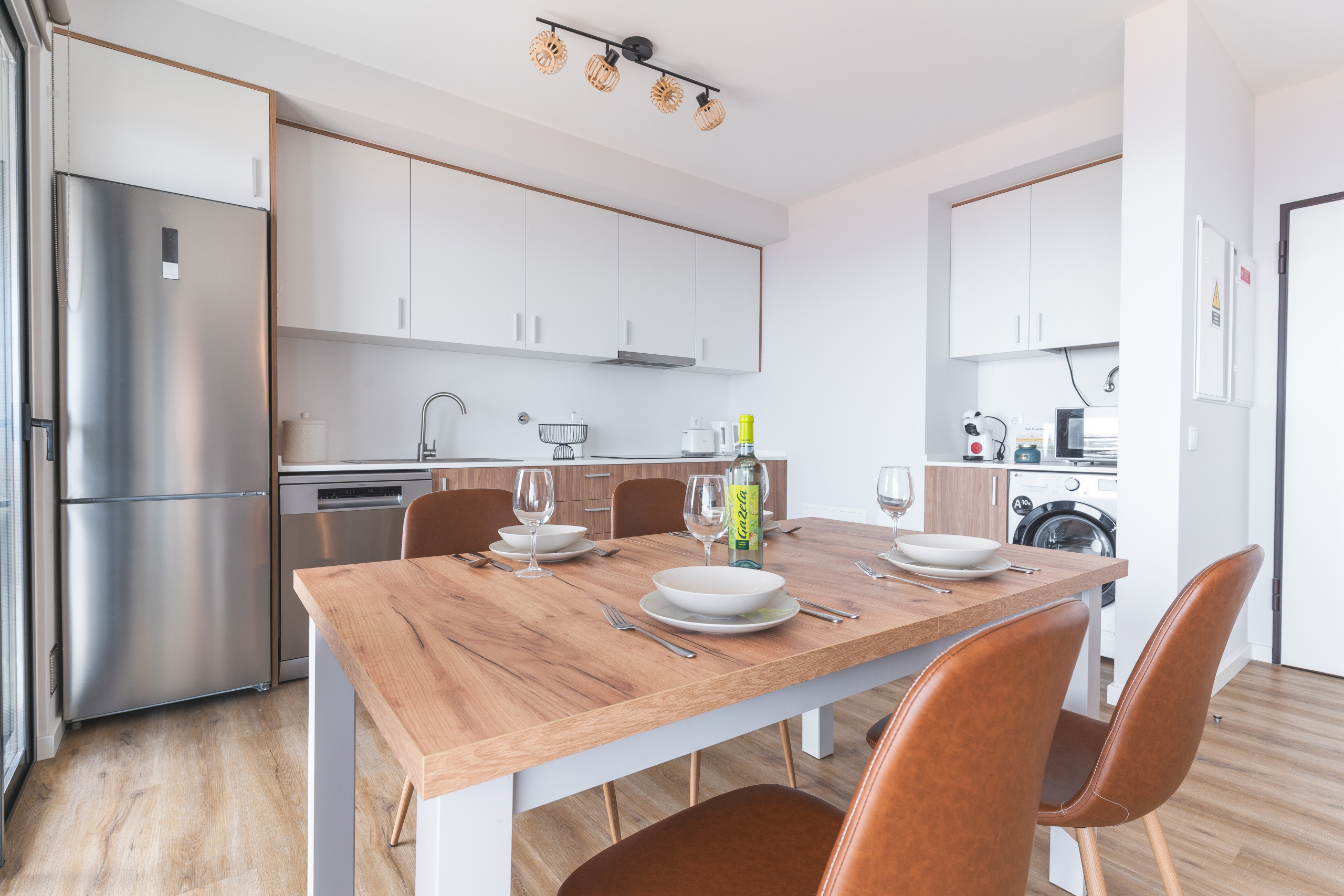 Incluye un dormitorio con cama queen-size y un sofá cama en el salón. Tiene dos baños: uno con ducha y otro como aseo adicional. La cocina está equipada con frigorífico, congelador, horno, microondas, vitrocerámica, lavavajillas, cubiertos, platos y utensilios básicos. También hay lavadora y secador de pelo.