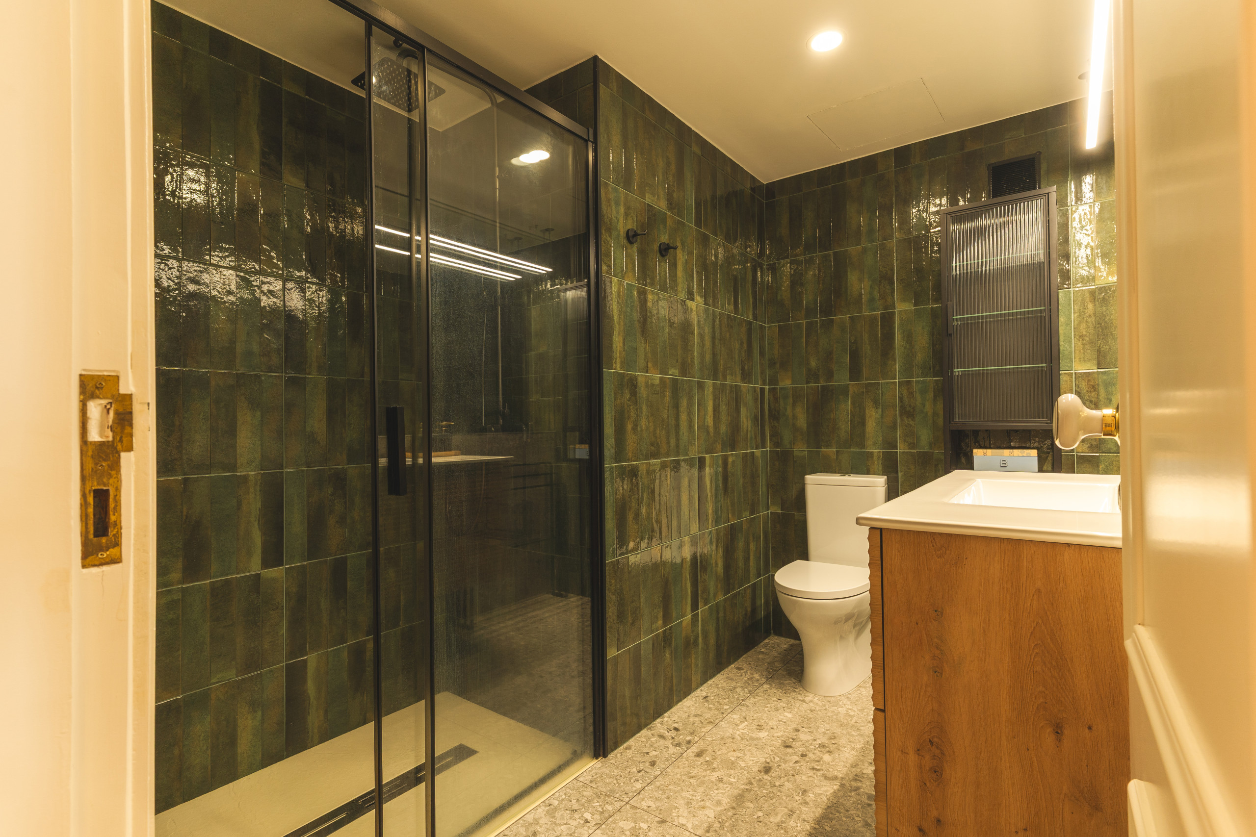 El apartamento tiene dos baños, uno de los cuales está en suite en el dormitorio principal, ambos con ducha. La cocina está completamente equipada con electrodomésticos esenciales como nevera, congelador, horno, microondas, fogones, cubiertos, platos y otros utensilios necesarios para cocinar. También dispone de lavadora y secador de pelo para mayor comodidad.