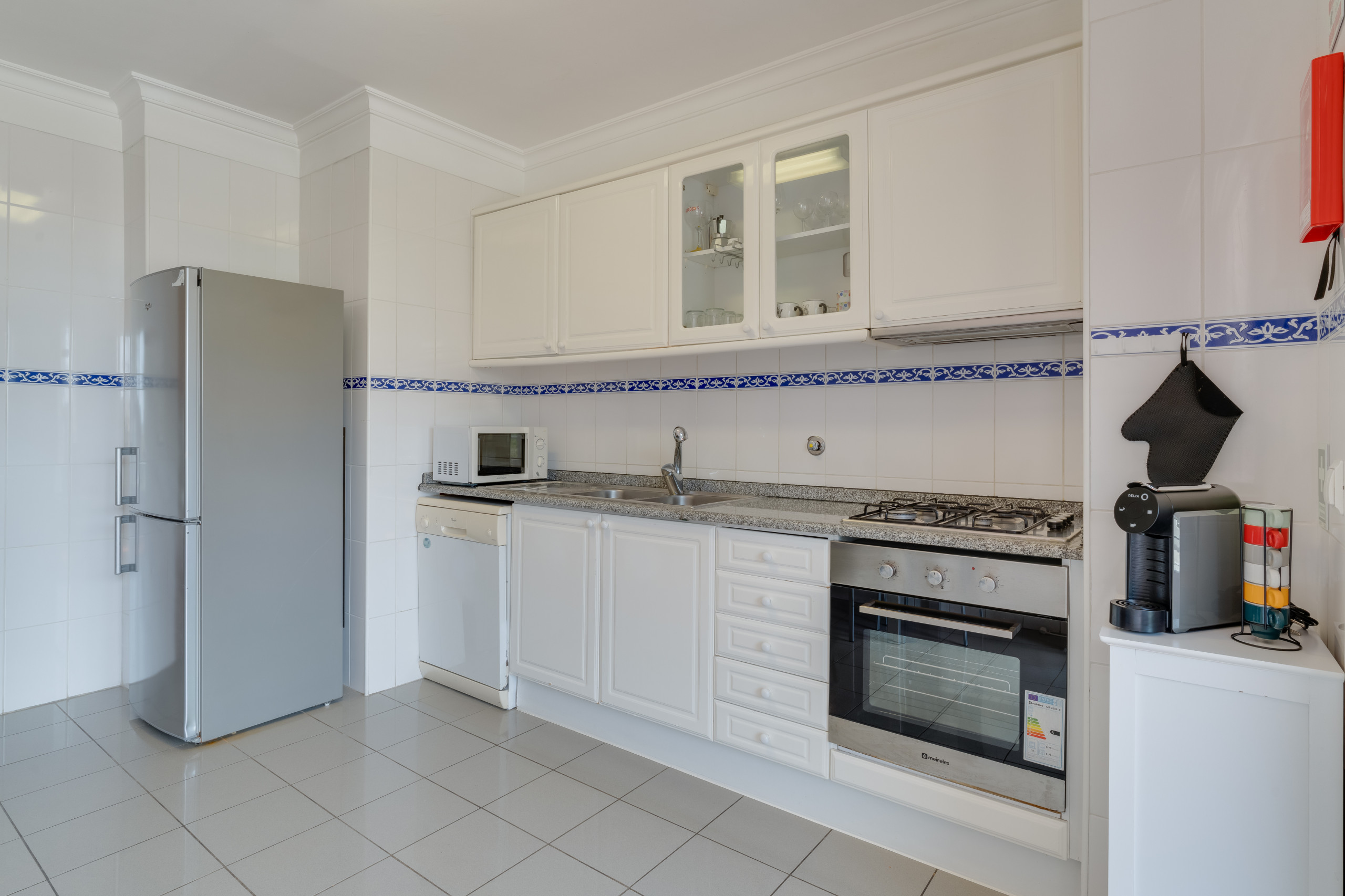 El apartamento cuenta con tres dormitorios confortables: dos con camas queen-size y uno con dos camas individuales. Hay dos baños, uno con bañera para un relajante baño y otro con ducha para una rápida refrescada.