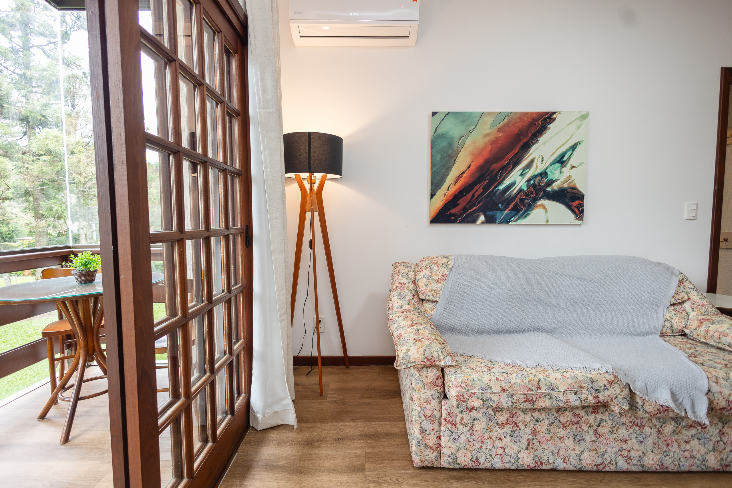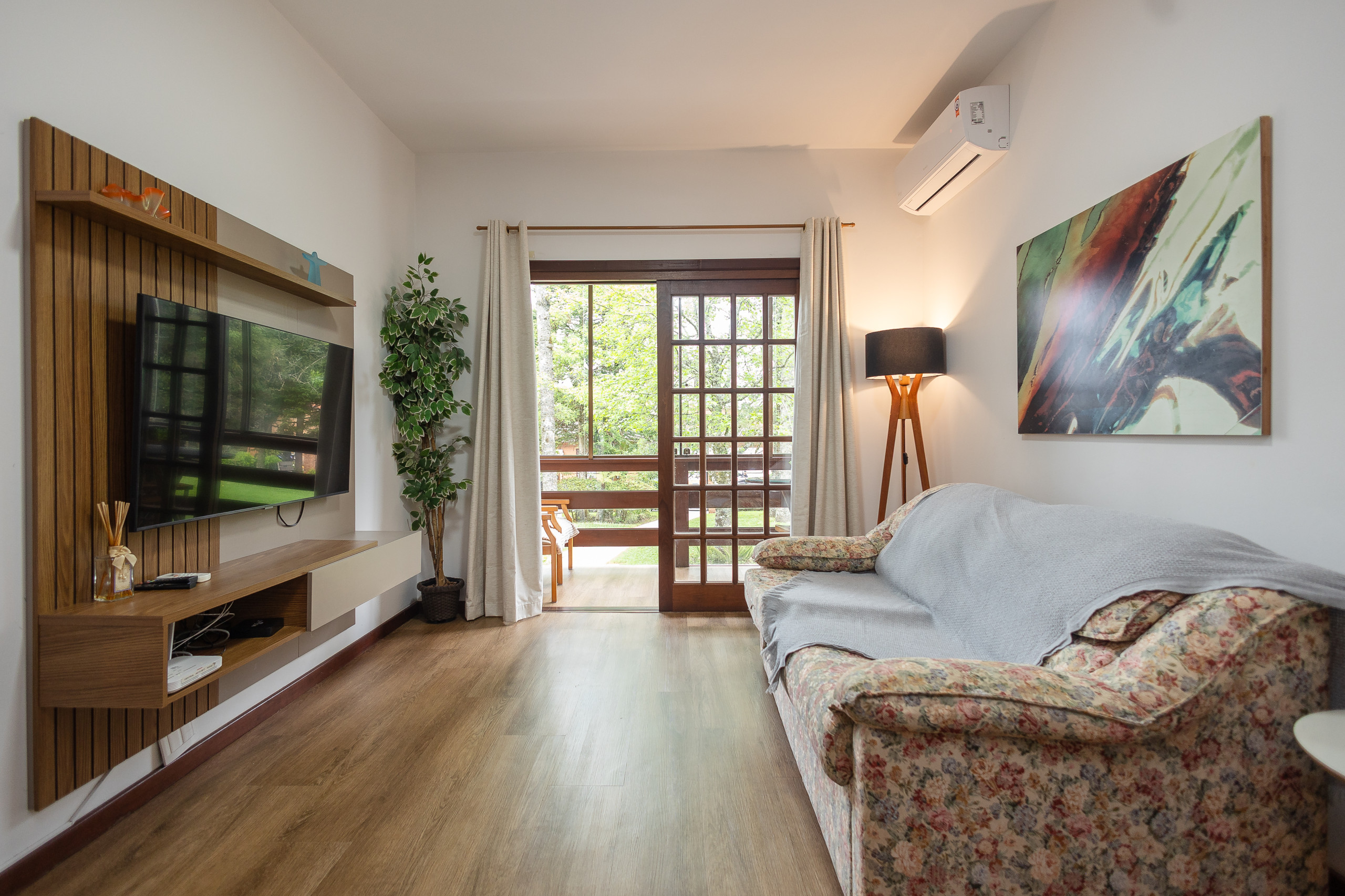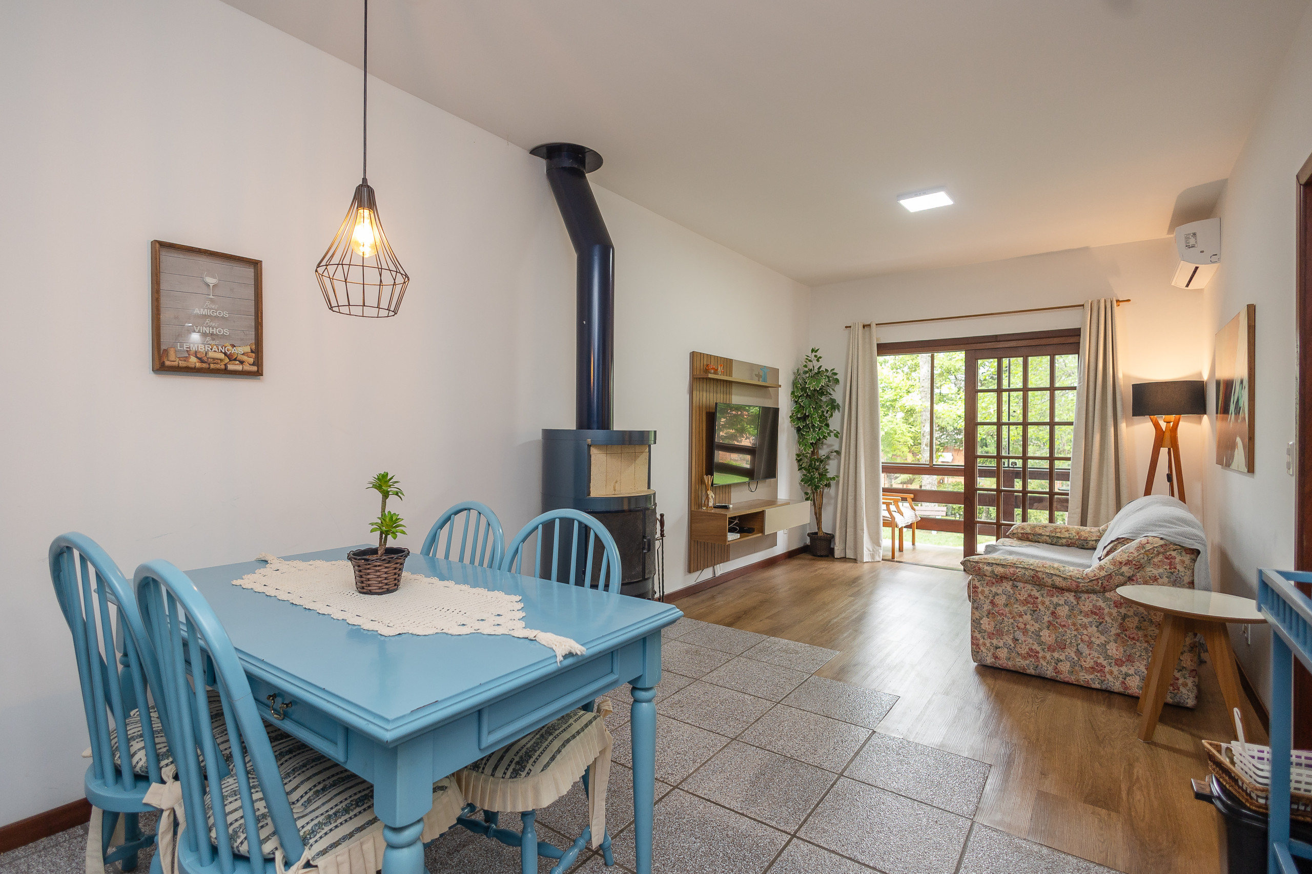 Insertado en un condominio arbolado y tranquilo, el inmueble cuenta con un dormitorio, baño social, cocina equipada, filtro de agua, barbacoa, sala con dos ambientes (estar y comedor), sofá-cama, wi-fi de alta velocidad, smart TV, calefactor chileno, balcón, ajuar completo y un espacio de estacionamiento. En la mesa podrán sentarse hasta 06 personas para una cena o un juego de cartas y el balcón permite contemplar el jardín mientras se disfruta de un vino o un chimarrão.