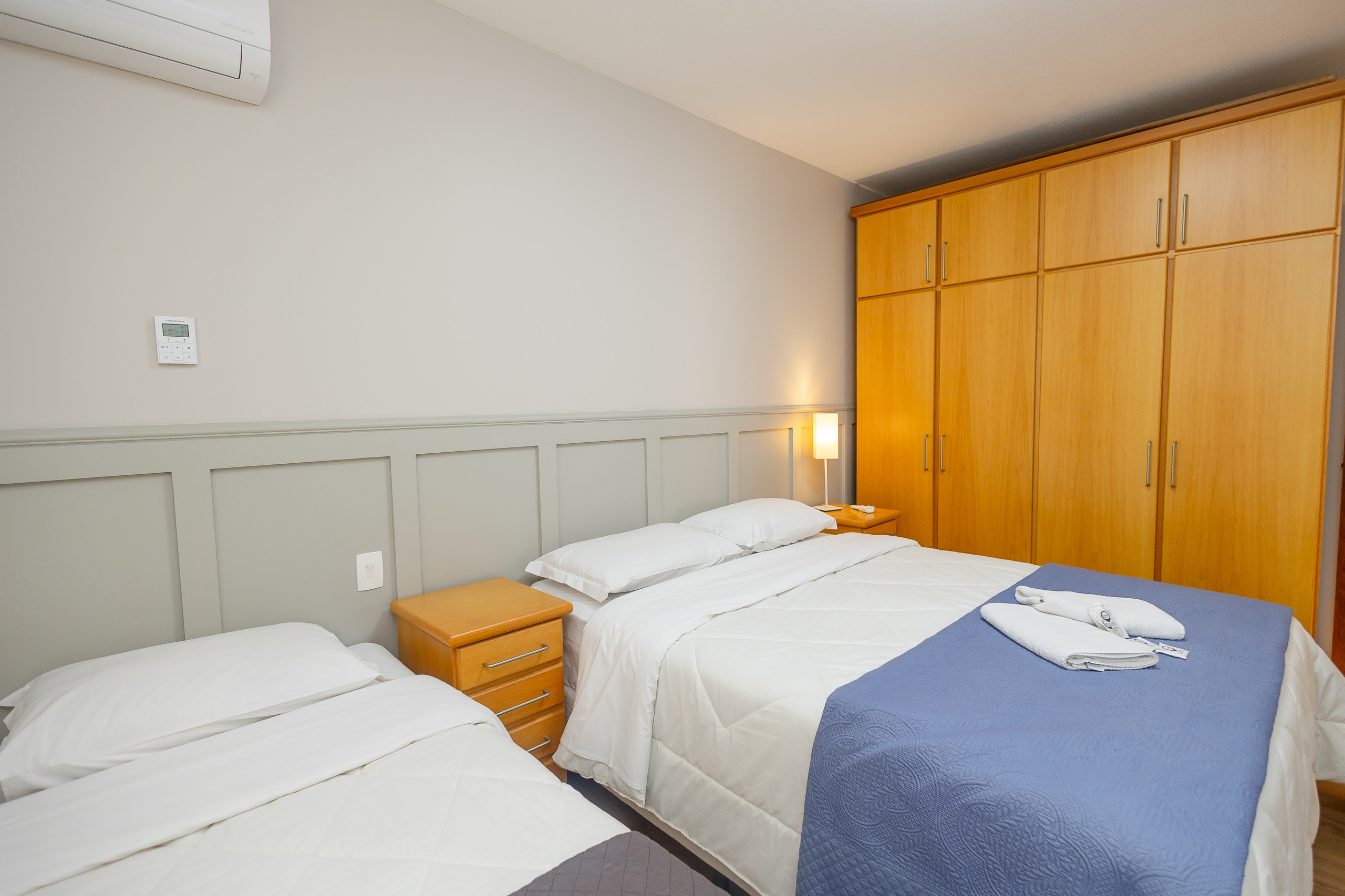 Aloja hasta 06 personas en sus dos dormitorios, ambos climatizados con split F/C: una habitación cuenta con cama queen y Smart TV y la otra, cuenta con una cama queen y una de una plaza. Aún hay espacio para una plaza en el sofá-cama de la sala.
