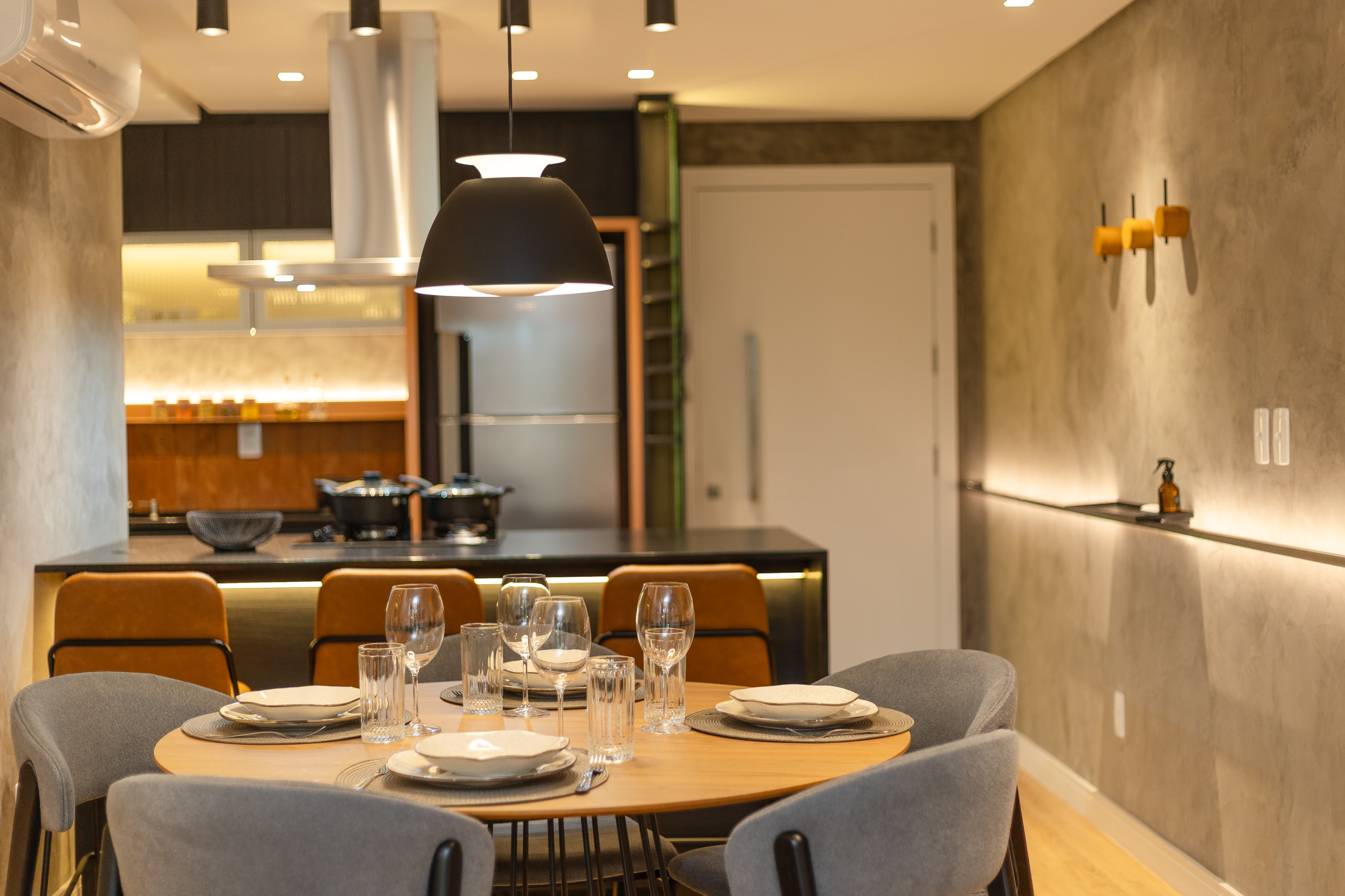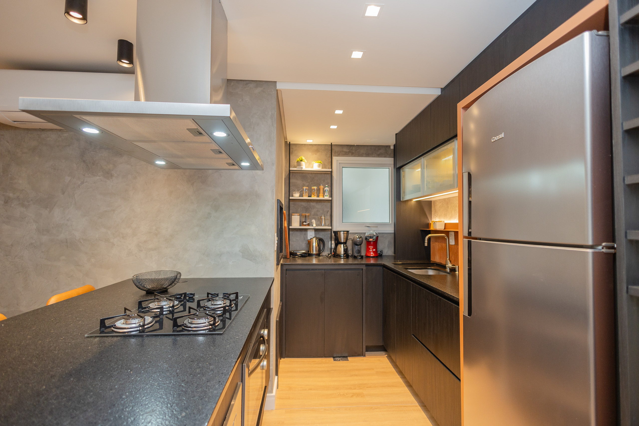 La cocina completa cuenta churrasquera, refrigerador, cafetera, sandwichera, microondas, vitrocerámica y estufa. En la mesa, podrán sentarse para comidas o simplemente apreciar un chocolate caliente o un vino. El apartamento aún dispone de secador de cabello y lavadora y secadora.
