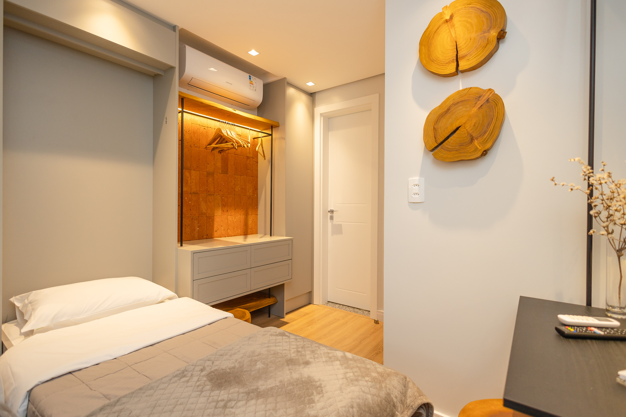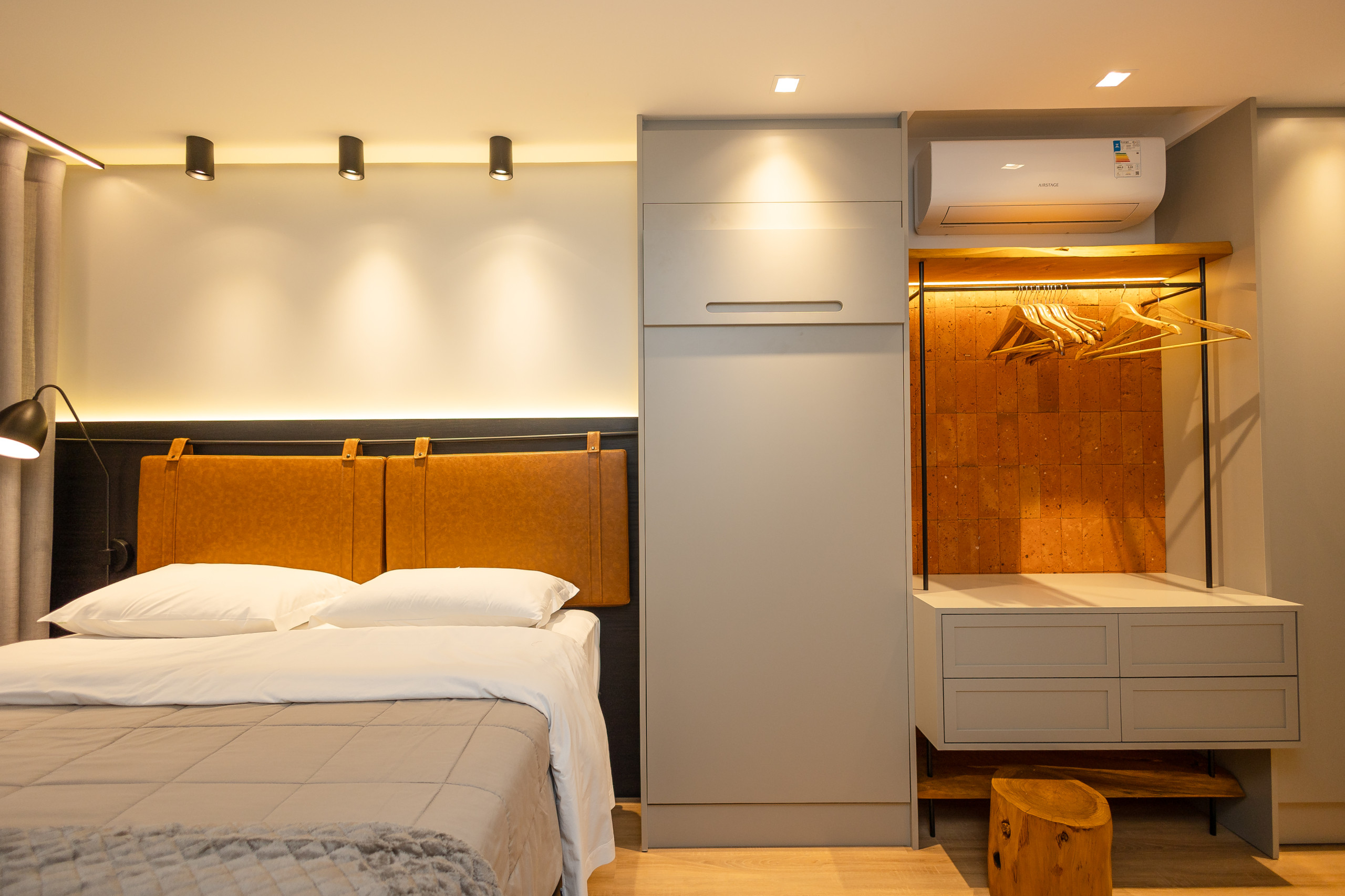 En el área íntima encontramos una suite con split Q/F y cortinas blackout que traen confort. Ella cuenta con cama queen y una cama individual que puede ser rebatida en el armario para optimizar el espacio cuando no se utiliza.