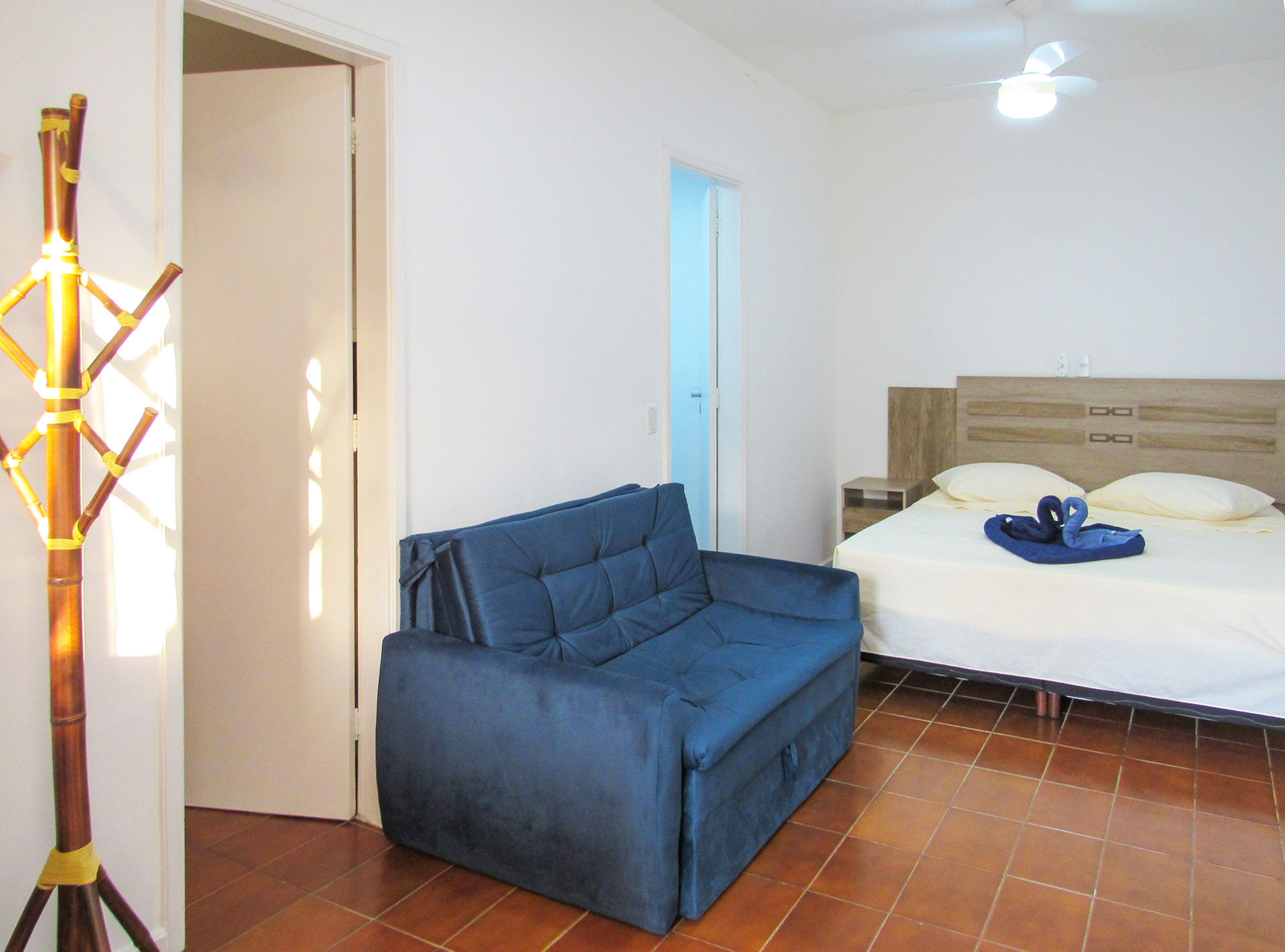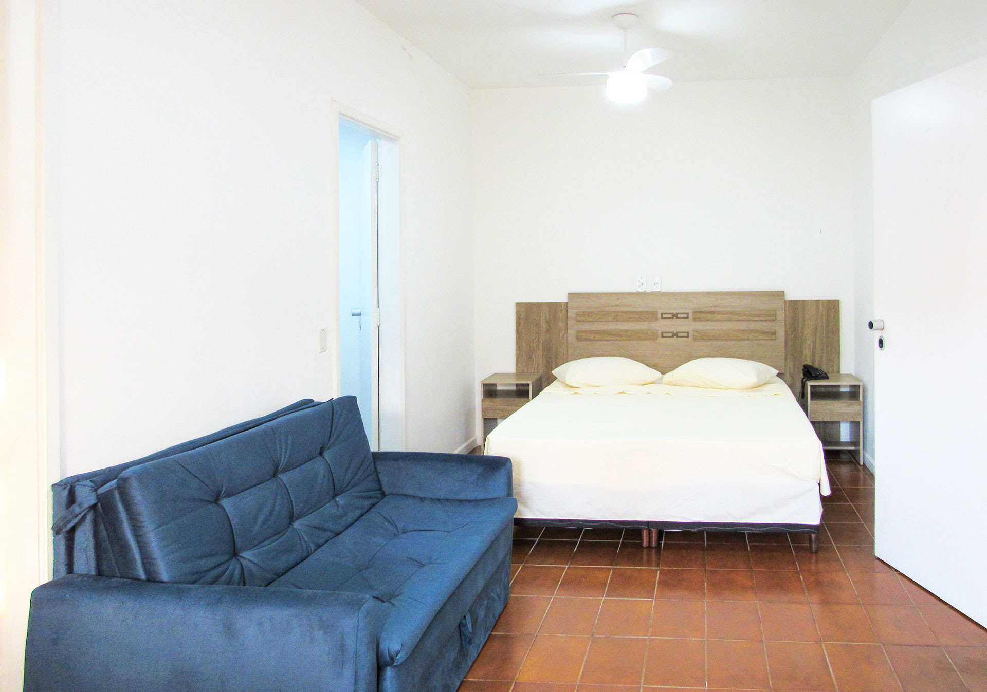 - Na suíte há 1 cama de solteiro, 1 sofá-cama de casal, 1 cama queen size, chuveiro a gás e box de vidro/acrílico