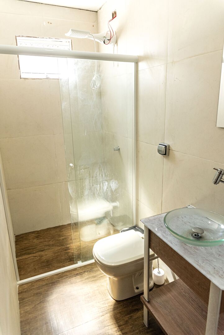 - O banheiro tem chuveiro elétrico, box de vidro e secador de cabelo
