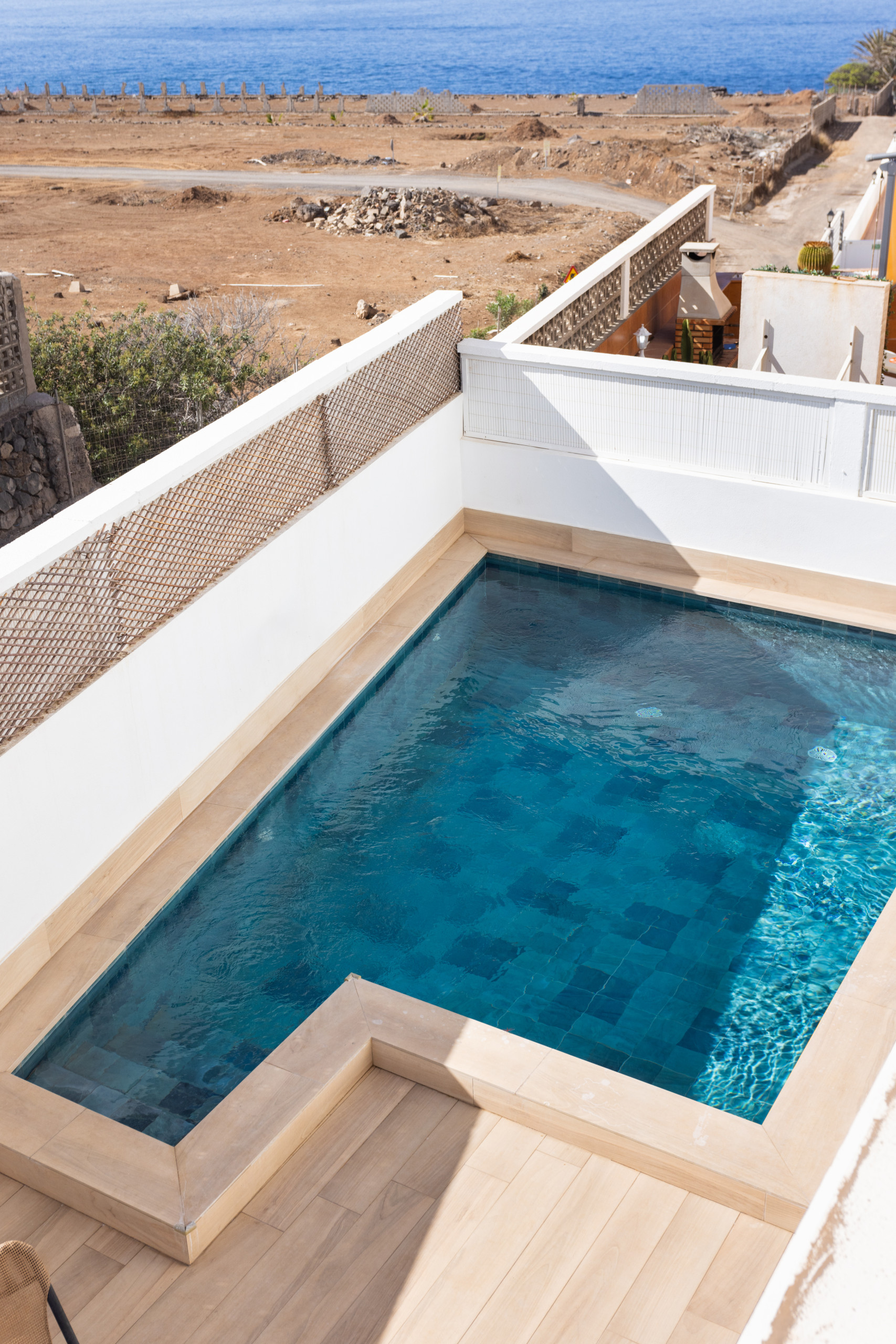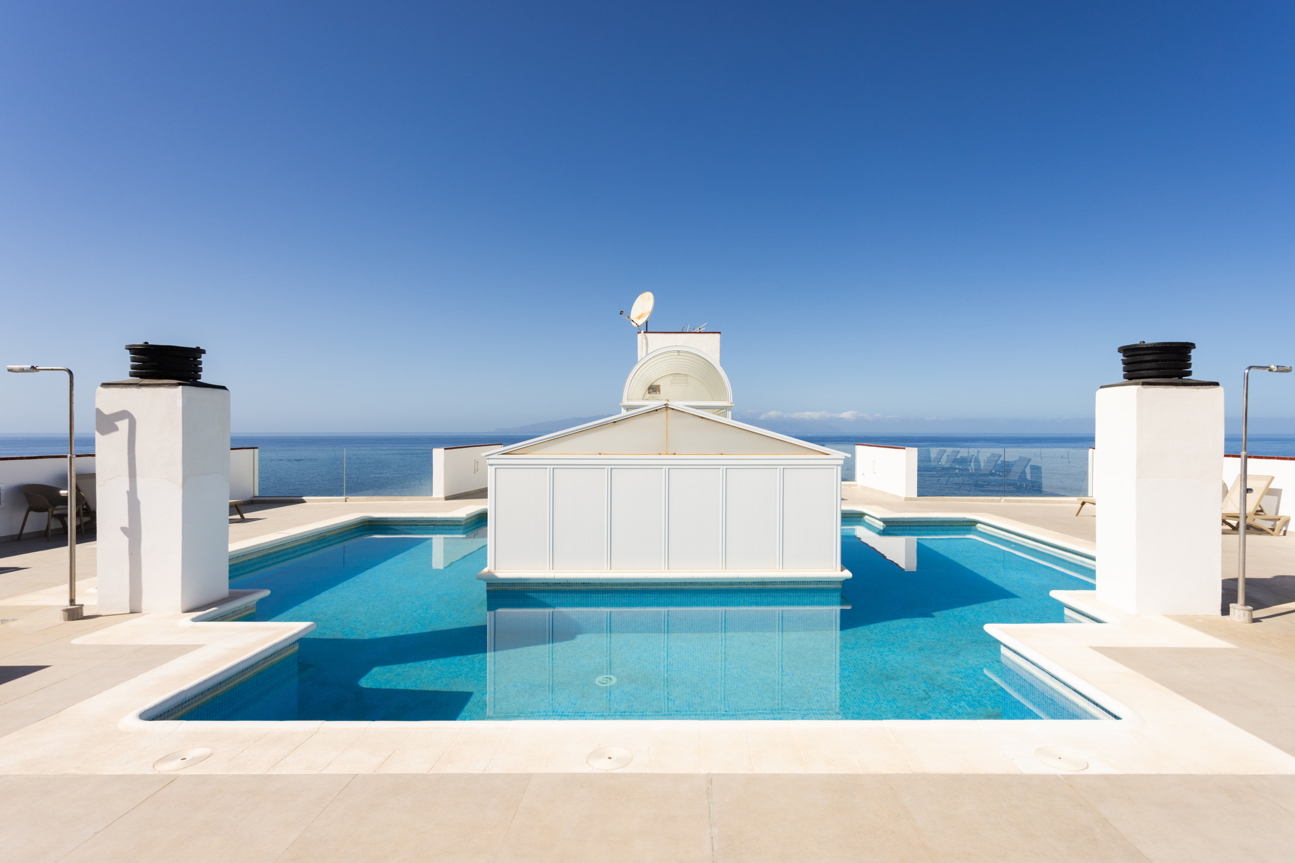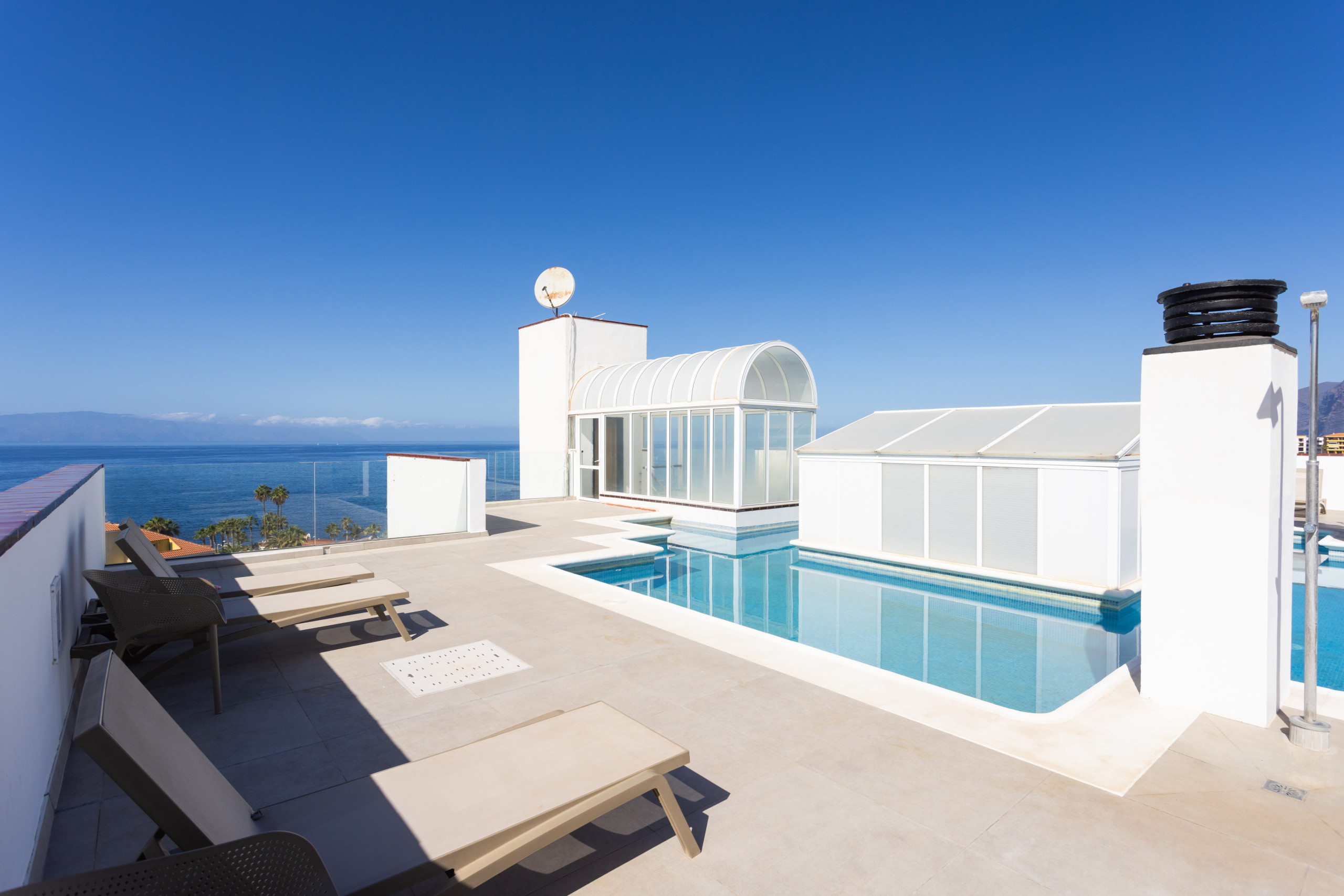En la azotea del edificio hay una piscina comunitaria con espectaculares vistas al mar, las montañas y la isla de La Gomera.