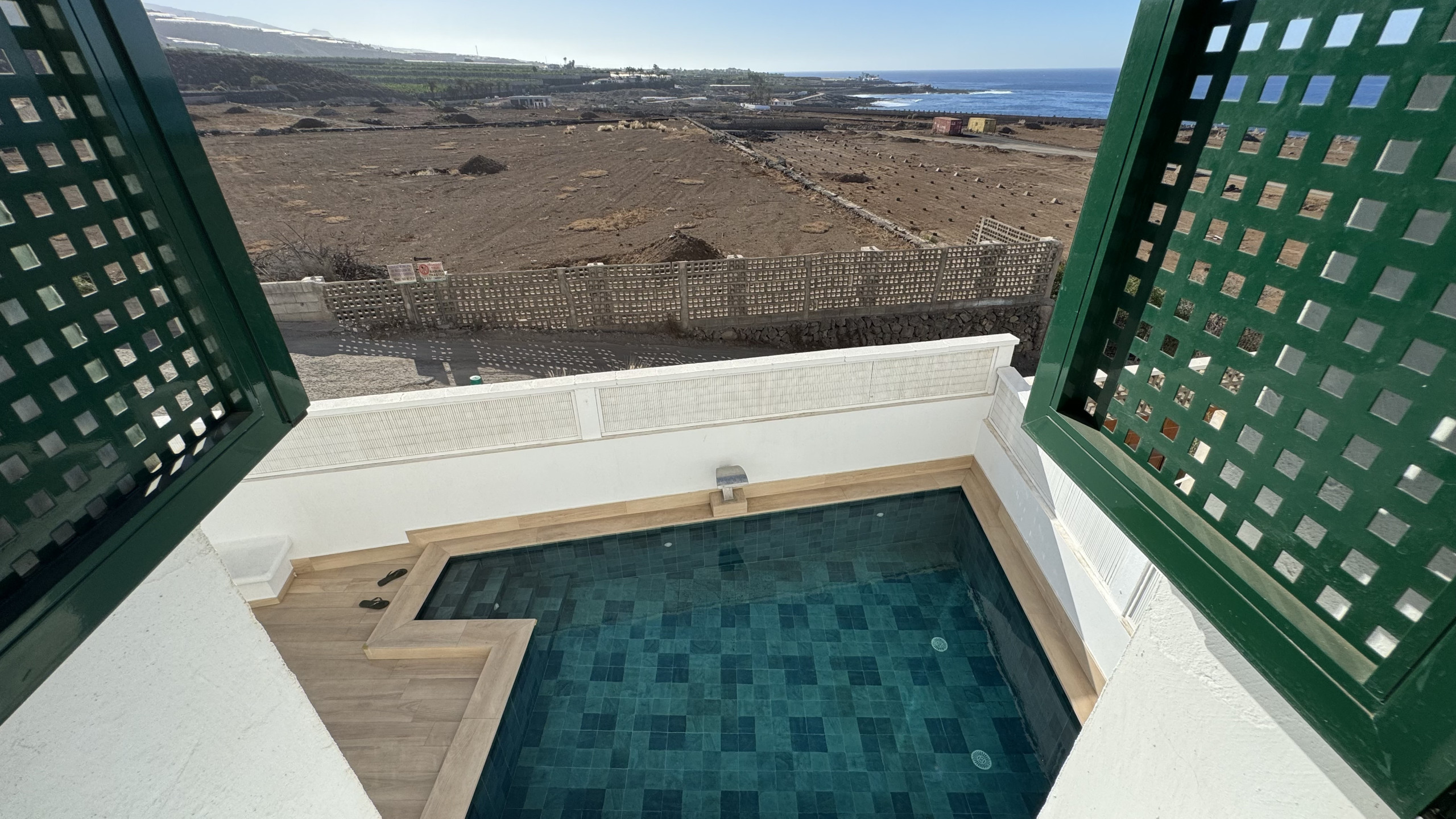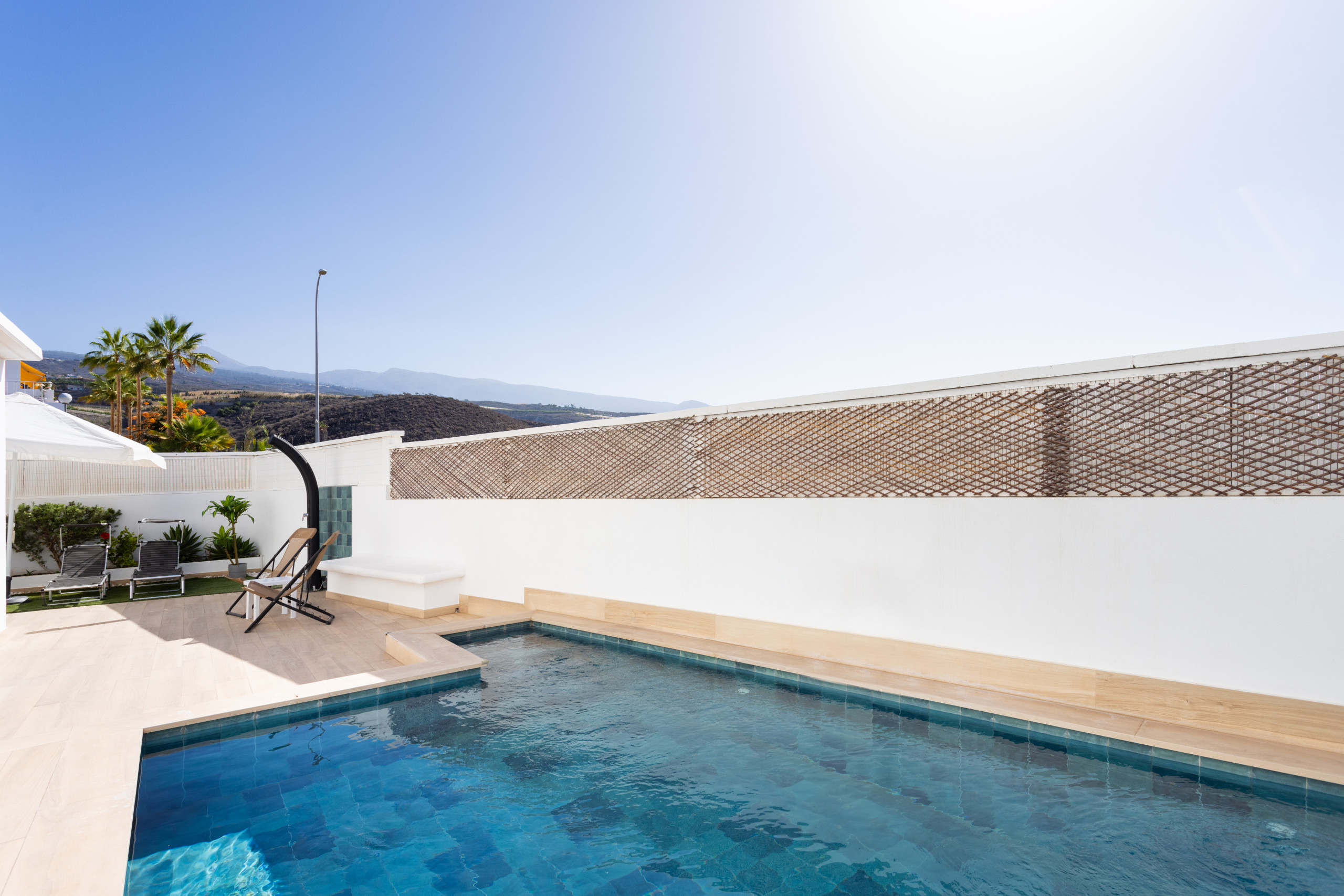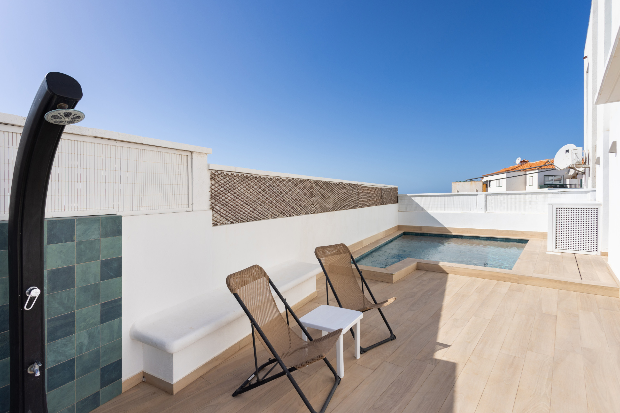 En la azotea del edificio hay una piscina comunitaria con espectaculares vistas al mar, las montañas y la isla de La Gomera.
