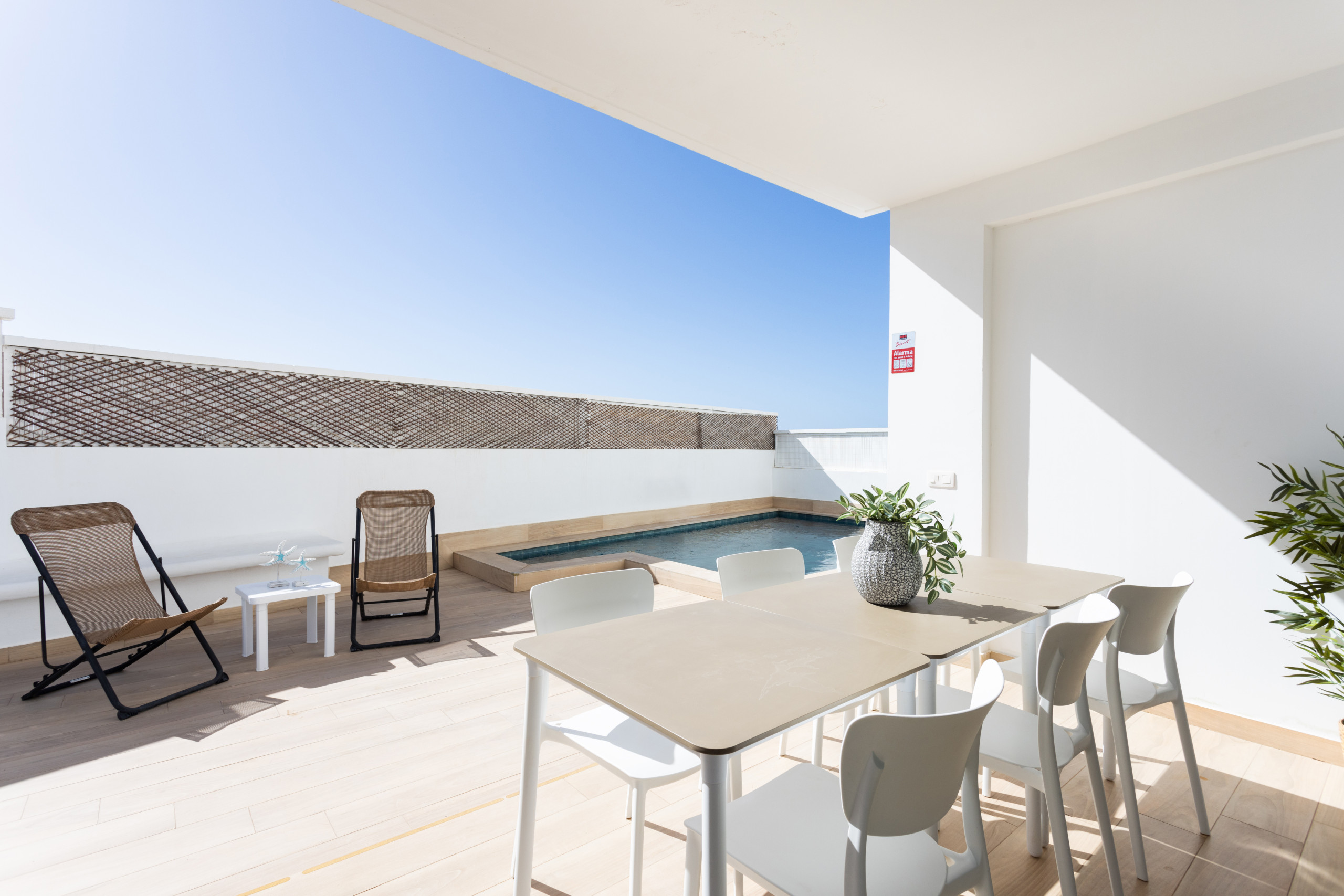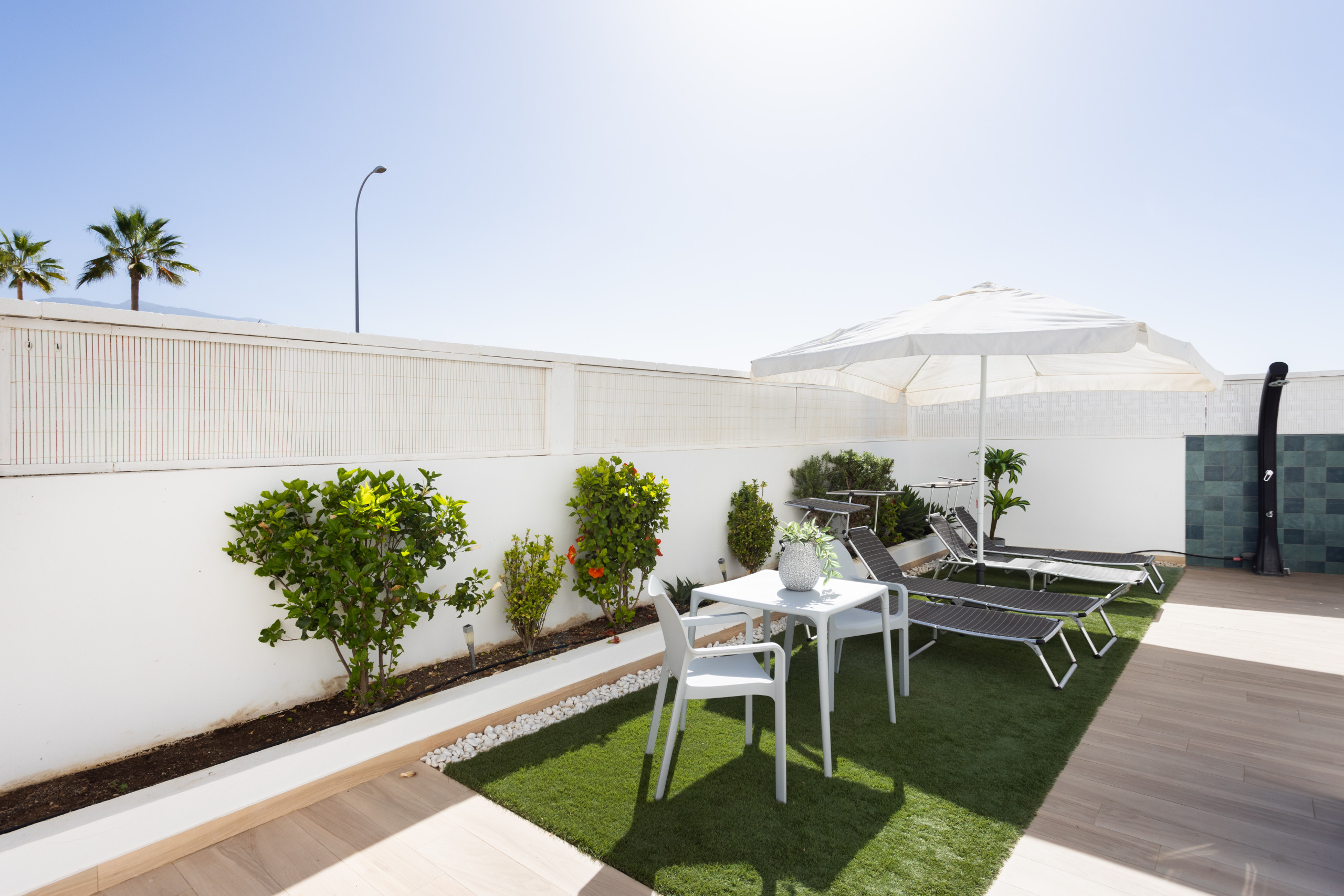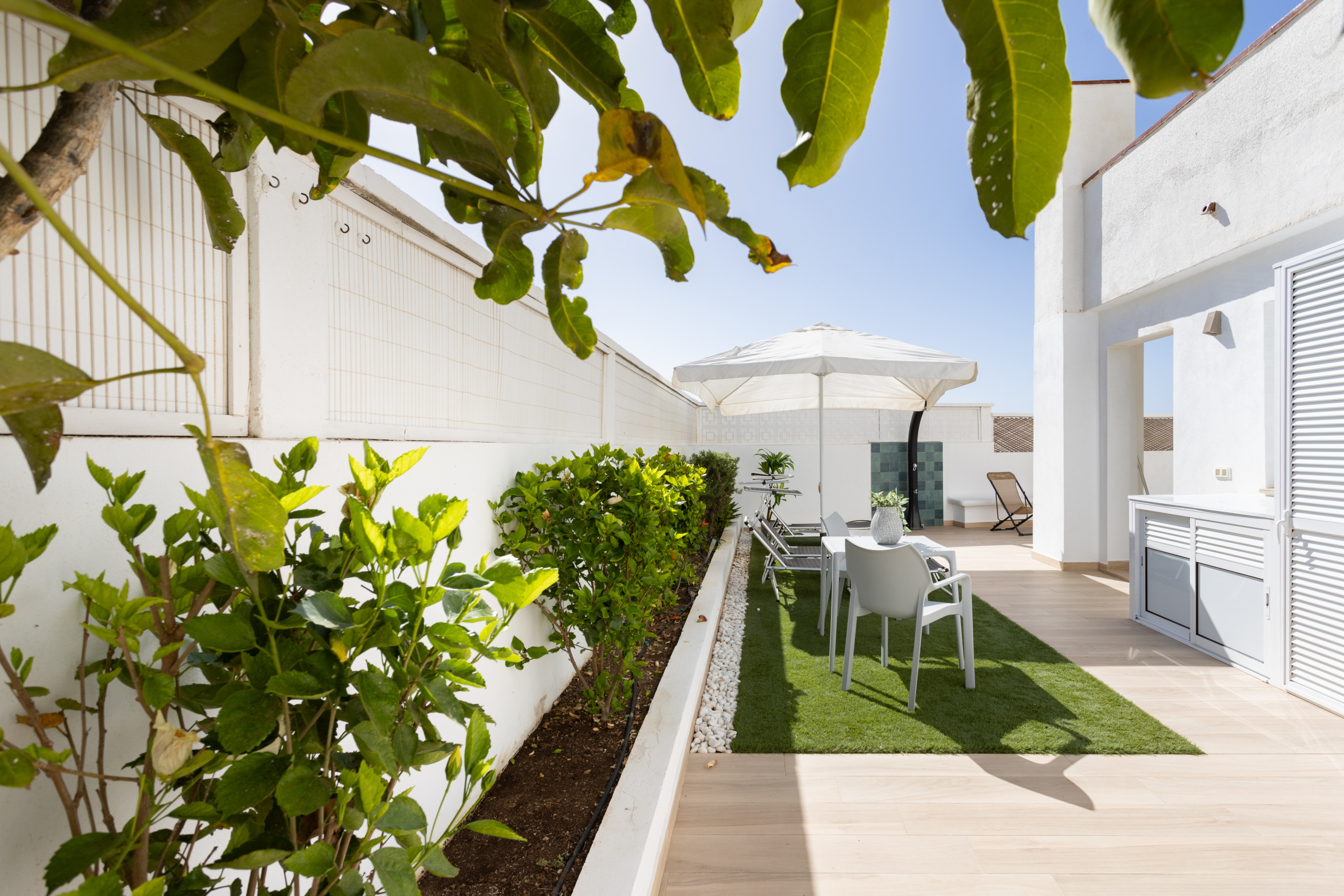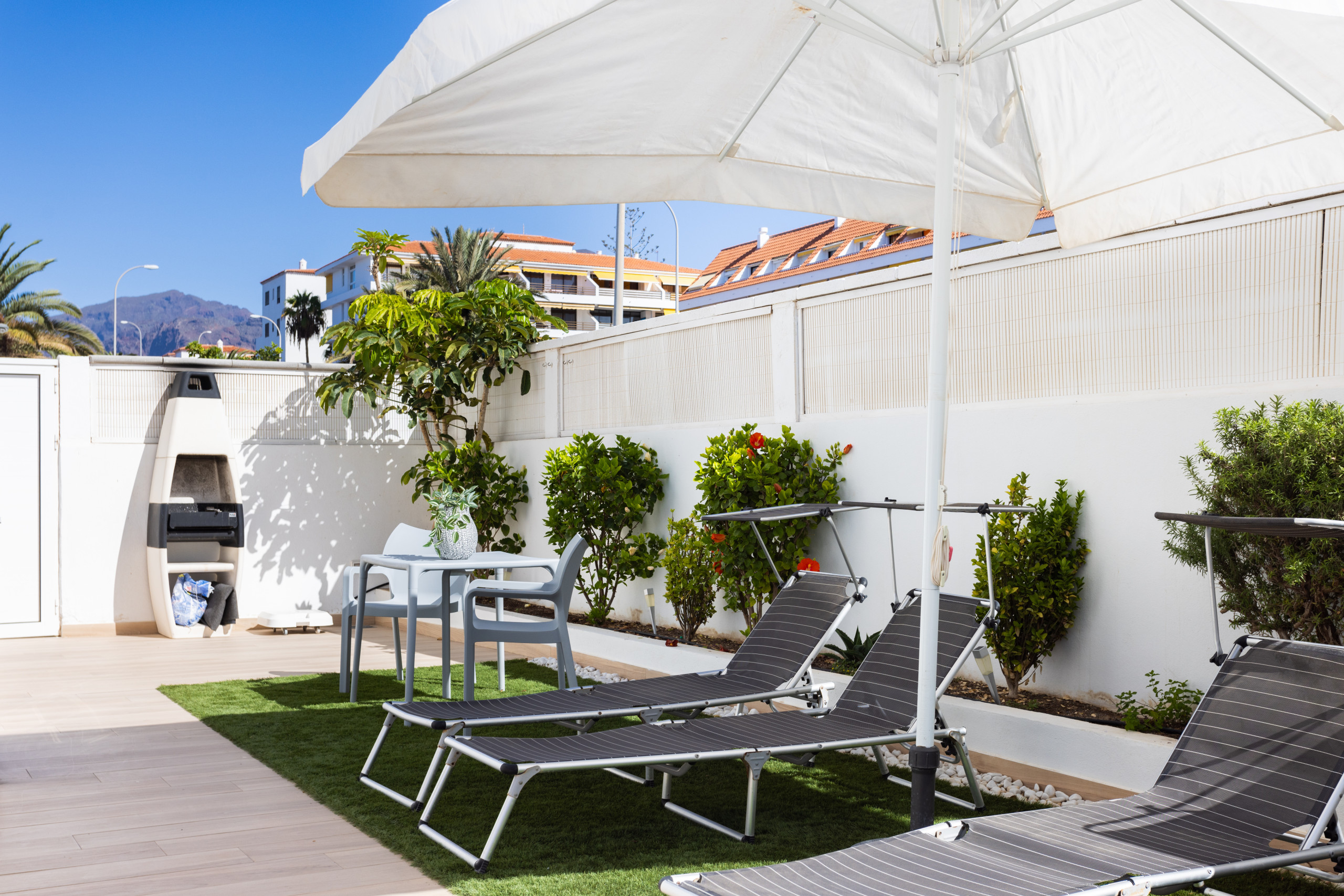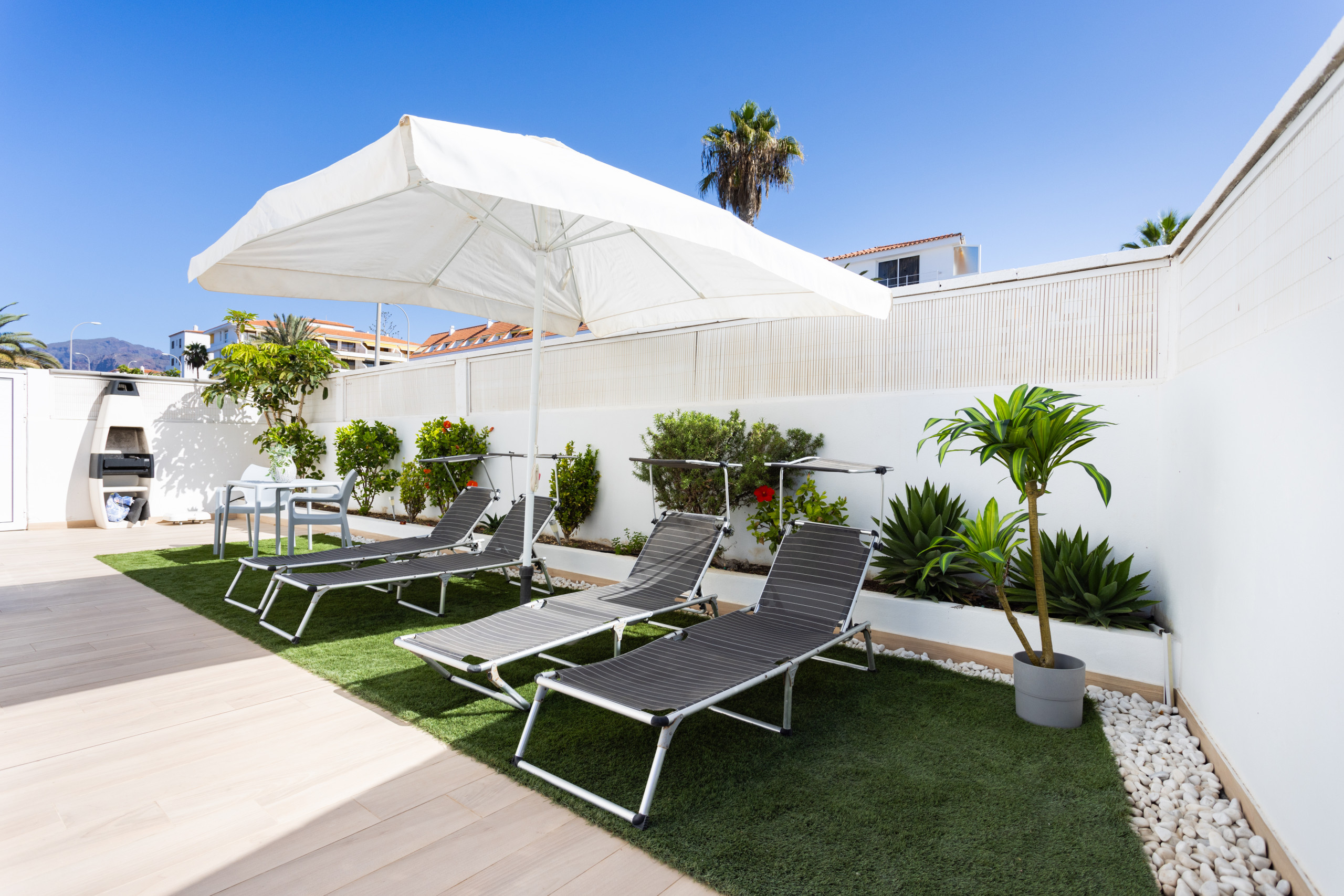 El espacio exterior es amplio y muy agradable, con tumbonas, zona de barbacoa y una mesa perfecta para comidas al aire libre.