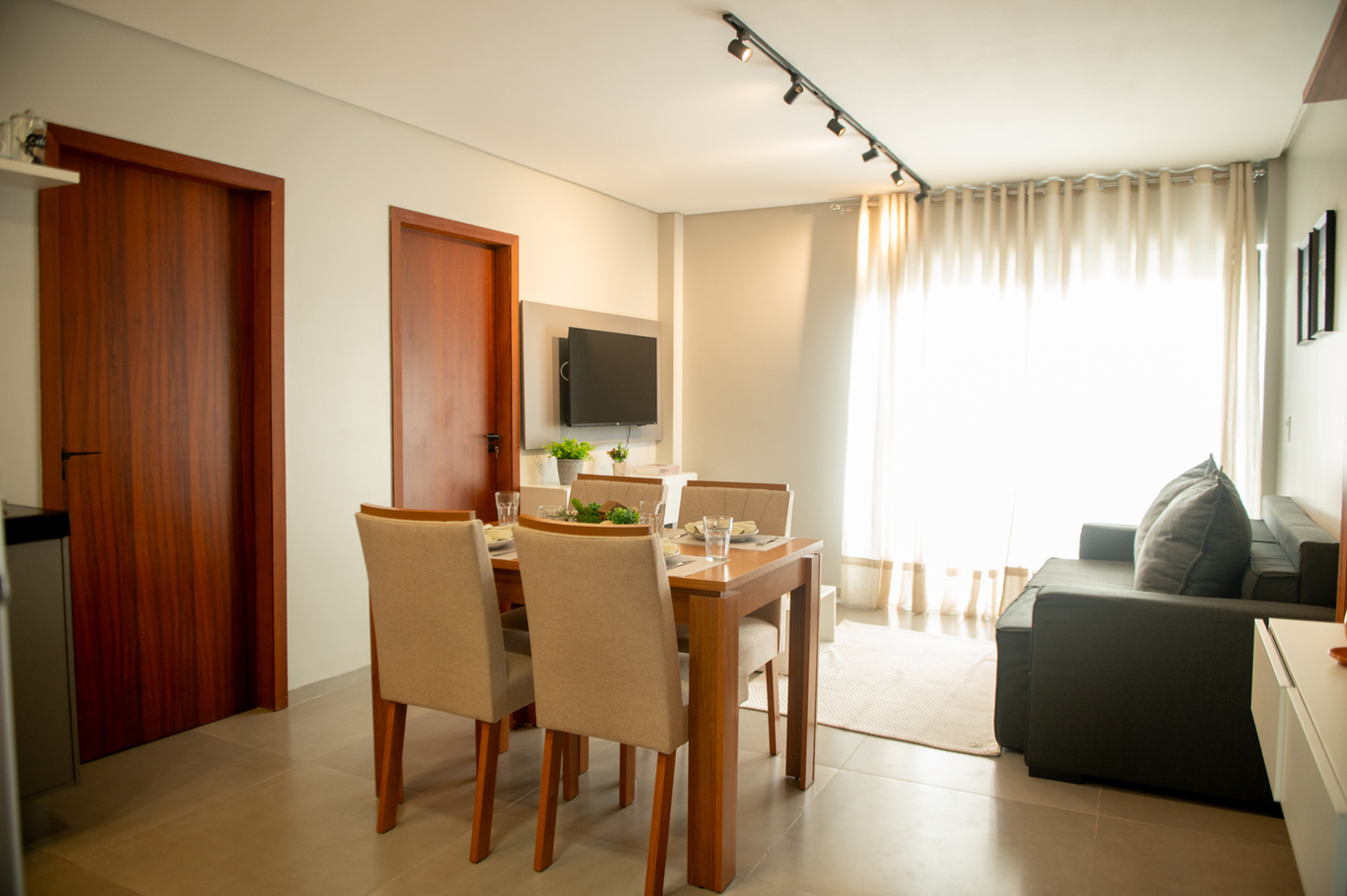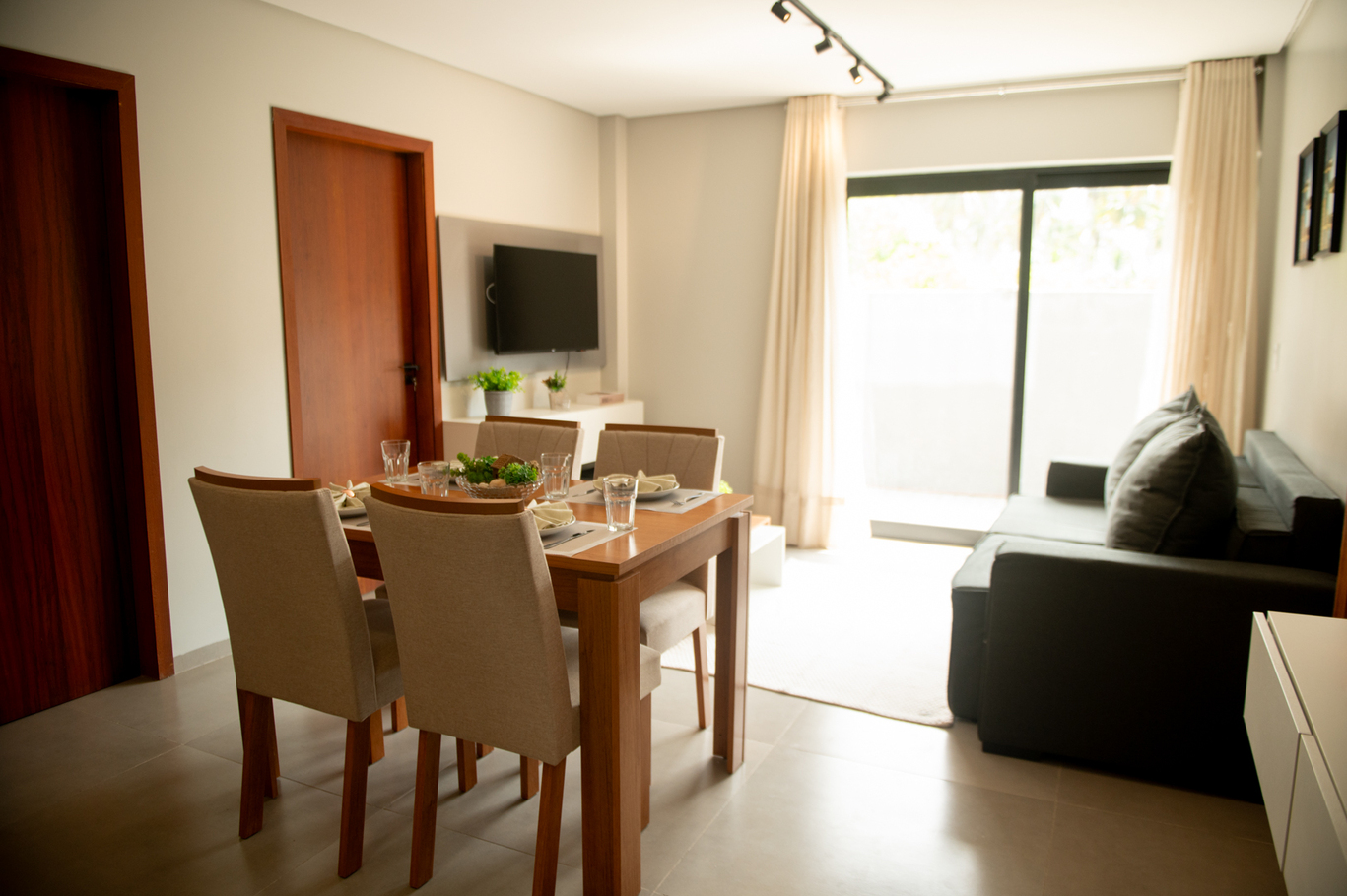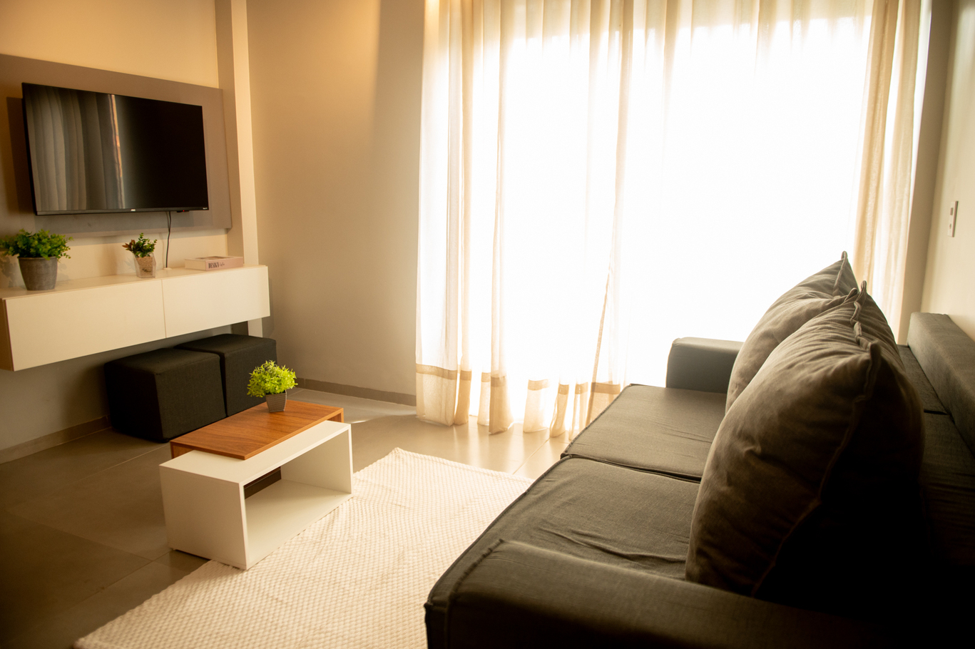 - Sala integrada a la cocina con sofá, Smart TV y mesa de comedor