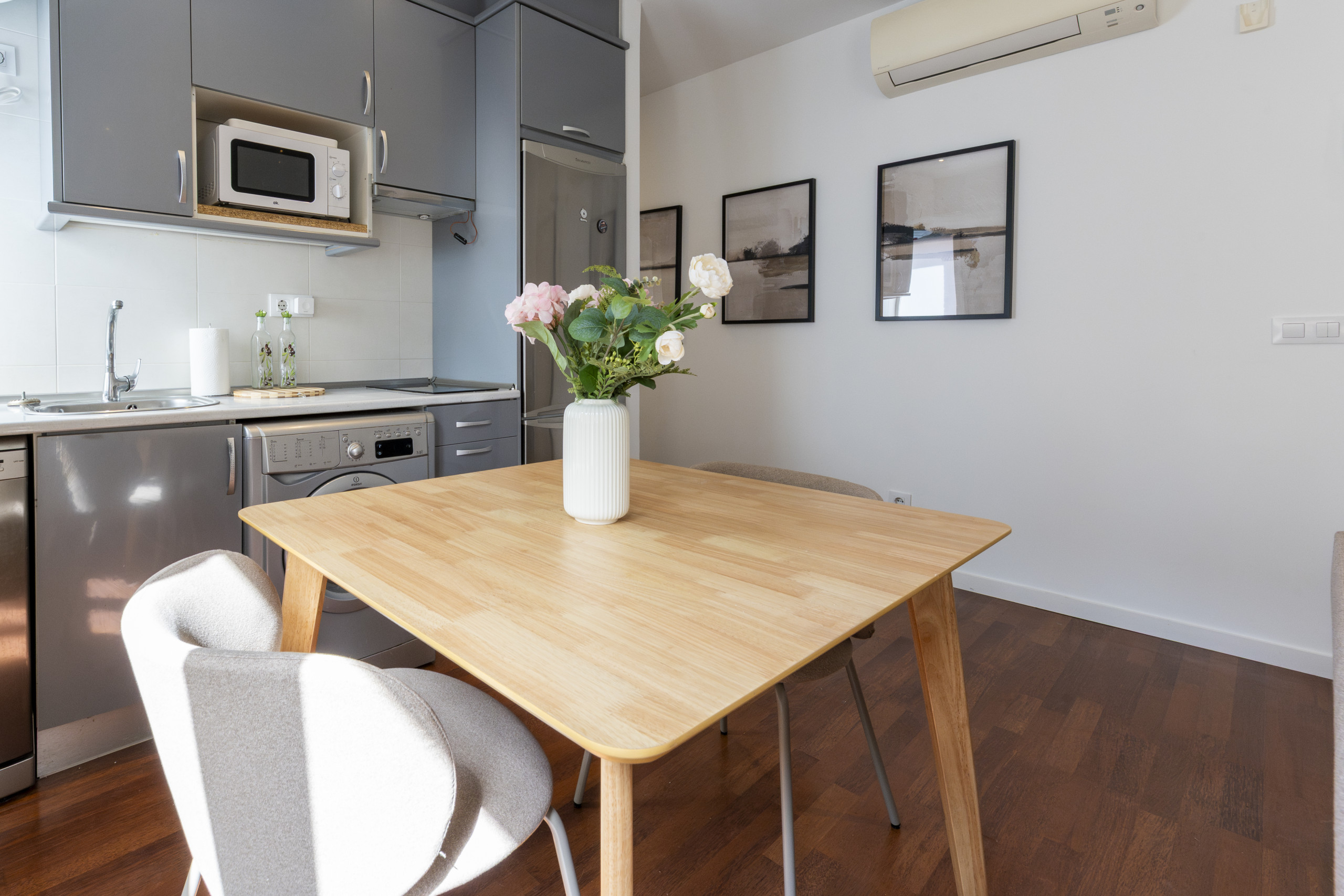 La zona de salón comedor está integrada con la cocina en un espacio abierto y versátil. Aquí encontrarás un cómodo sofá cama, perfecto para recibir invitados o para disfrutar de una película tras un día recorriendo la ciudad. La cocina, totalmente equipada, incluye lavadora, microondas, cubitera y todos los utensilios necesarios para que puedas cocinar tus platos favoritos durante tu estancia.
