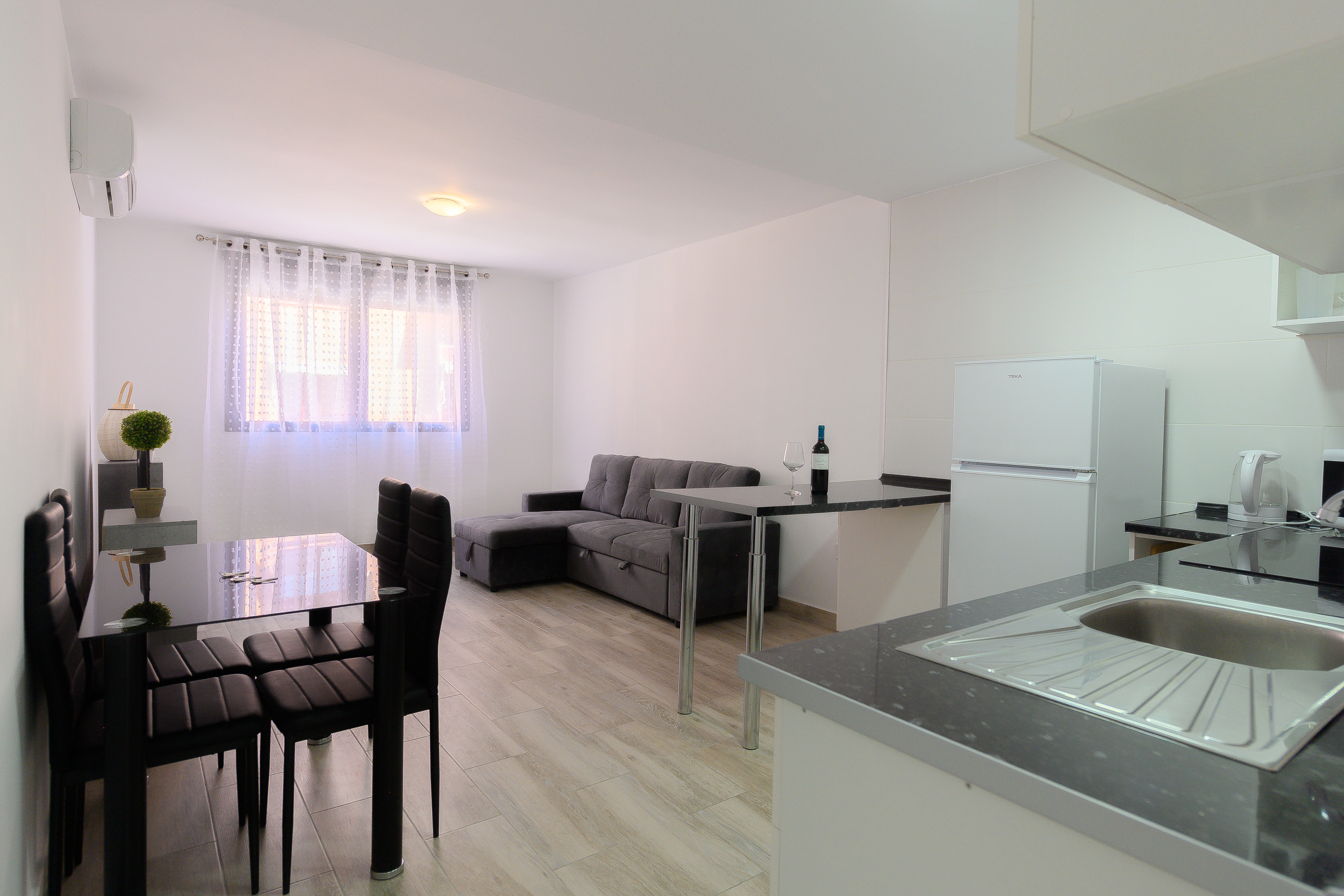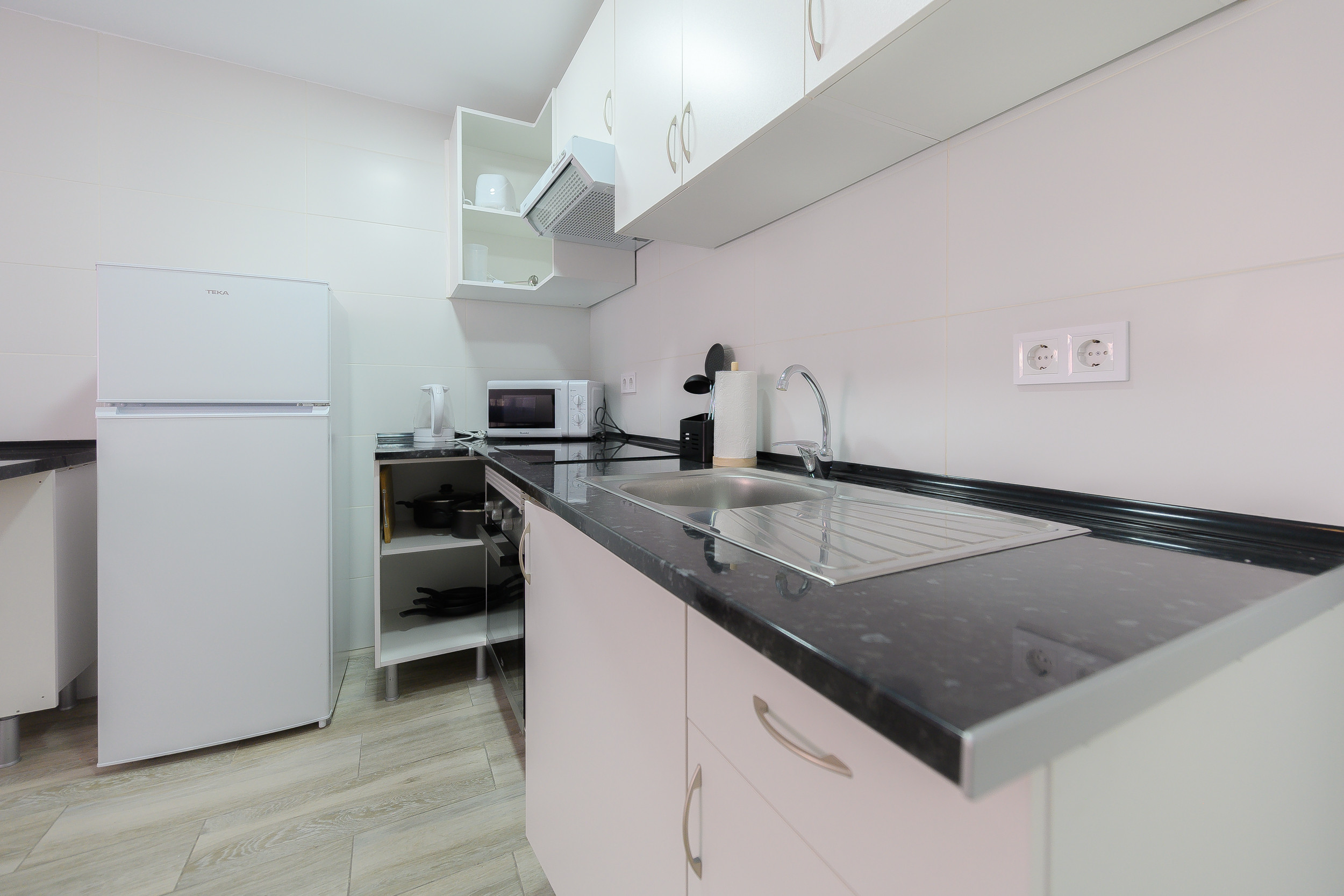 Integrada al salón se encuentra la cocina, que ha sido diseñada con una distribución práctica y moderna. Está completamente equipada con todos los electrodomésticos necesarios, como nevera, microondas, horno, cafetera y vitrocerámica. También cuenta con una variedad de utensilios de cocina, lo que permite preparar desde platos sencillos hasta cenas más elaboradas. La integración con el salón hace que este espacio sea perfecto para quienes disfrutan de cocinar mientras socializan o ven televisión.