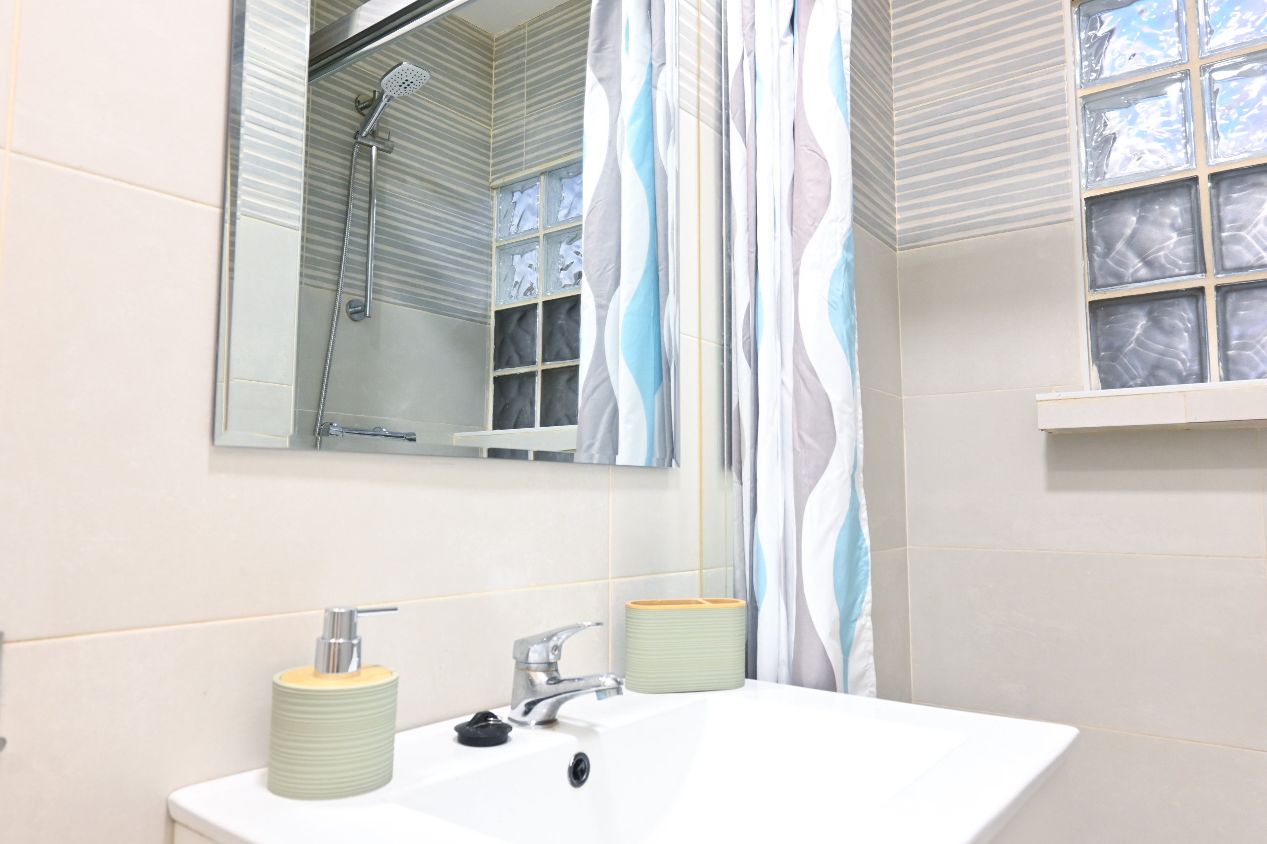 El baño es un ejemplo de diseño eficiente, equipado con un plato de ducha que maximiza el espacio. Aquí encontrará todo lo necesario para su rutina diaria, con un lavabo, inodoro y un práctico mueble para mantener sus artículos de baño organizados y al alcance.