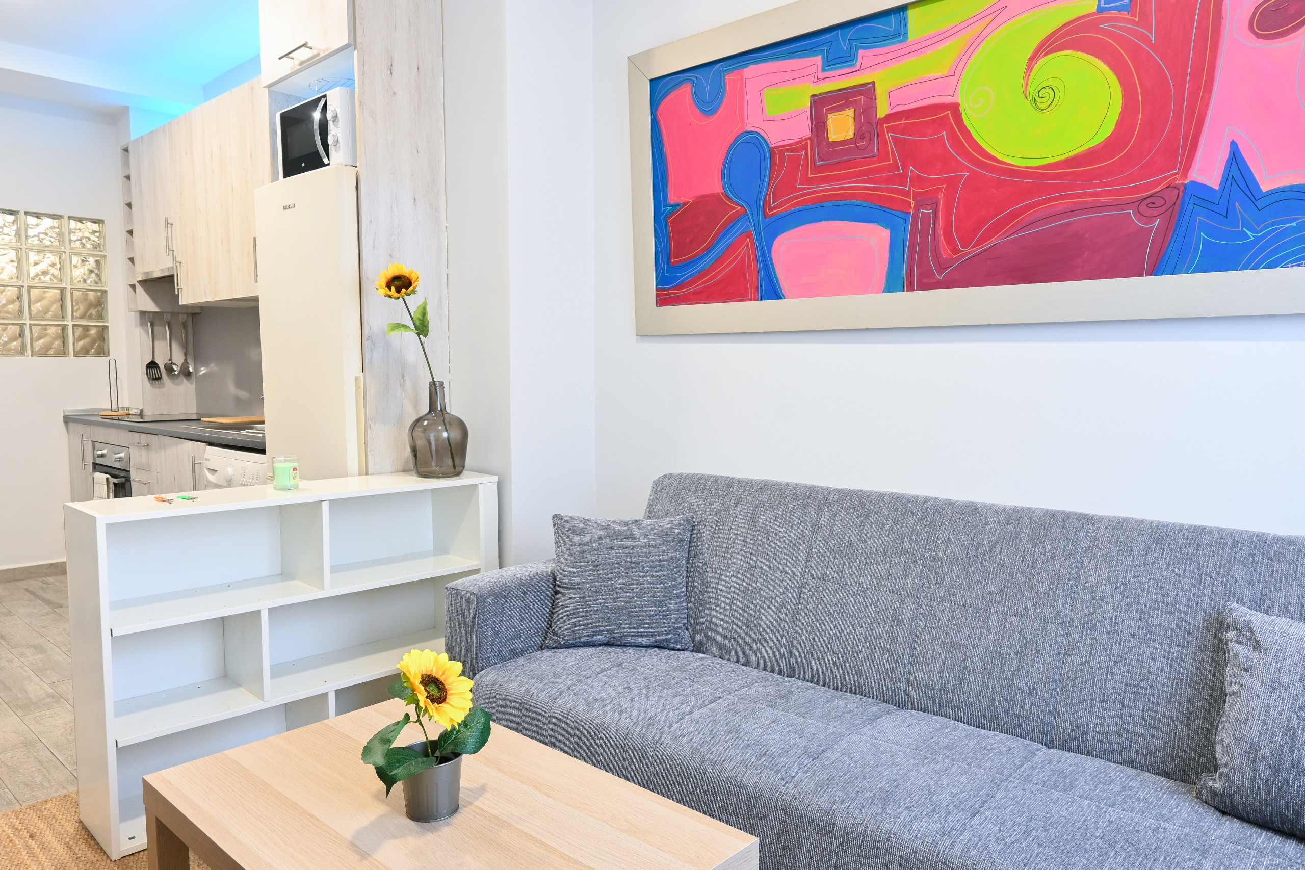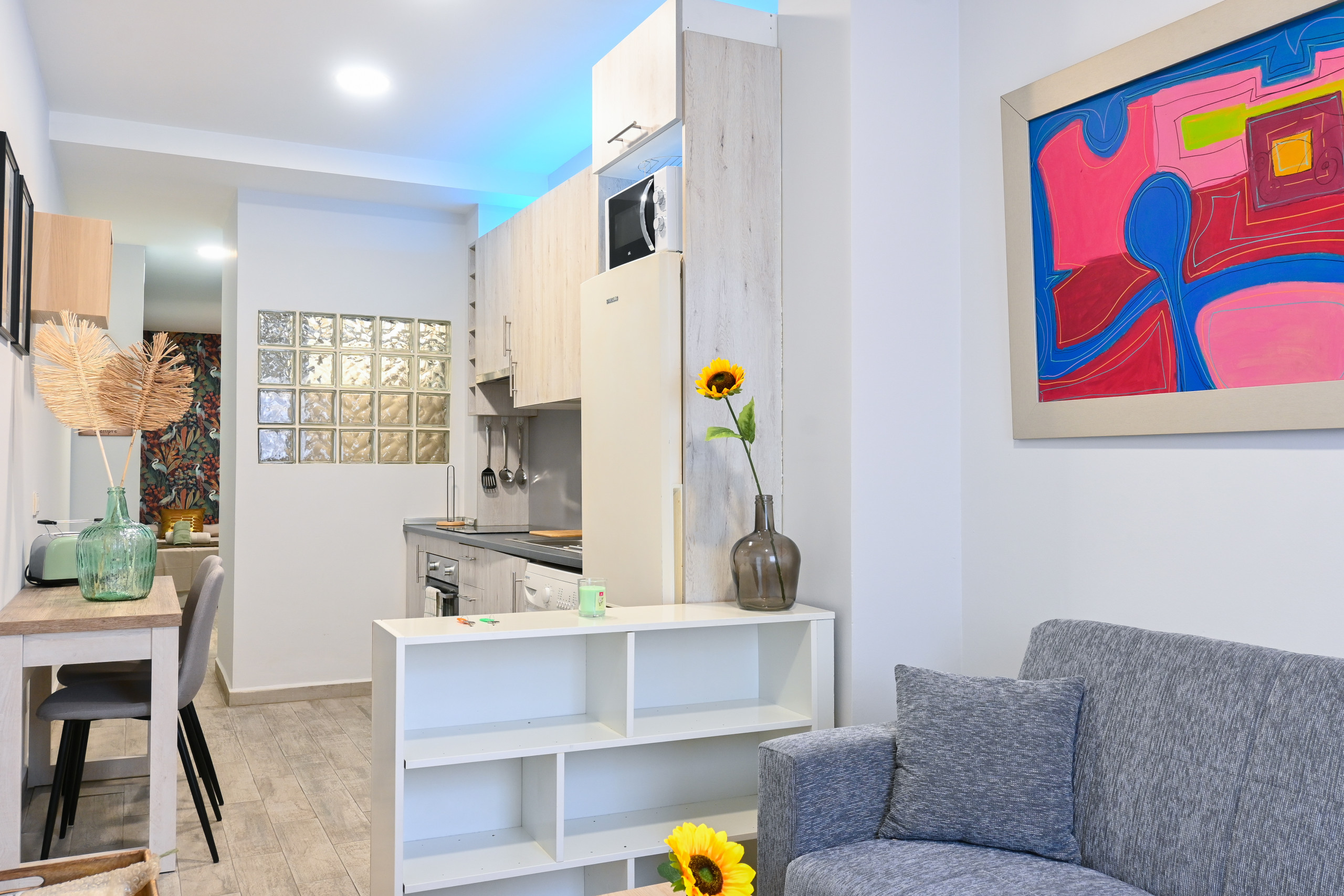La cocina integrada es un sueño para los amantes del diseño abierto. Con electrodomésticos, como nevera, cocina y microondas, cocinar será un placer. Además, su disposición abierta al salón crea un ambiente luminoso y acogedor, ideal para recibir a amigos y familiares.