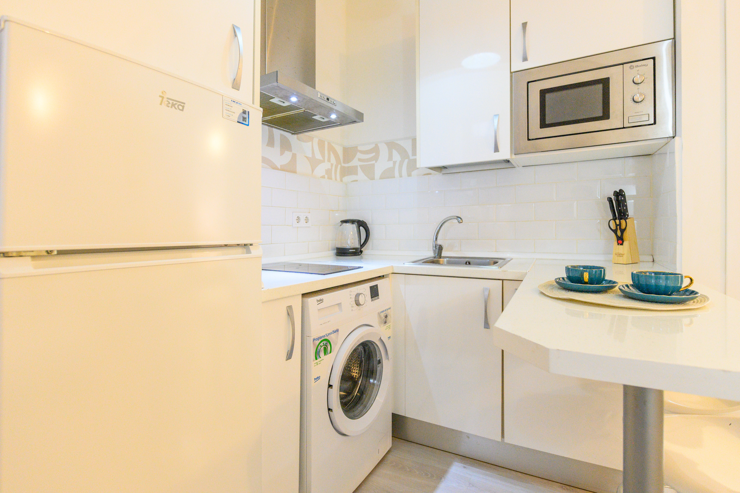 • Cocina americana totalmente equipada, lavadora, horno, microondas y nevera, ideal para preparar tus comidas favoritas.