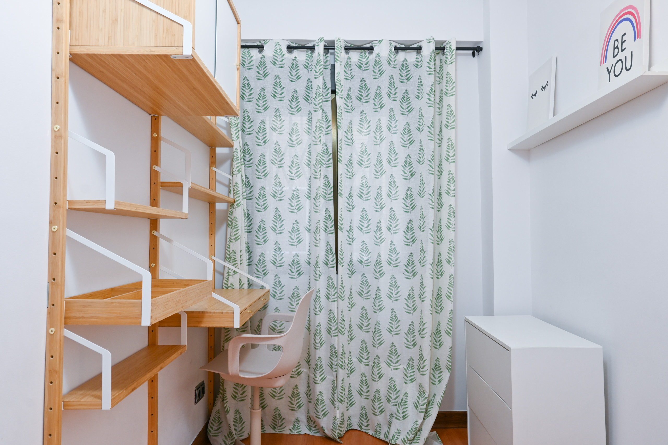 El dormitorio principal está equipado con una cama doble, proporcionando un ambiente cálido y acogedor para el descanso. La decoración con tonos suaves que aportan una sensación de serenidad, mientras que el mobiliario funcional incluye armarios amplios para el almacenamiento. El segundo dormitorio, más pequeño pero igualmente cómodo, cuenta con una cama individual, siendo ideal para un niño o un invitado o incluso para habilitarlo como una habitación de trabajo adicional o estudio personal.