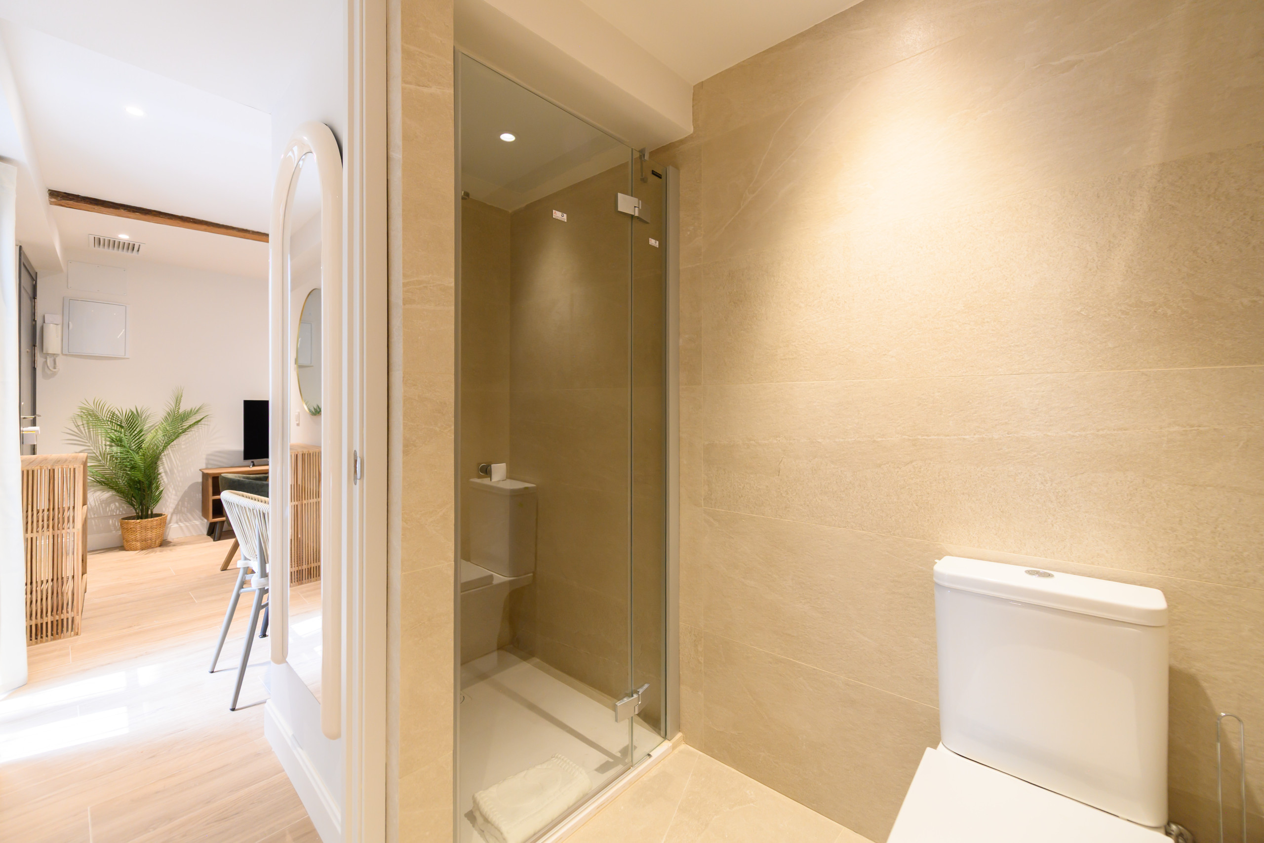 El baño completo está renovado y equipado con un plato de ducha moderno, espejo y un práctico mueble de lavabo que aporta capacidad de almacenamiento y comodidad en el uso diario. Su diseño combina funcionalidad con un estilo actual y cuidado.