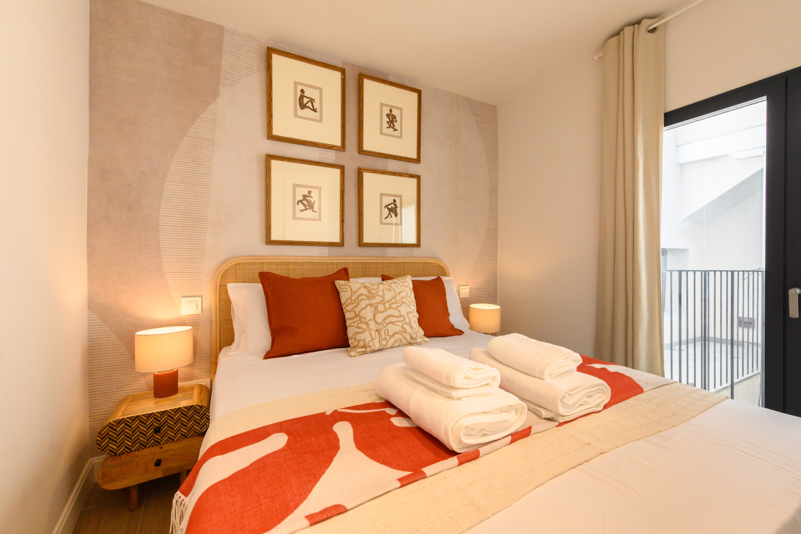 El dormitorio principal cuenta con una cama de matrimonio, y unas altas y amplias ventanas que te puedes mirar afuera, ofreciendo un lugar ideal para el descanso. El mobiliario y la distribución del espacio están pensados para garantizar el confort y la tranquilidad, creando un ambiente relajante tras una jornada en la ciudad.