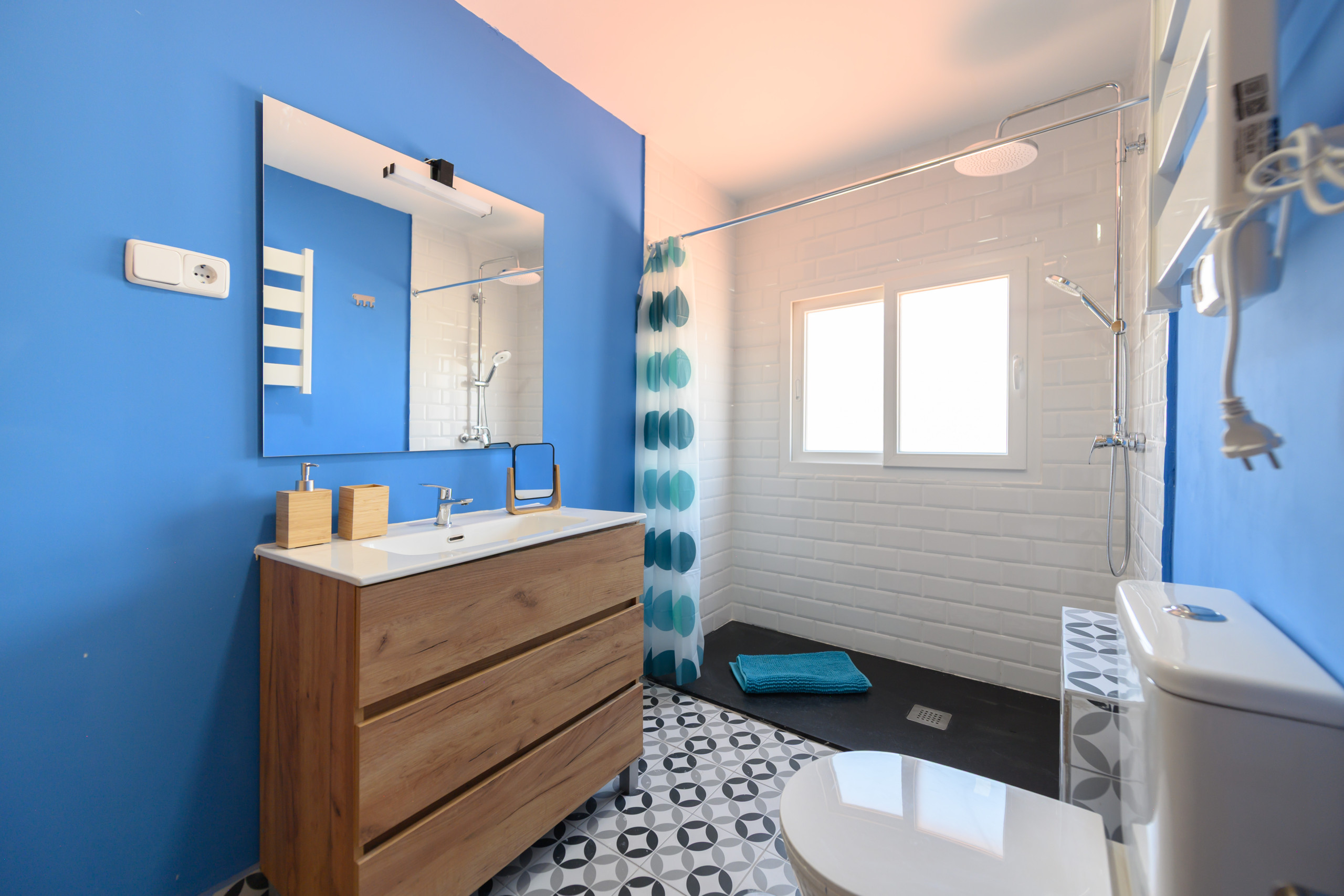 • Baño privado completo con mueble bajo lavabo, espejo y plato de ducha