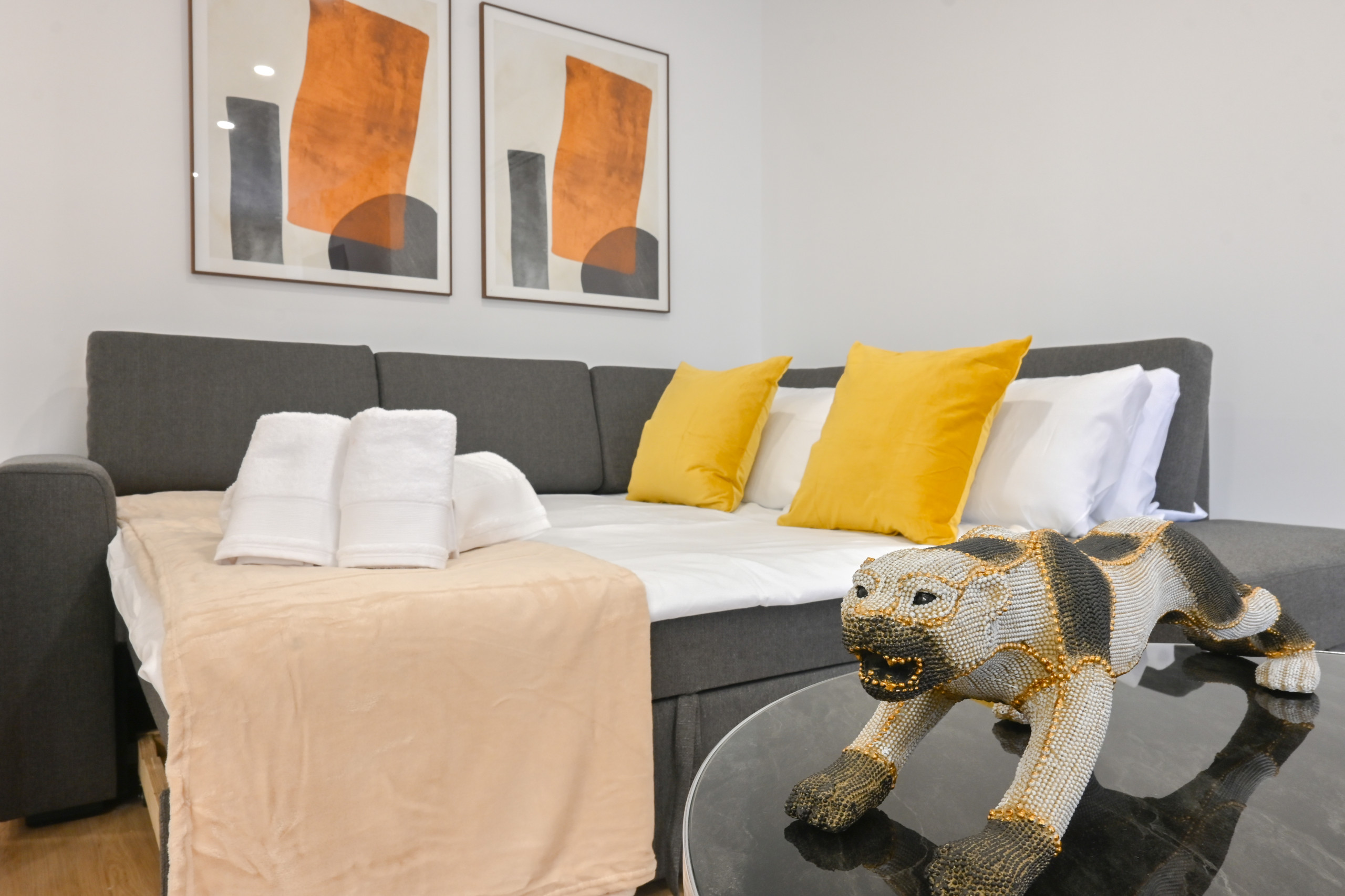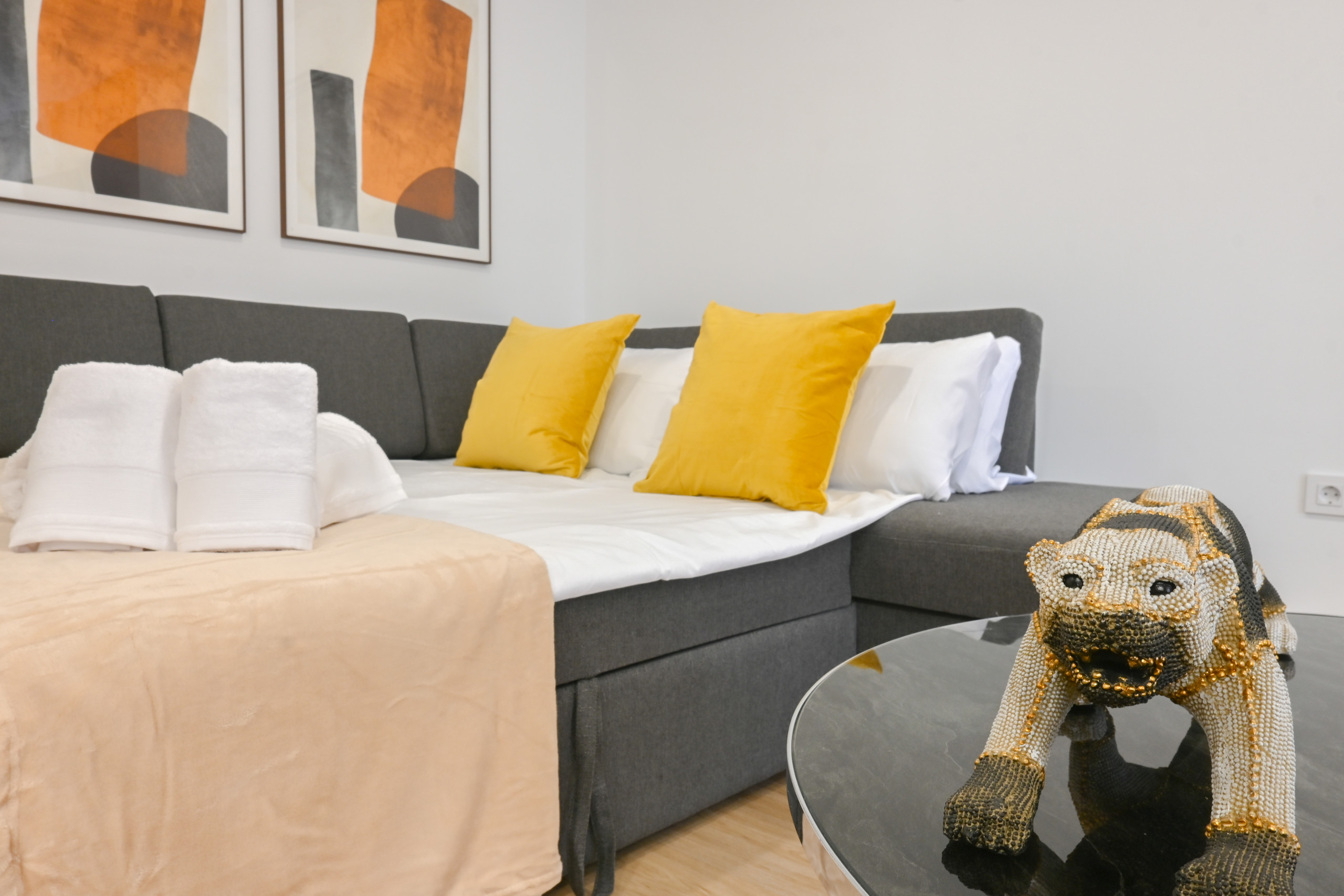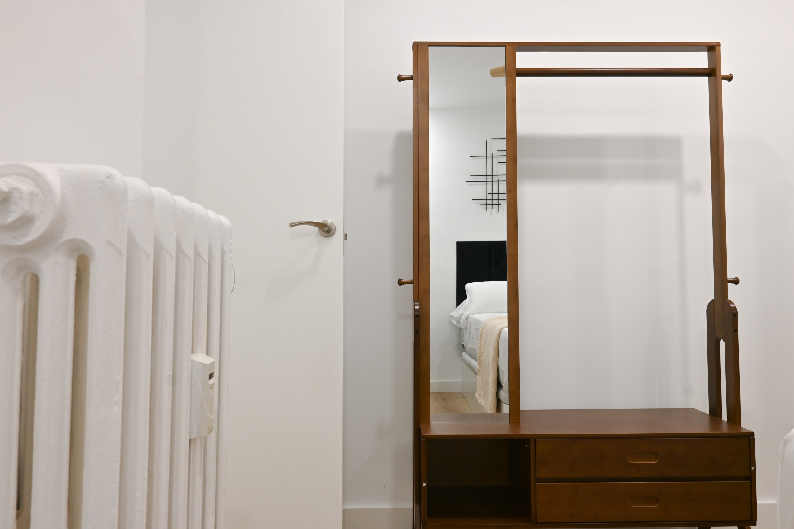 Además, el apartamento cuenta con una cómoda mesa de escritorio, proporcionando un espacio dedicado para trabajar o estudiar desde la comodidad de tu hogar. Un elegante sillón invita a disfrutar de momentos de lectura o simplemente a relajarte mientras contemplas las vistas de la tranquila zona que rodea la vivienda.