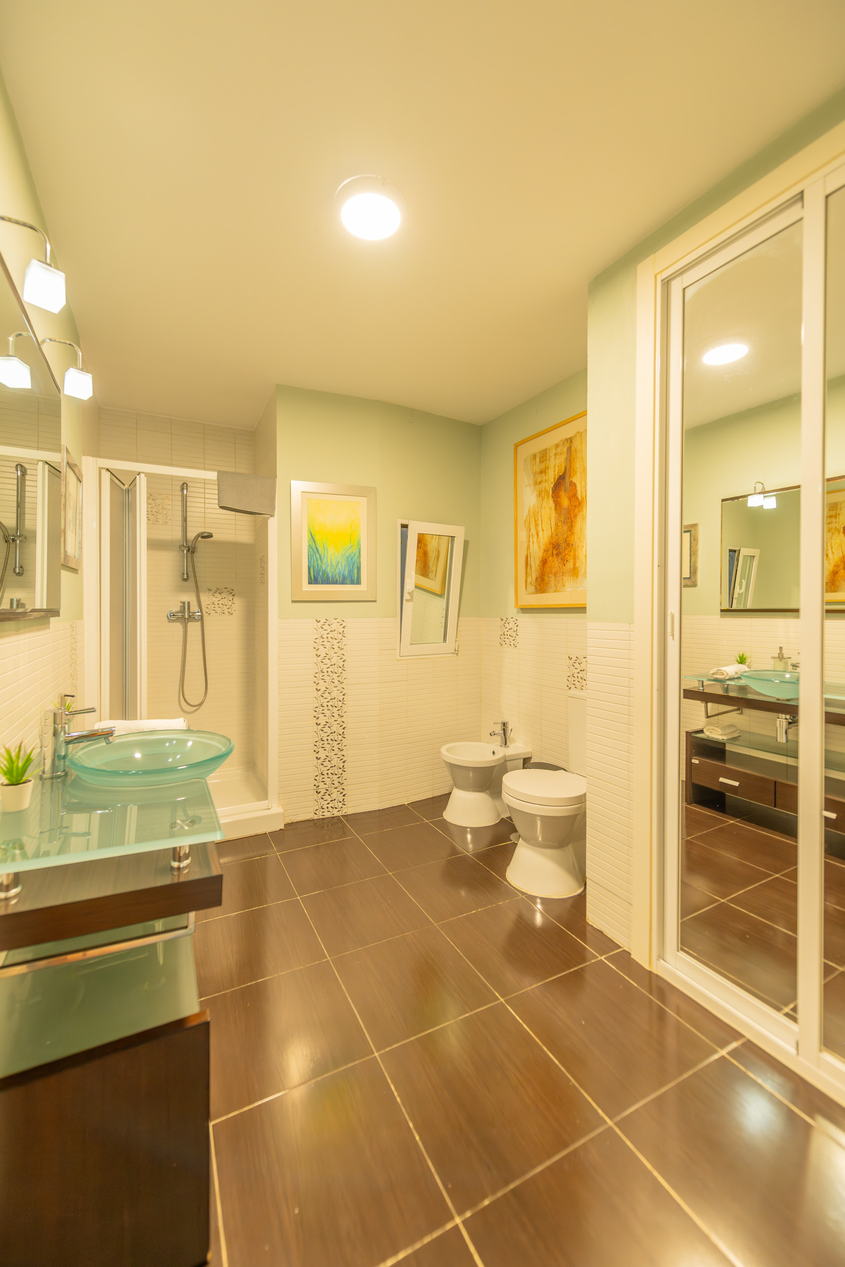 El apartamento dispone de un segundo baño moderno con un plato de ducha, proporcionando comodidad adicional para los huéspedes. El salón es un espacio luminoso y acogedor, equipado con un cómodo sofá tipo chaiselong, perfecto para relajarse y disfrutar de tus programas favoritos en la TV de pantalla plana. Los grandes ventanales del salón permiten la entrada de abundante luz natural y ofrecen vistas encantadoras a la calle, creando un ambiente cálido y acogedor para relajarte o socializar.