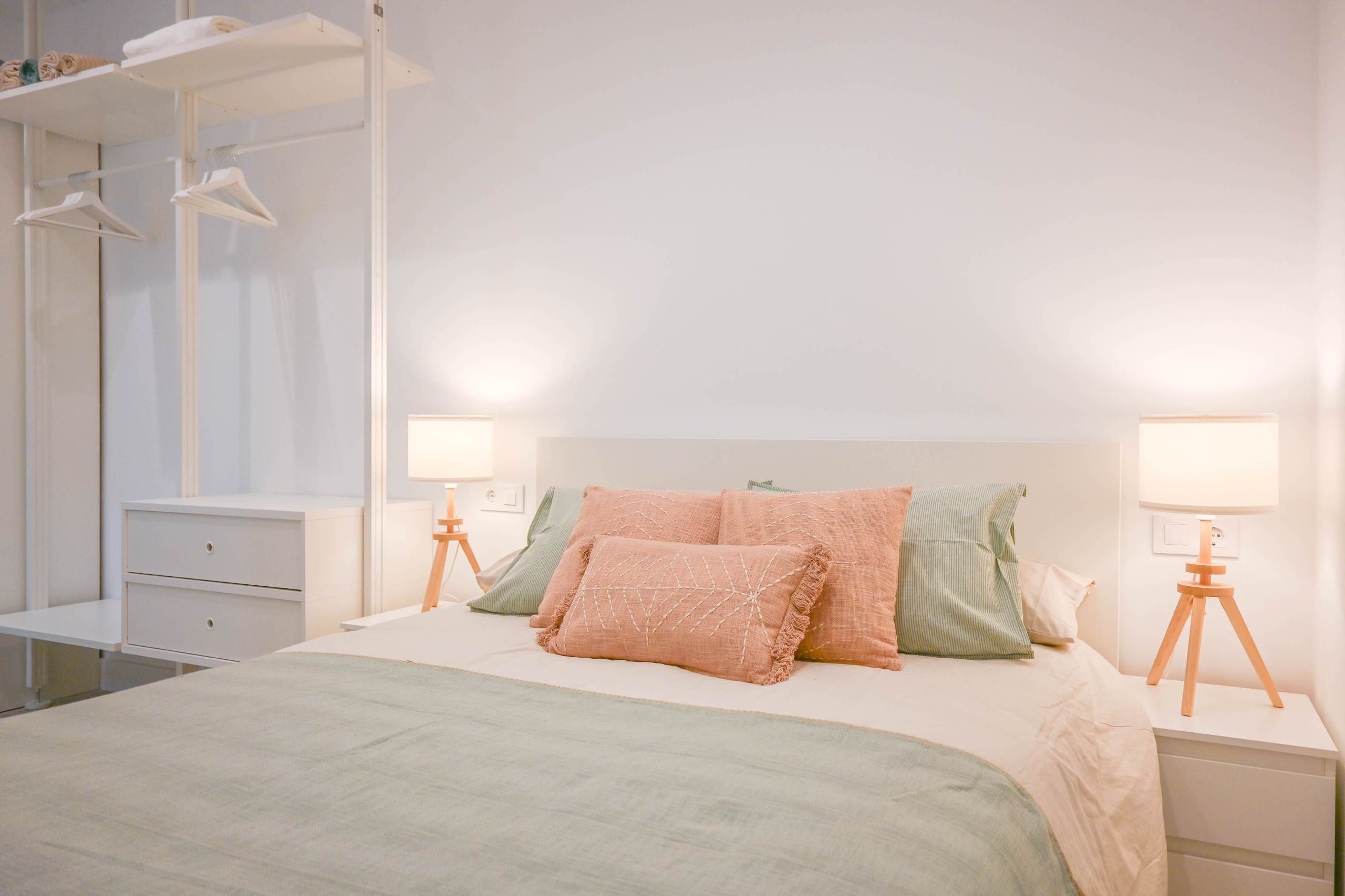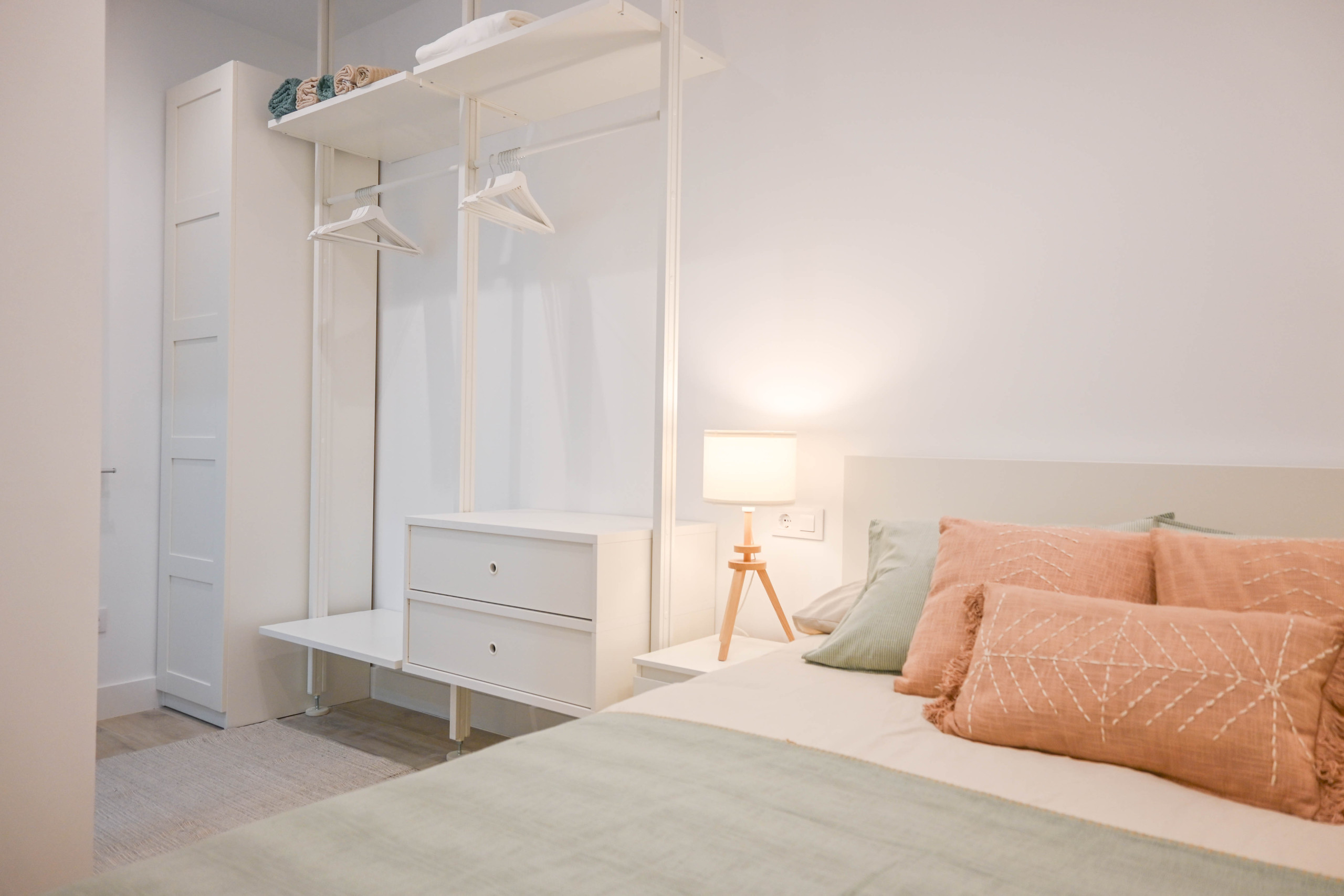 La habitación doble es amplia y cuenta con un vestidor integrado, lo que facilita el almacenamiento y organización de tus pertenencias durante tu estancia. El baño en suite, de diseño moderno, incluye un plato de ducha y acabados de calidad, ofreciendo un espacio cómodo y funcional.