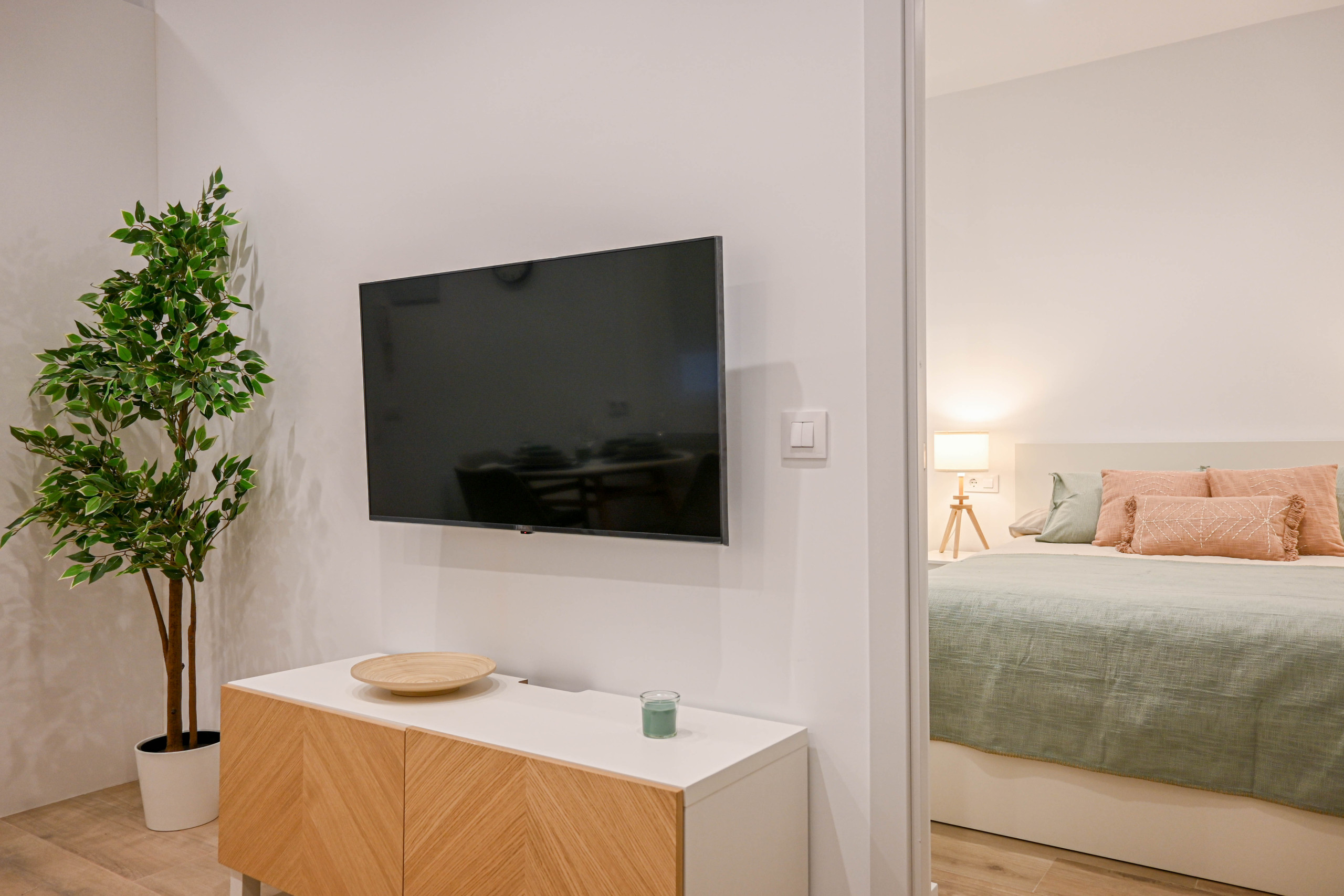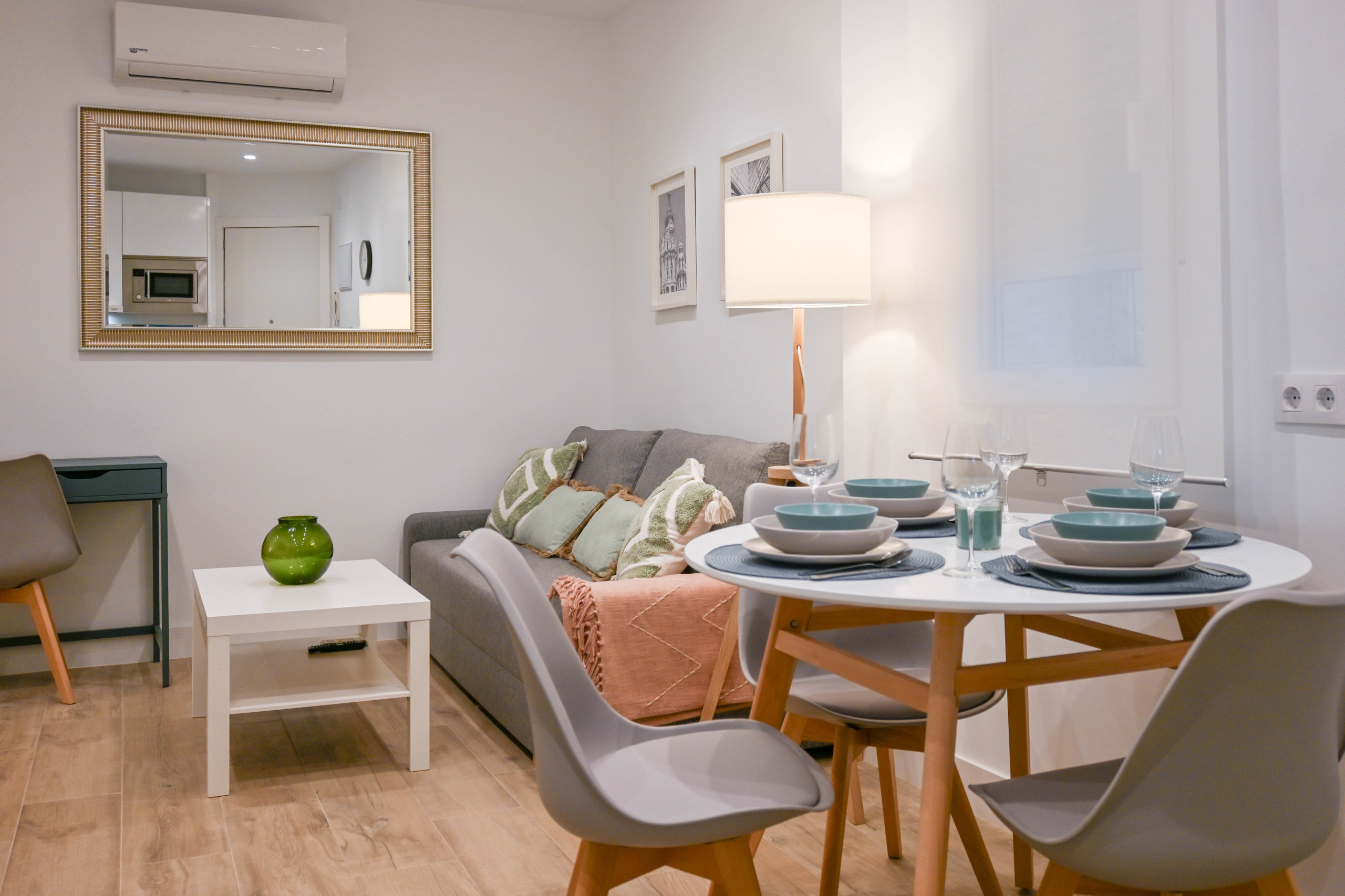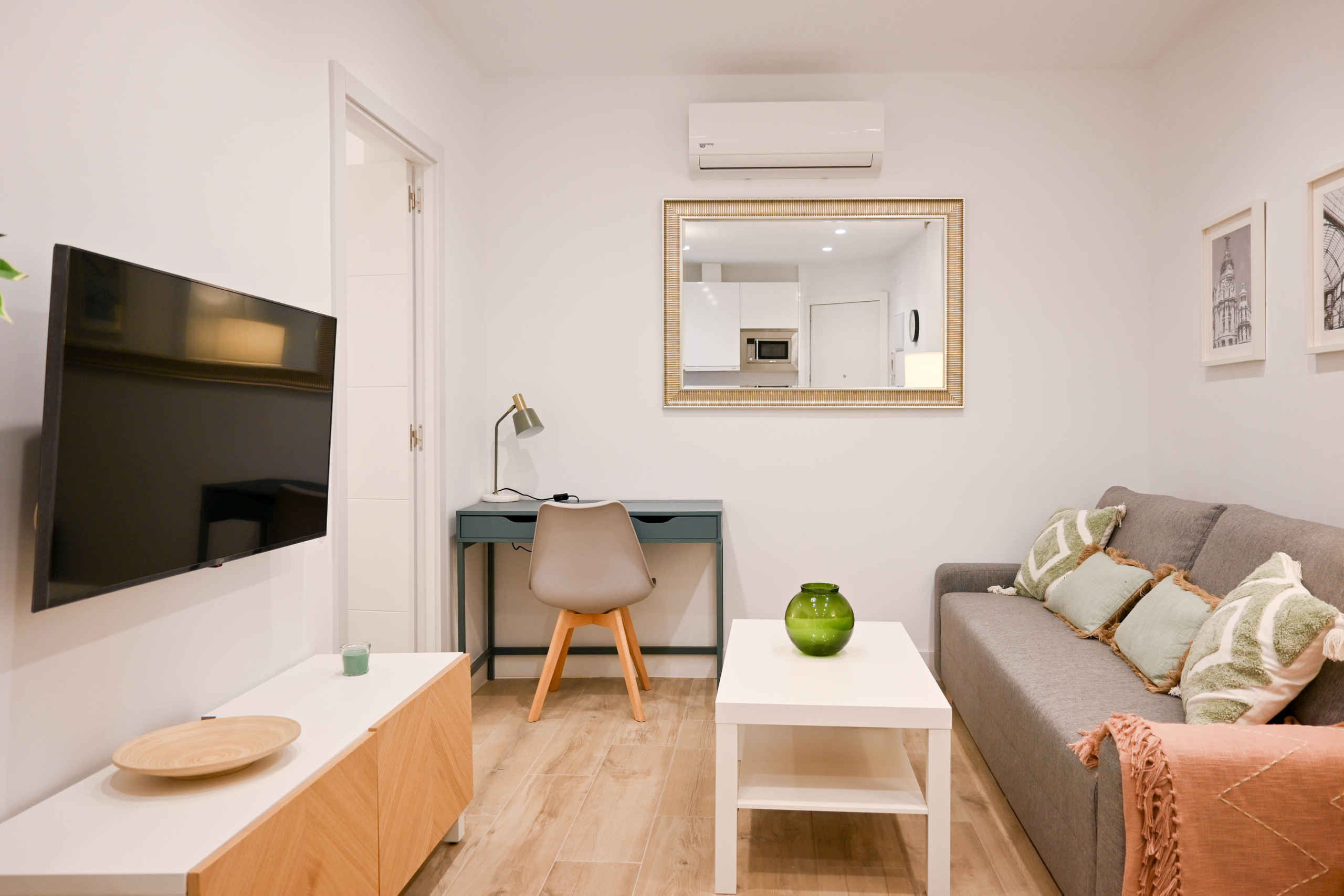 Al entrar, encontrarás un salón comedor luminoso y práctico, con una cocina de estilo americana integrada que está equipada con todo lo necesario para tu día a día. El salón, con un sofá cama diseñado para aprovechar el espacio al máximo, ofreciendo una mesa de comedor ideal para disfrutar de las comidas de manera cómoda.