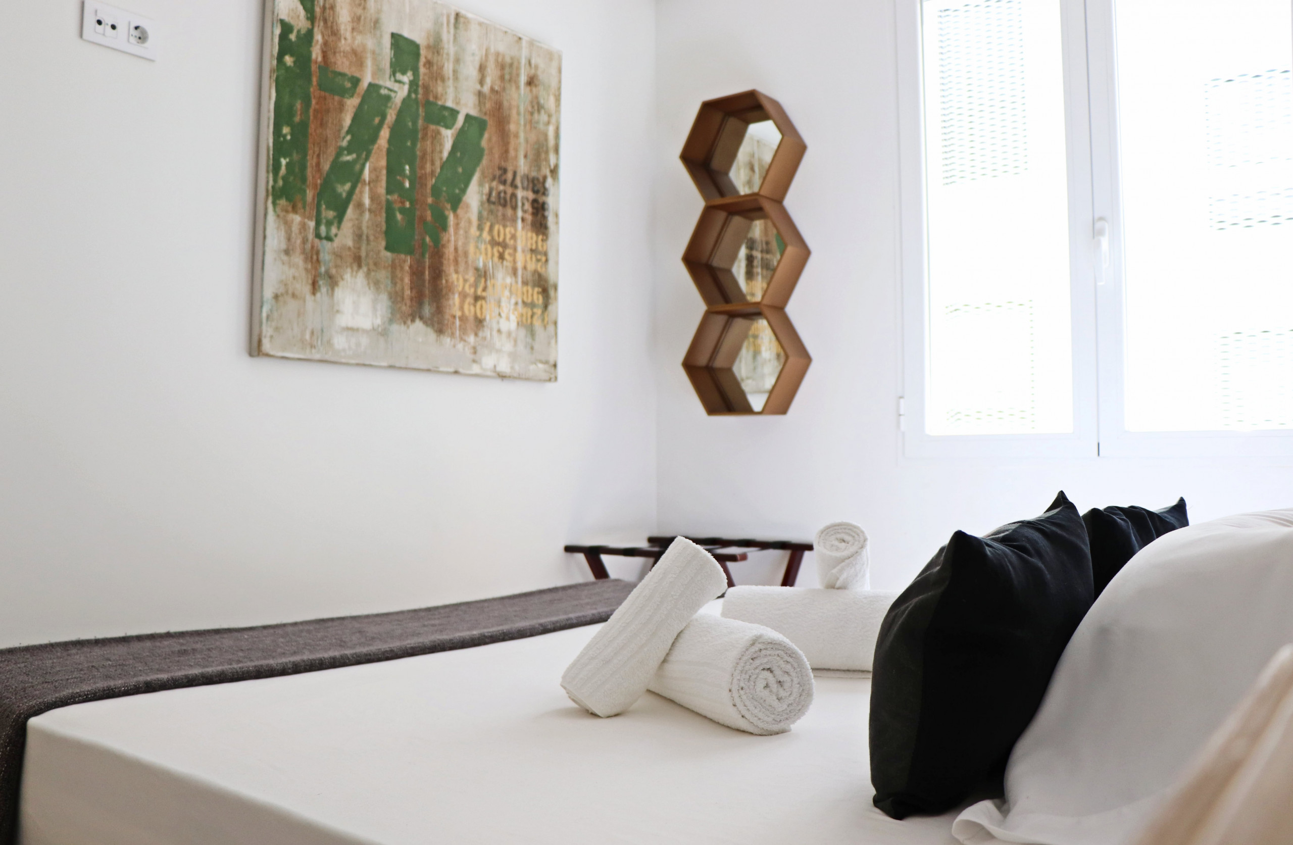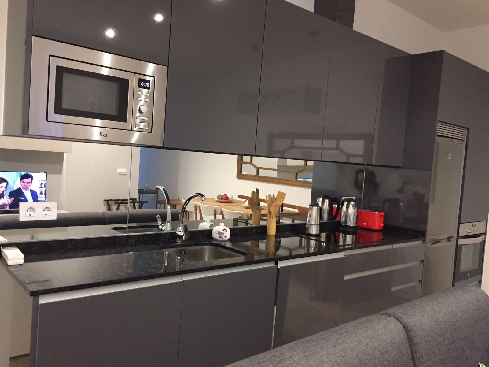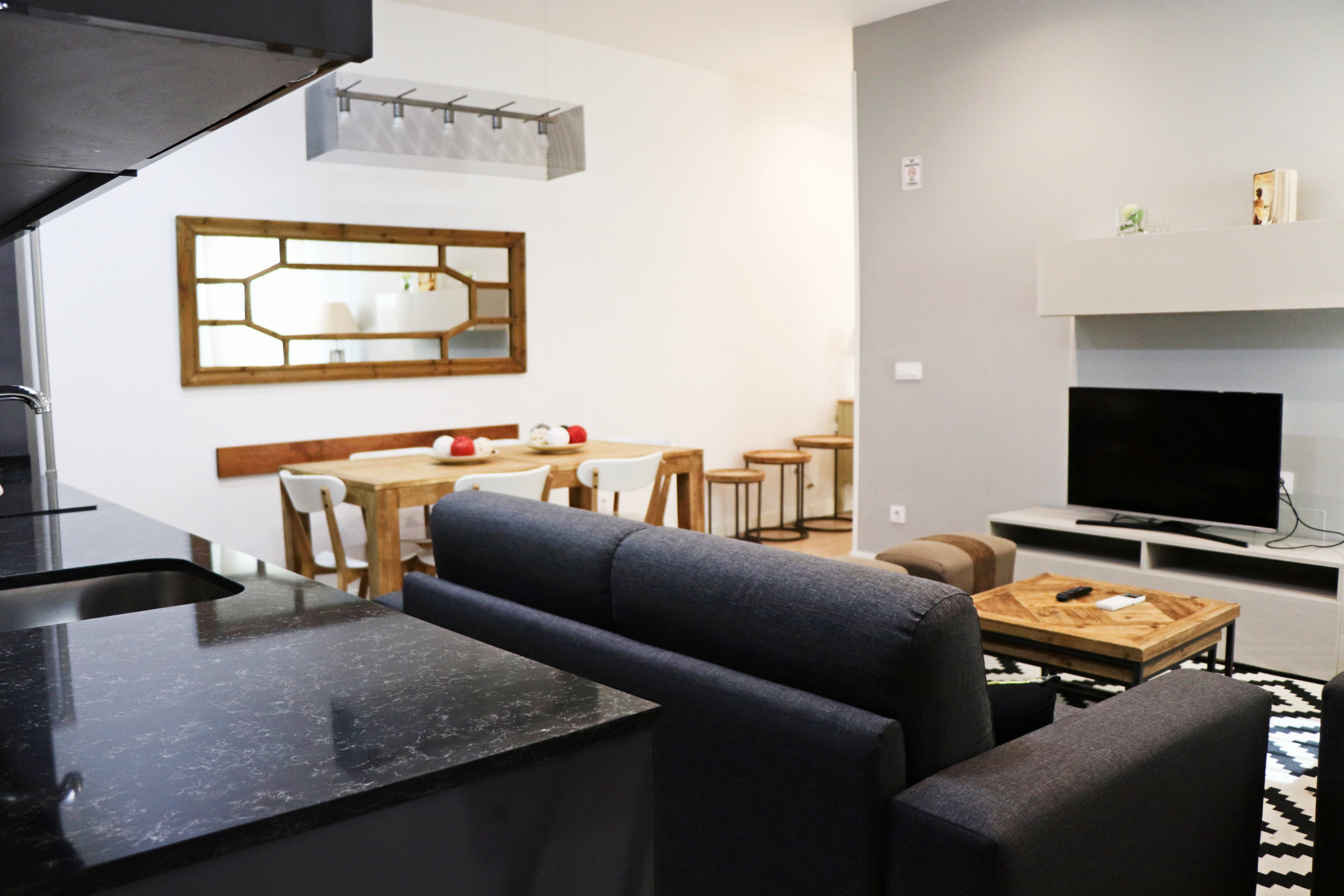 El piso consta de cocina integrada en el salón, dos baños con ducha, salón comedor y dos amplias habitaciones. Está recién reformado y amueblado con un estilo moderno y minimalista. Los electrodomésticos son de última generación y están perfectamente integrados en el diseño. Las habitaciones son amplias y luminosas, con doble acristalamiento y dan a un patio interior, por lo que son muy silenciosas. Las camas son de 150cm.