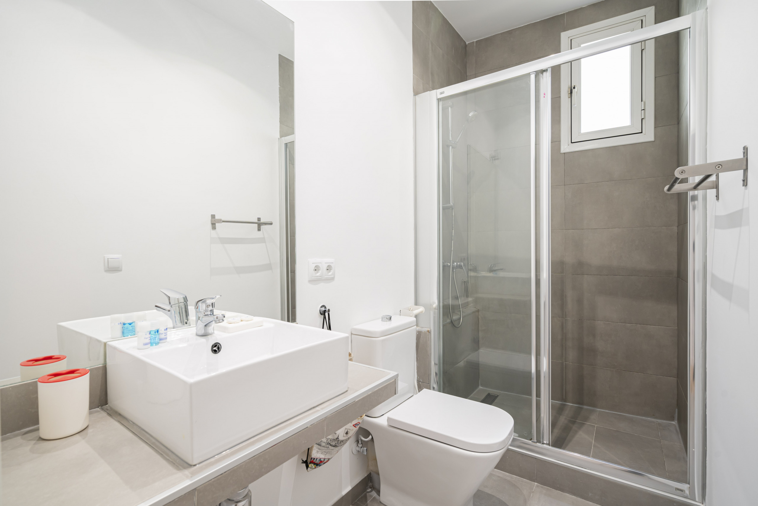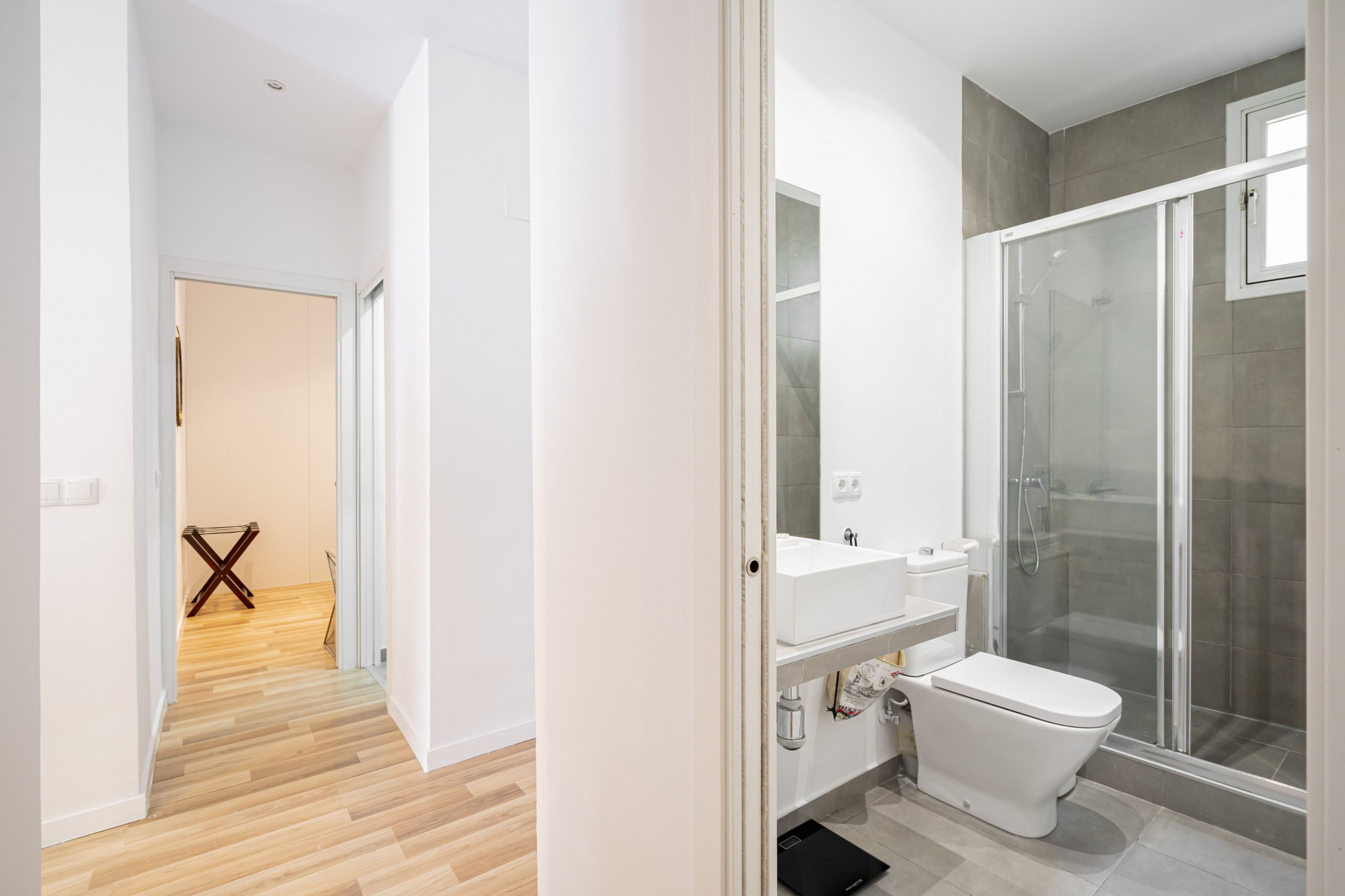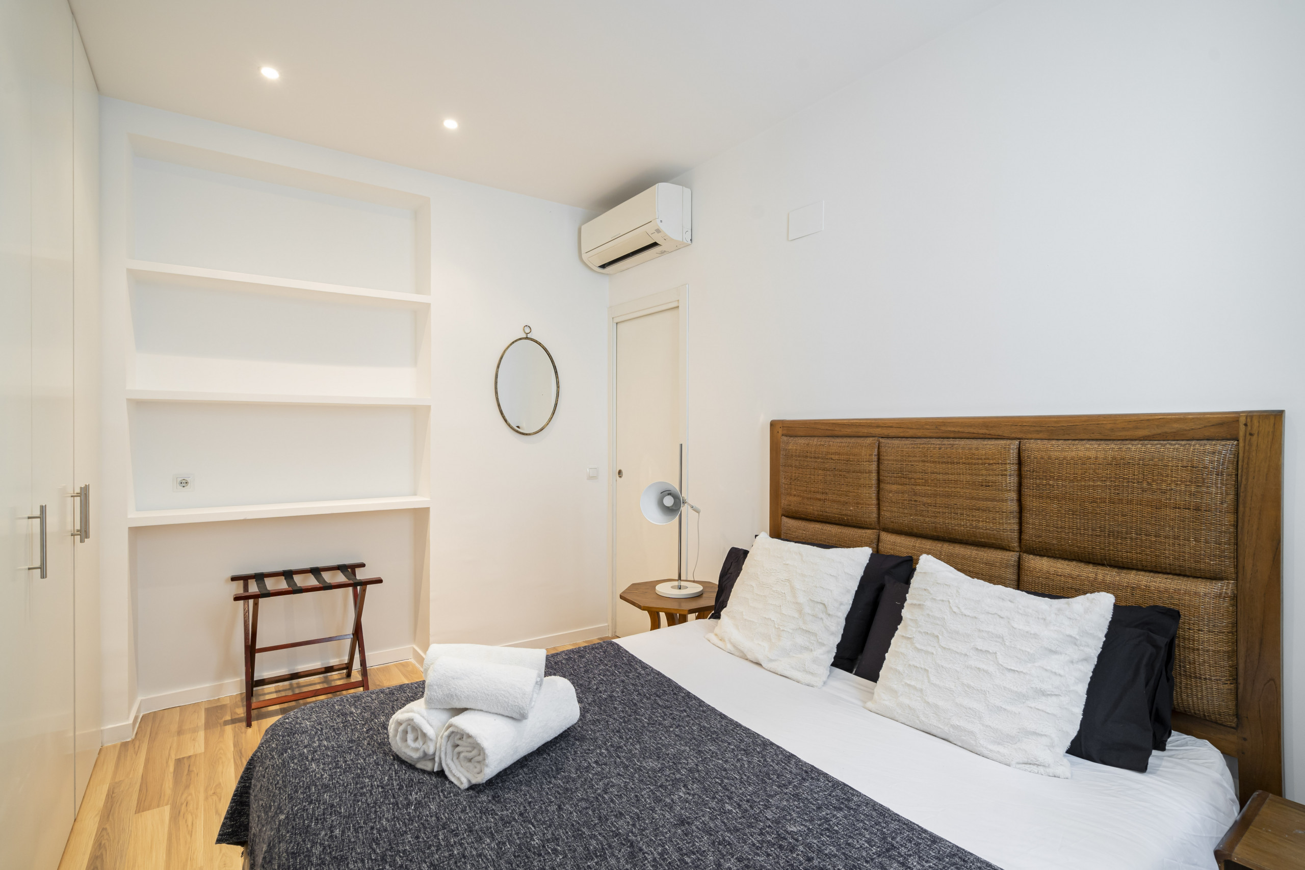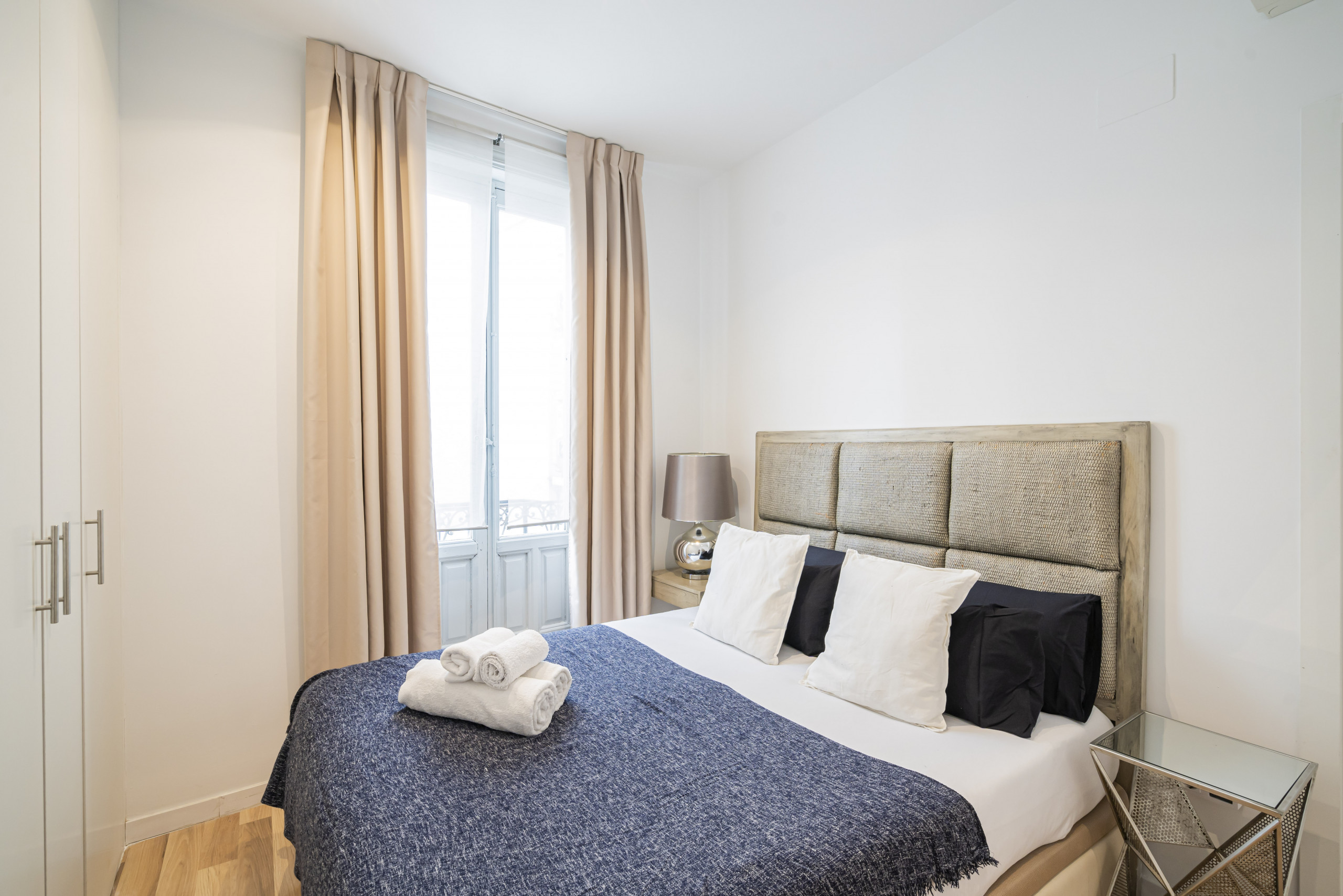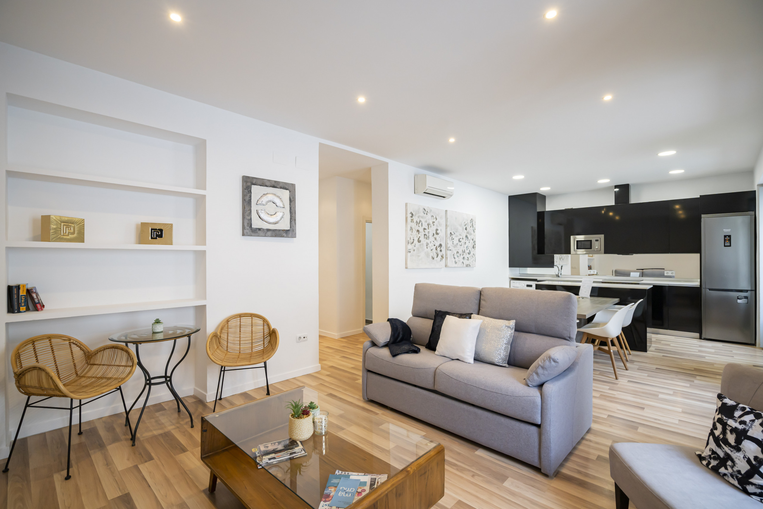 El piso consta de cocina integrada en el salón, dos baños con ducha, salón comedor y dos amplias habitaciones. Está recién reformado y amueblado con un estilo moderno y minimalista. Los electrodomésticos son de última generación y están perfectamente integrados en el diseño. Las habitaciones son amplias y luminosas, con doble acristalamiento y dan a un patio interior, por lo que son muy silenciosas. Las camas son de 150cm