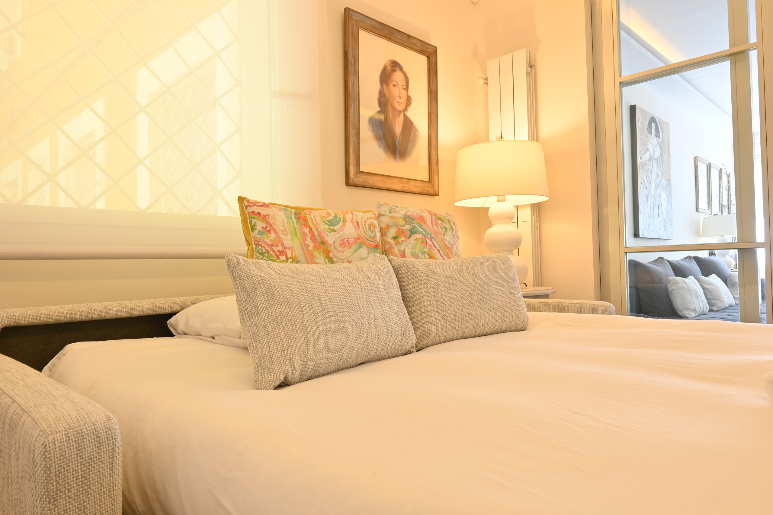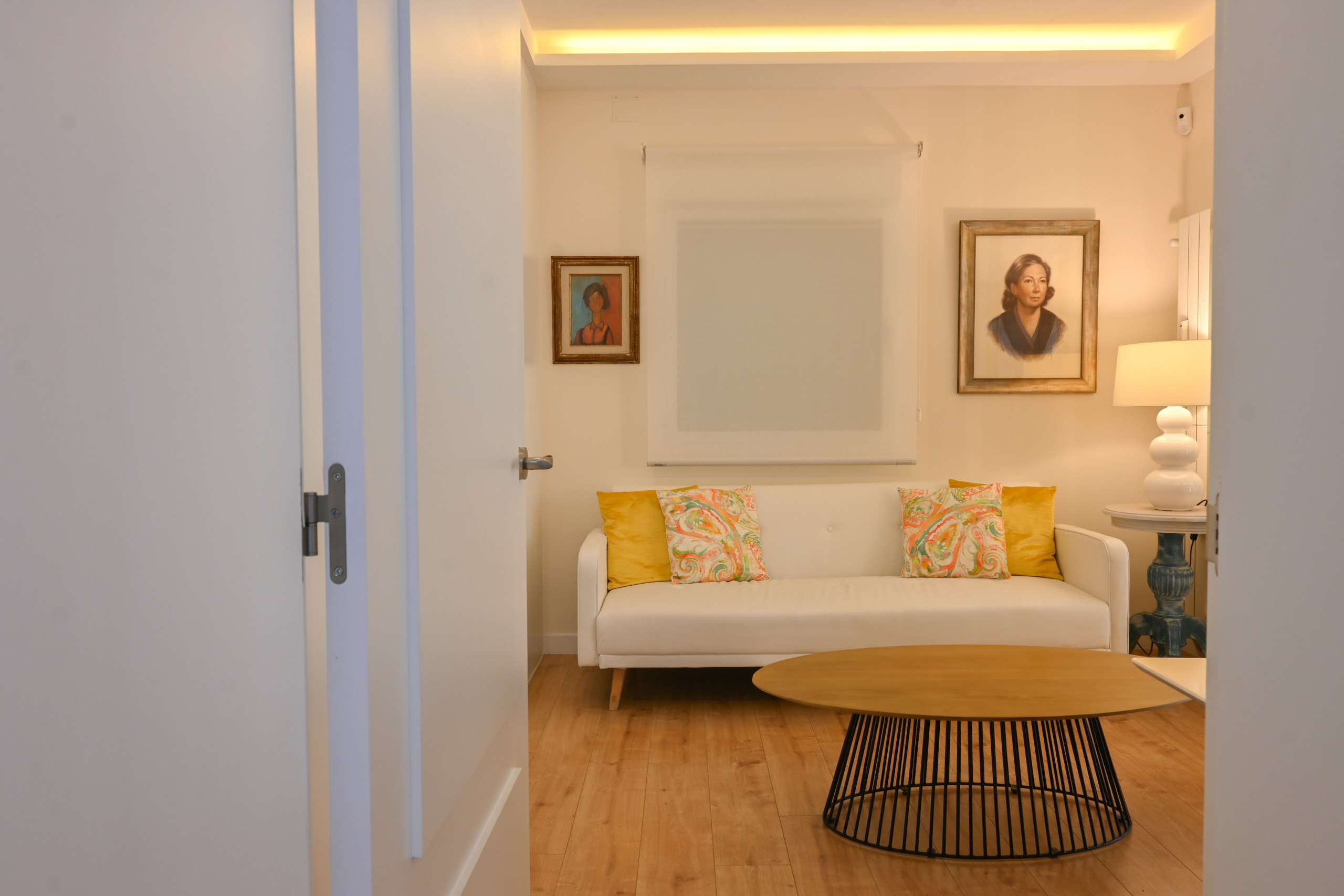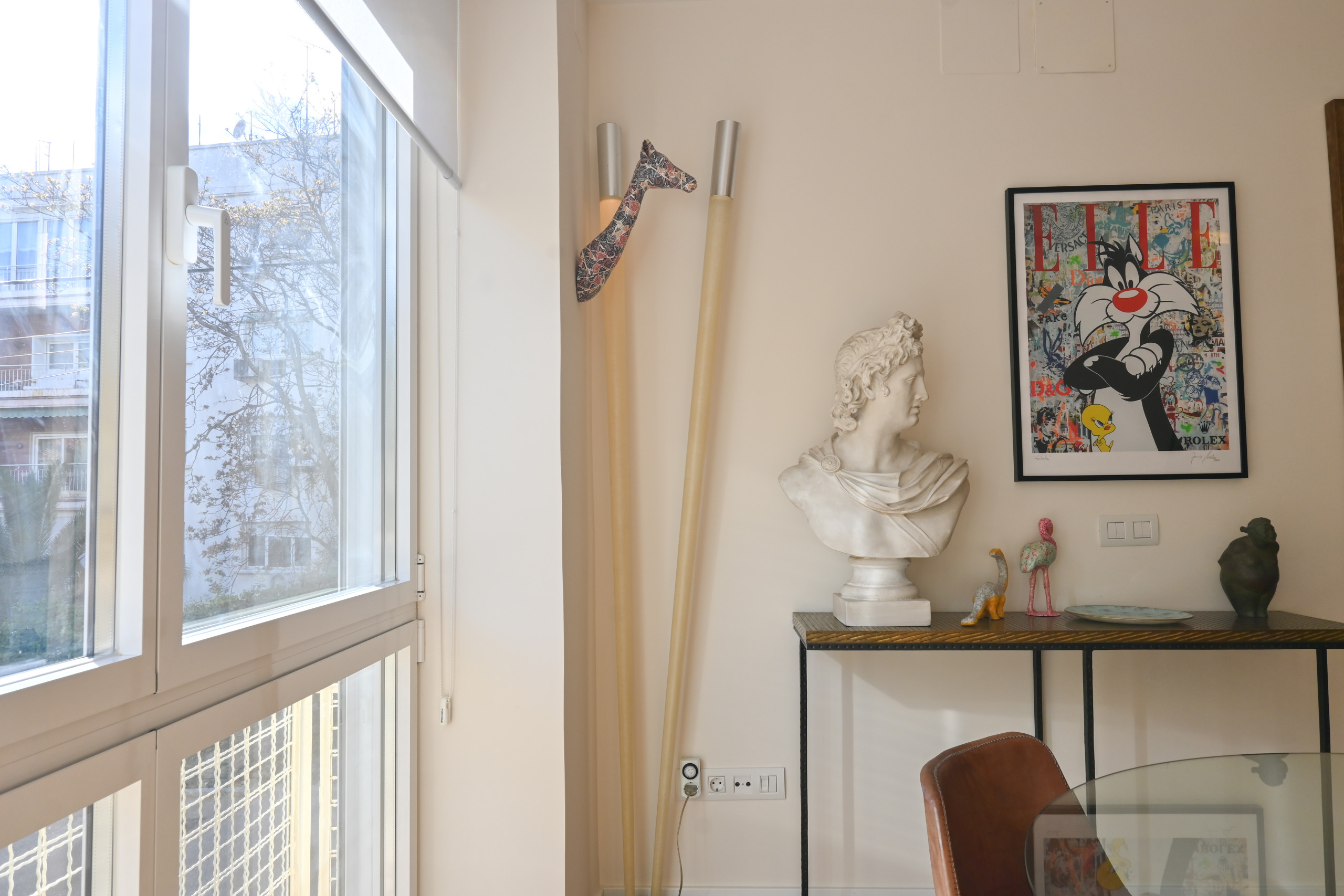 El salón espacioso y luminoso es perfecto para relajarse después de un día explorando la ciudad, rodeado de detalles decorativos únicos que crean un ambiente cálido y sofisticado. Anexo al salón encontrarás un elegante espacio de trabajo, perfecto para sacarle el máximo partido a tu productividad.