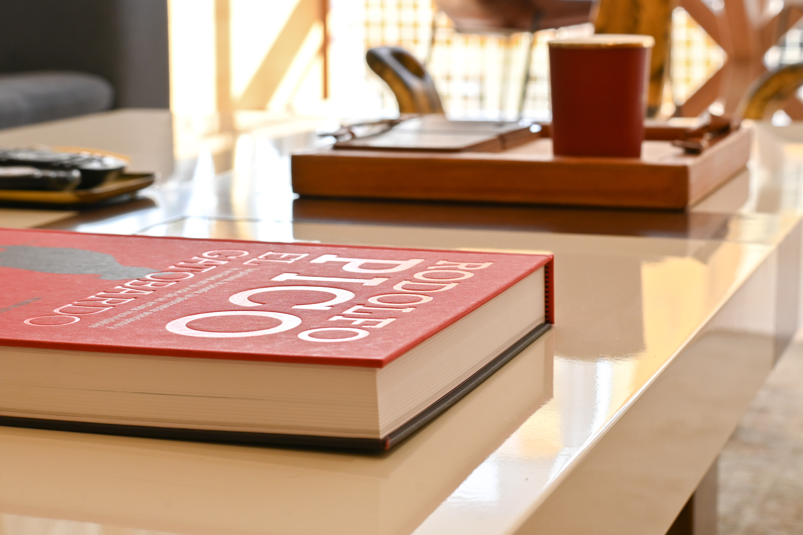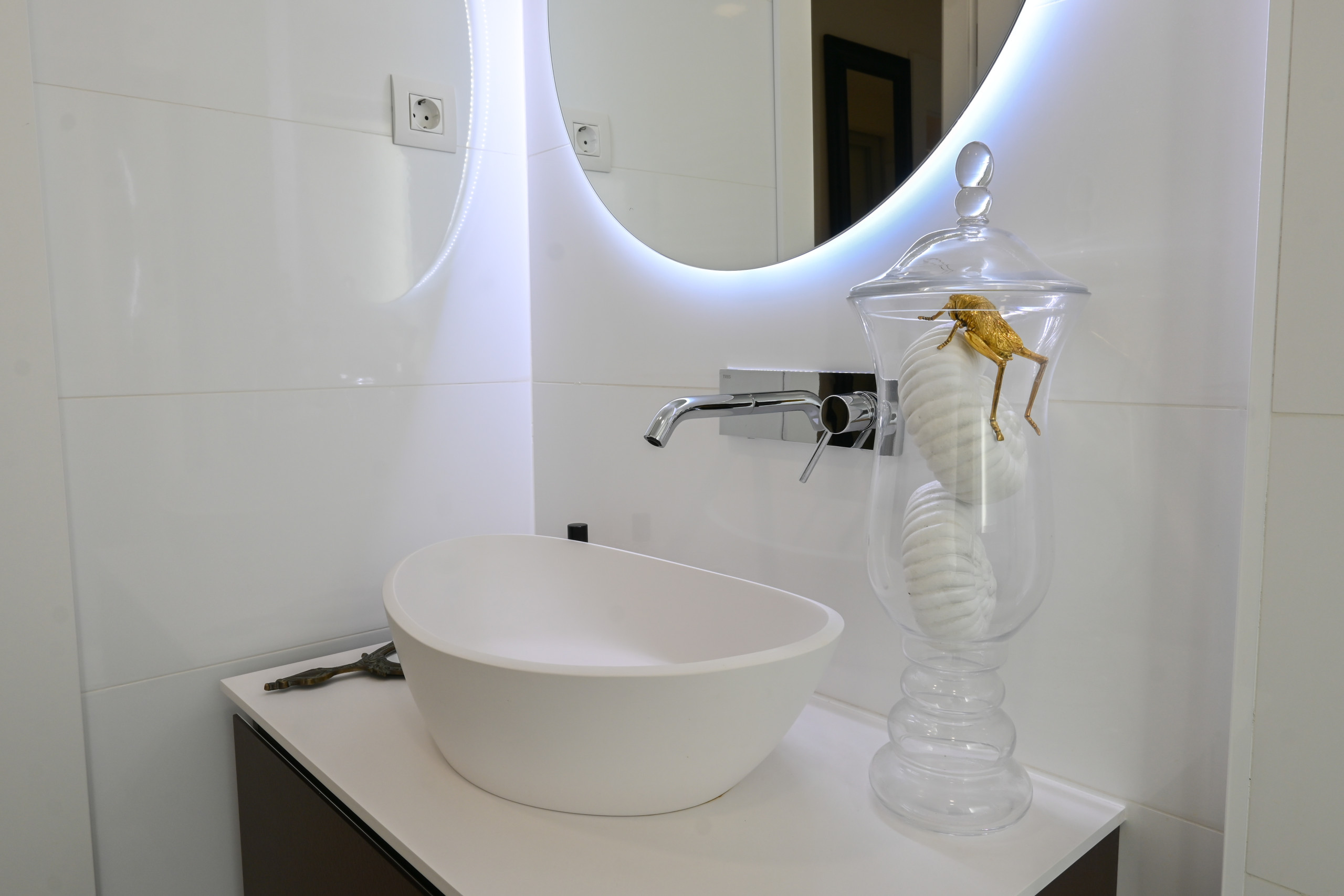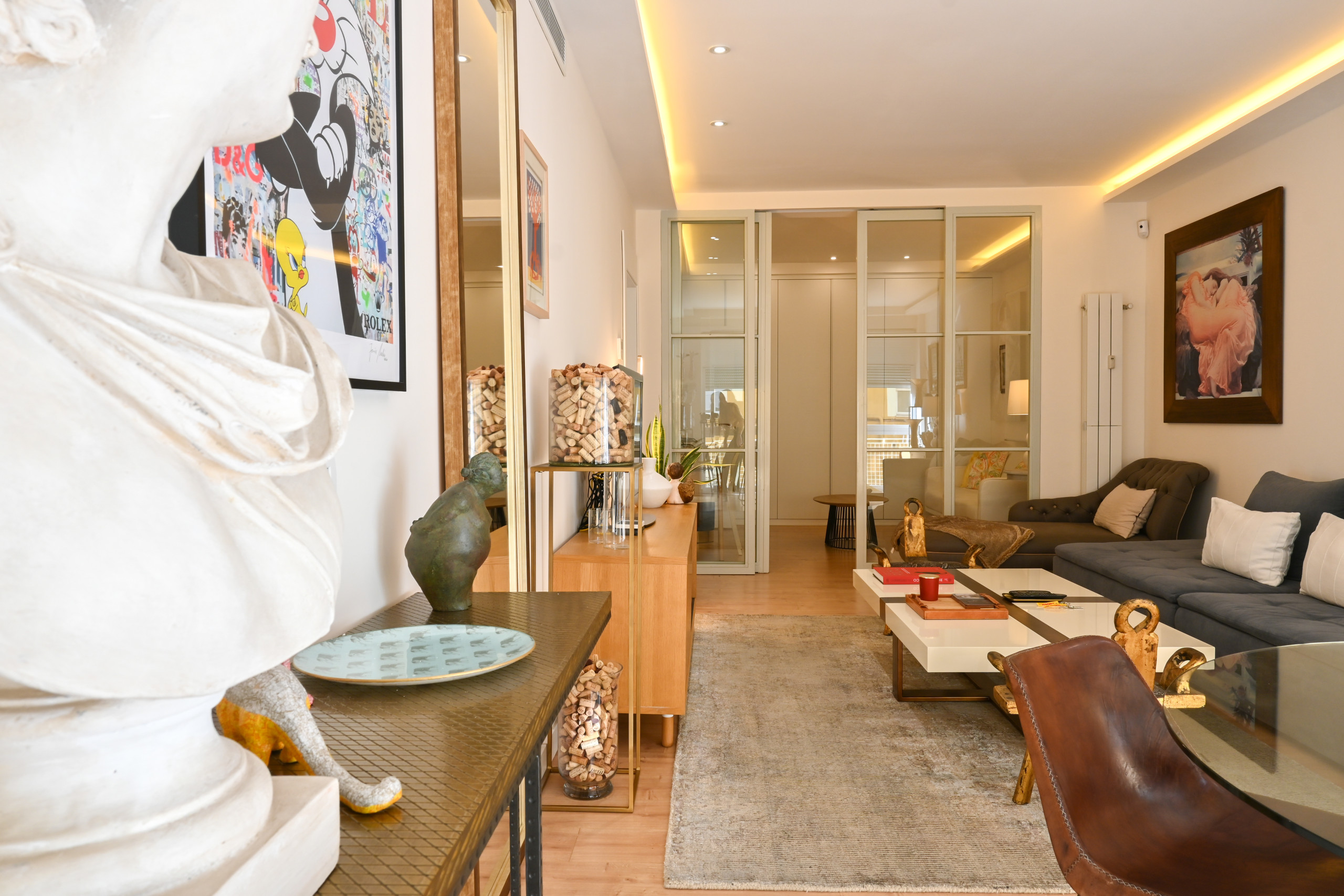 El salón espacioso y luminoso es perfecto para relajarse después de un día explorando la ciudad, rodeado de detalles decorativos únicos que crean un ambiente cálido y sofisticado. Anexo al salón encontrarás un elegante espacio de trabajo, perfecto para sacarle el máximo partido a tu productividad.