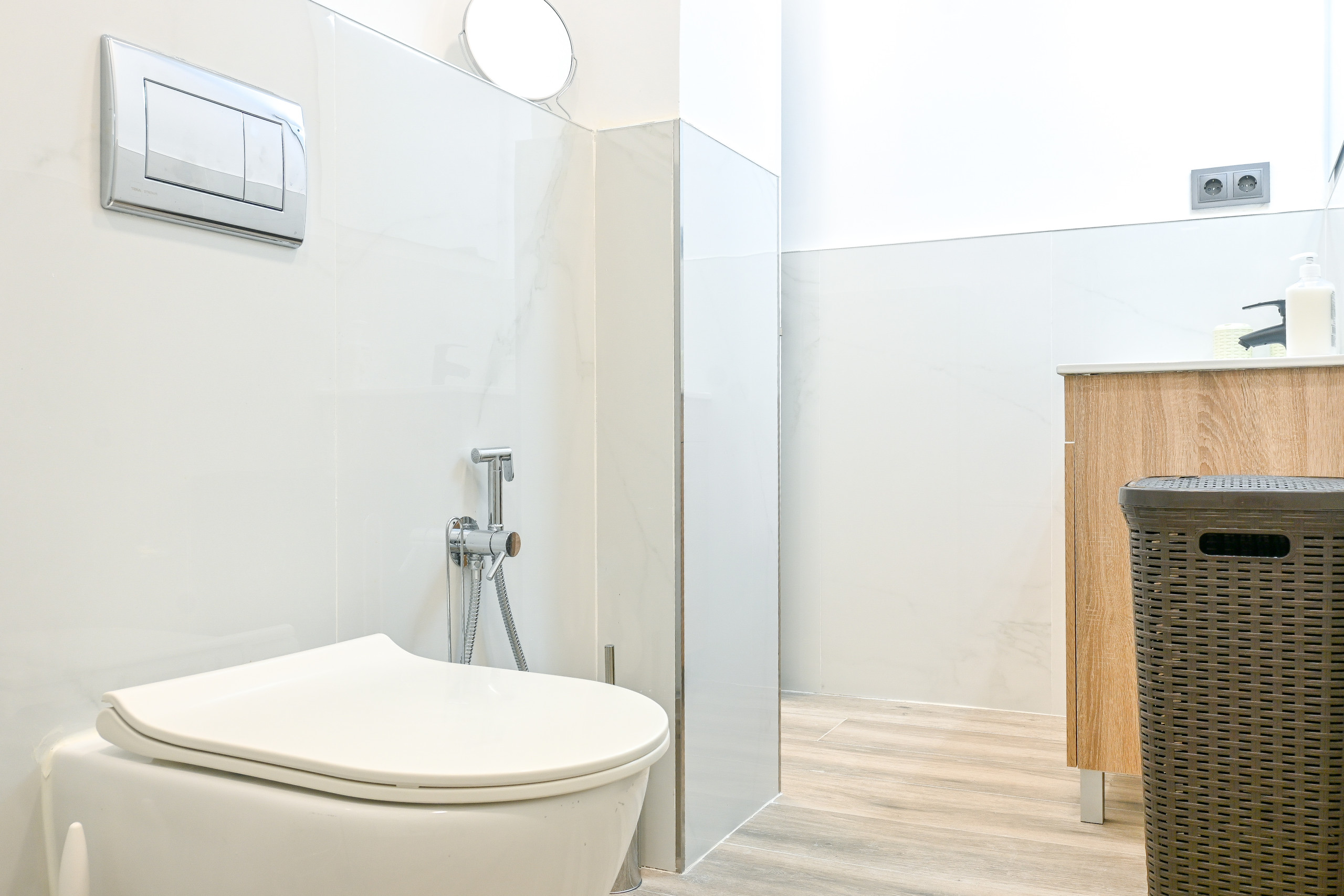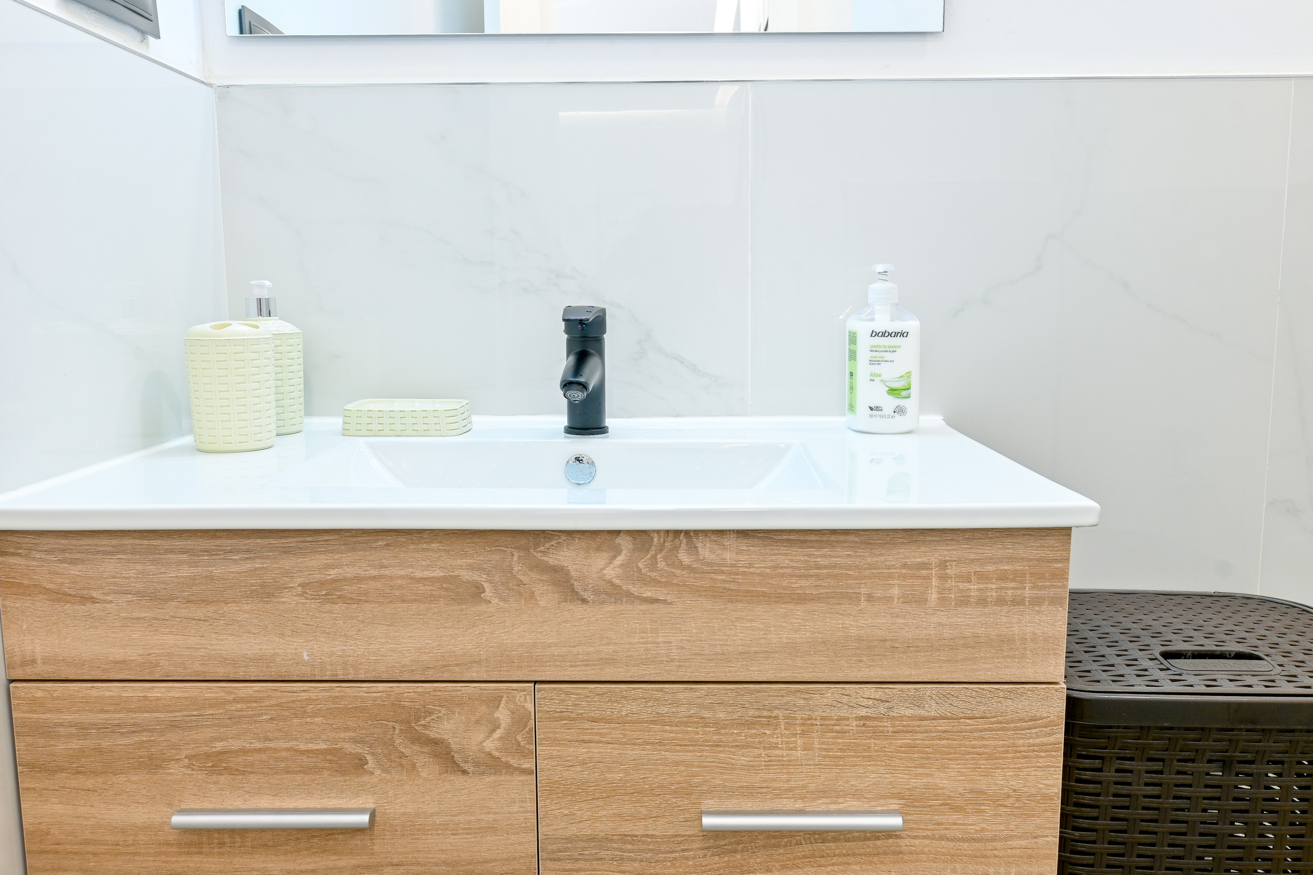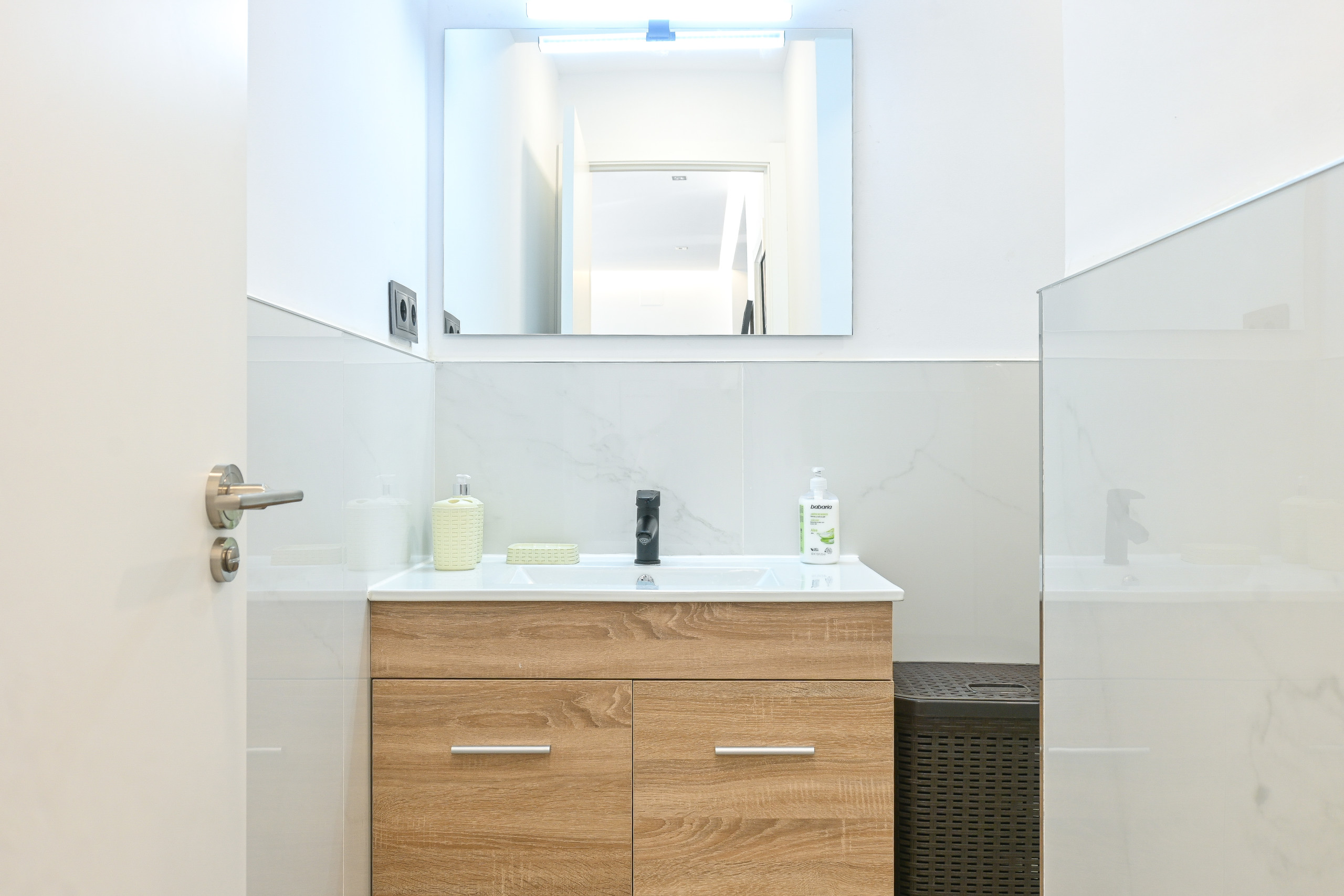 El baño, moderno y funcional, cuenta con un plato de ducha. La disposición del baño asegura fácil acceso desde cualquier parte del apartamento, haciendo que tu estancia sea aún más cómoda y relajante.