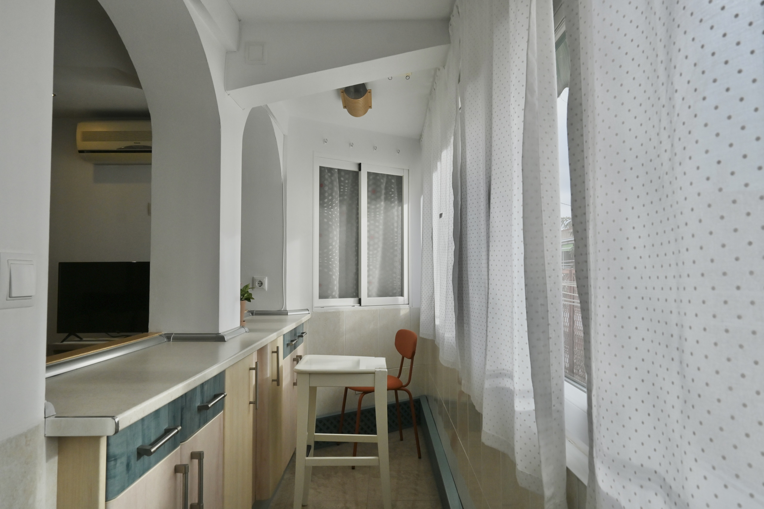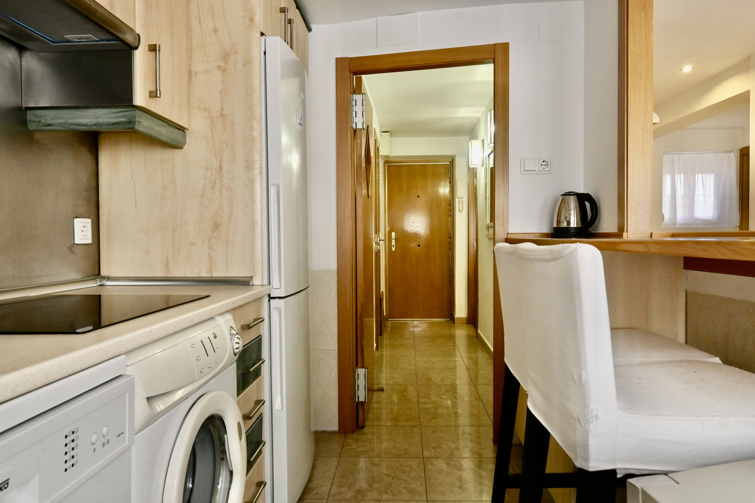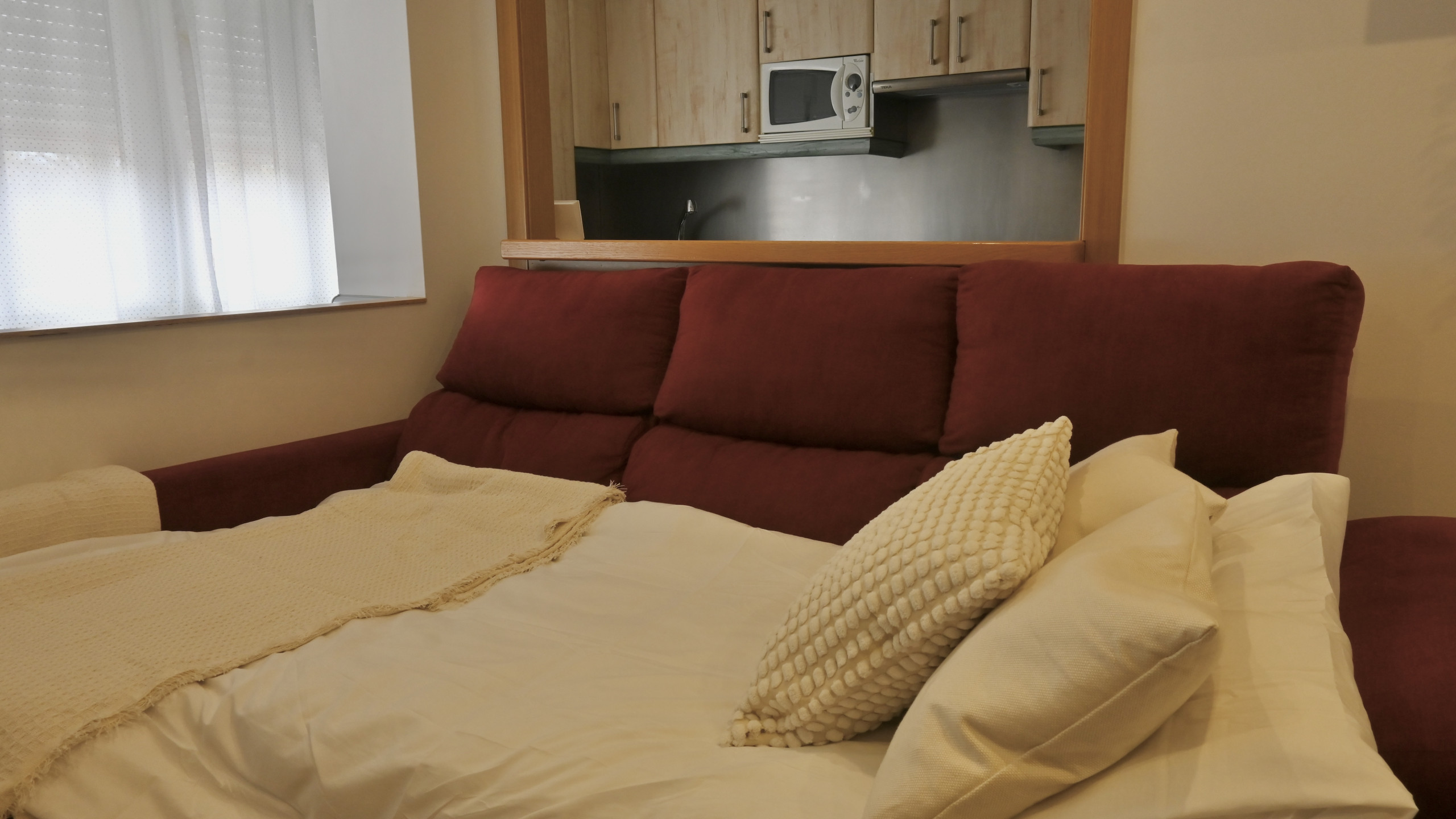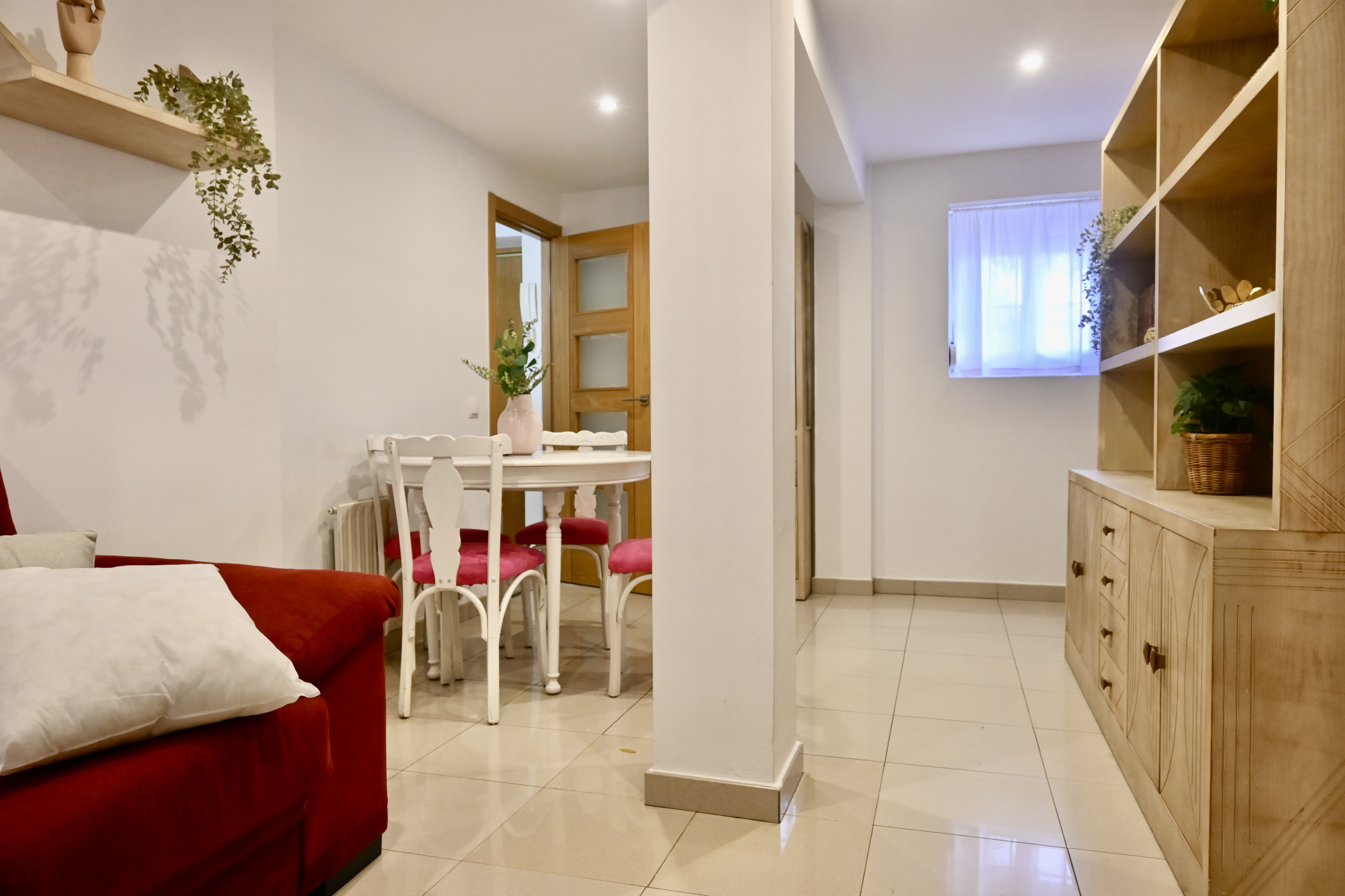 Al ingresar a la vivienda, te encuentras con un luminoso salón decorado con un cómodo sofá cama. Este espacio versátil es perfecto para relajarse o recibir visitas. La mesa de comedor con cuatro sillas, estratégicamente ubicada en el área del salón, ofrece un lugar acogedor para disfrutar de comidas en familia o realizar trabajos desde casa.